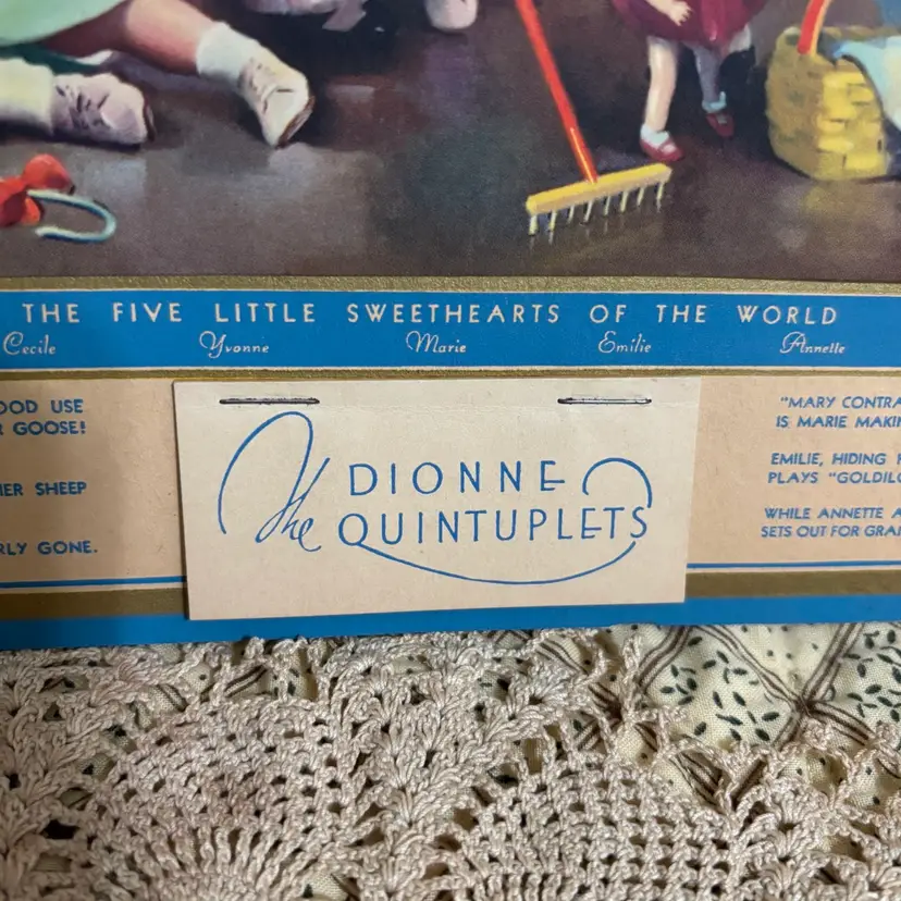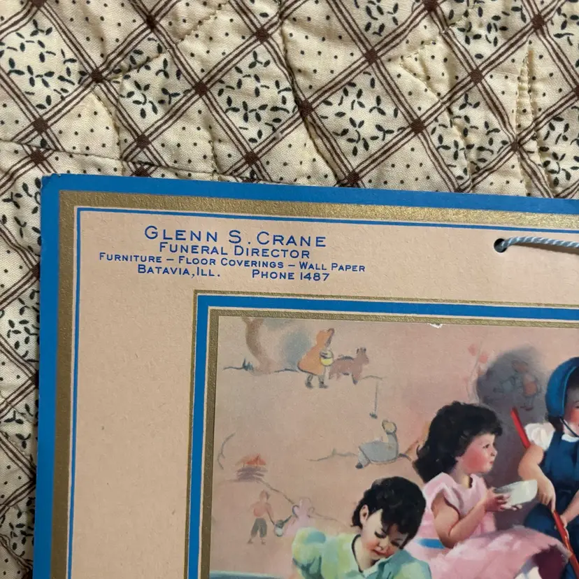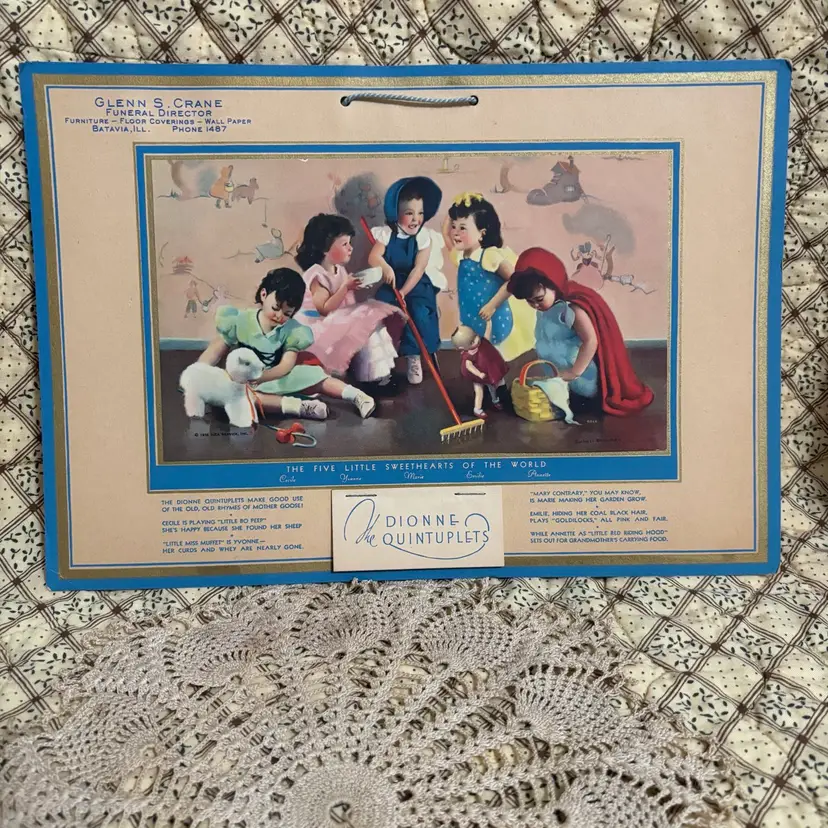 1938 “The Five Little Sweethearts of the World” Dionne Quintuplets advertising calendar. Glenn S. Crane Funeral Director Batavia ILL. No rips or tears. Usual age discoloration on back. 11.5” X 8”.