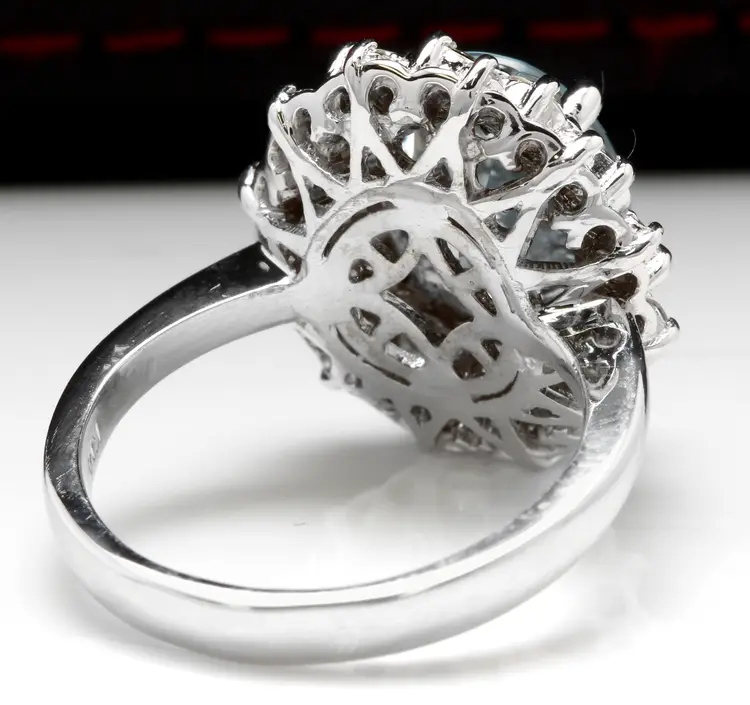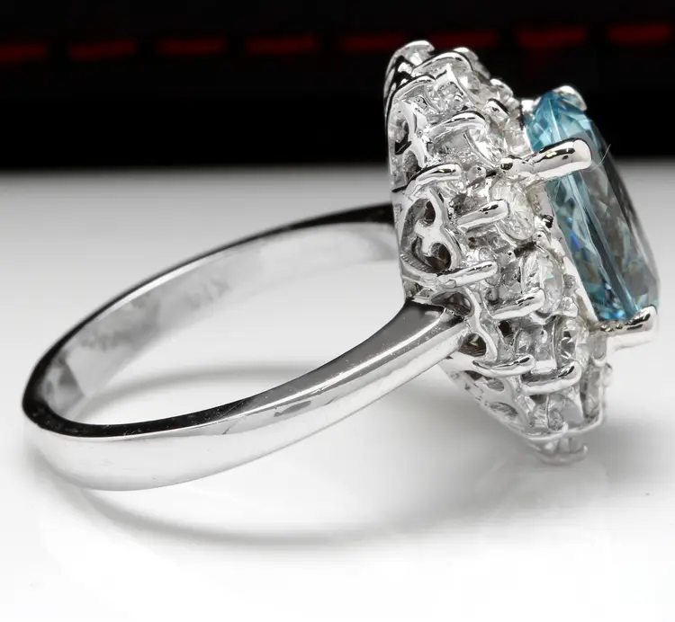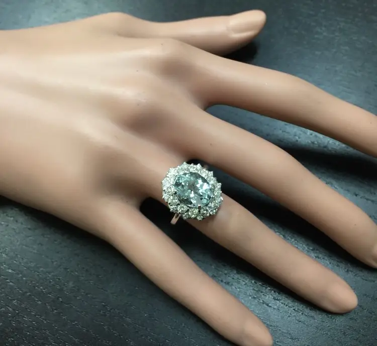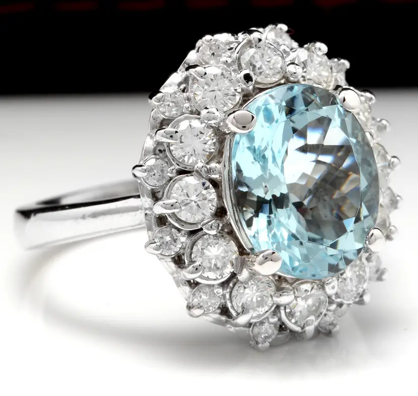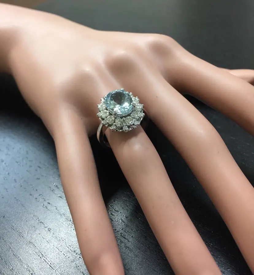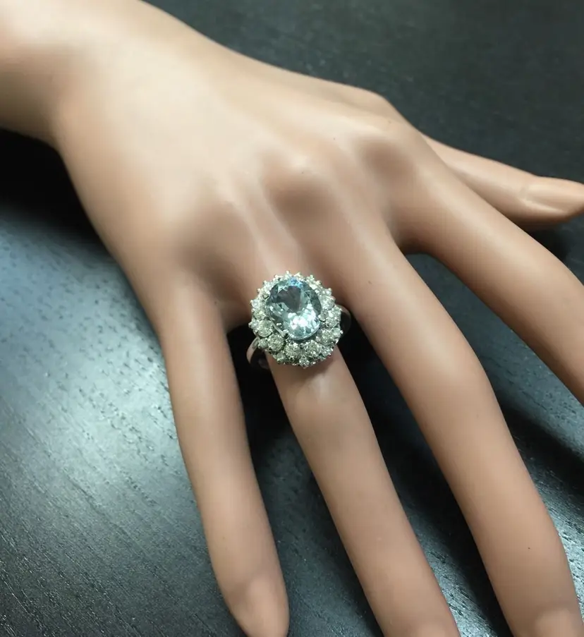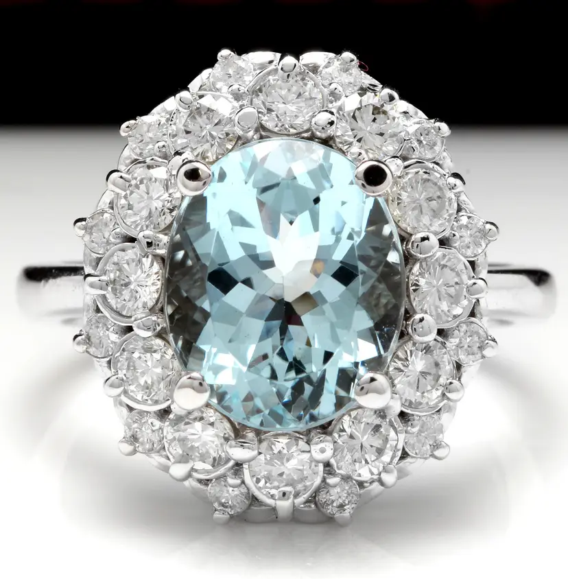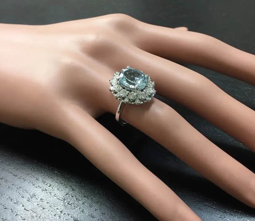 Main Stone Color: Blue Main Stone Treatment: Heating Metal Purity: 14k solid gold Main Stone: Aquamarine Sizable: Yes Main Stone Creation: Natural Metal: White Gold Ring Size: 6.25 Total Carat Weight (TCW): 4.30 Main Stone Shape: Oval Type: Ring Material: Gemstone Brand: Unbranded