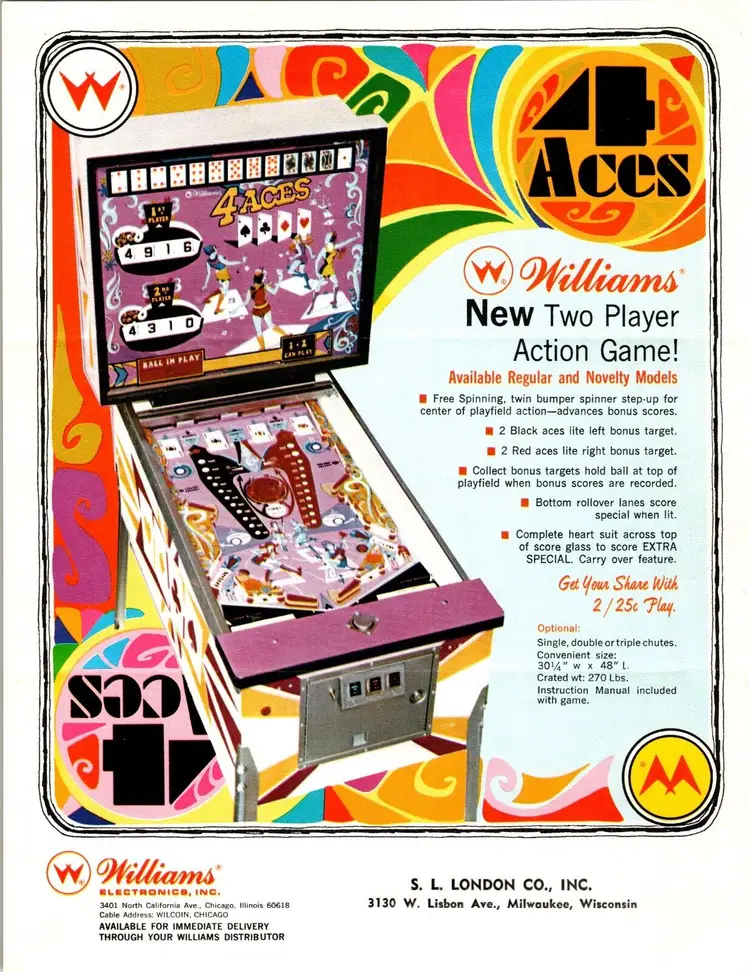 Brand: Williams Year: 1970 Model: 4 Aces Theme: Playing Cards Country/Region of Manufacture: United States Modified Item: No Pinball: Flyer