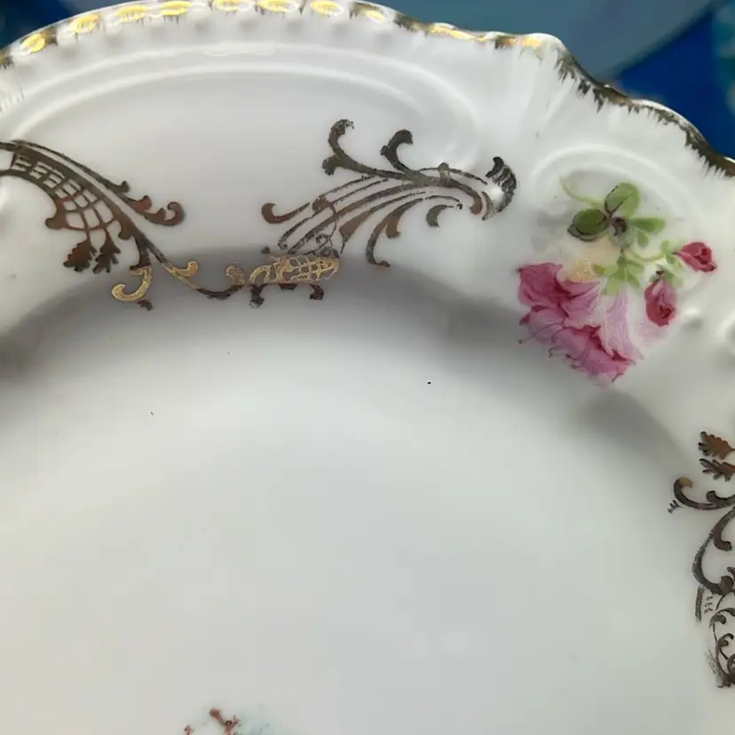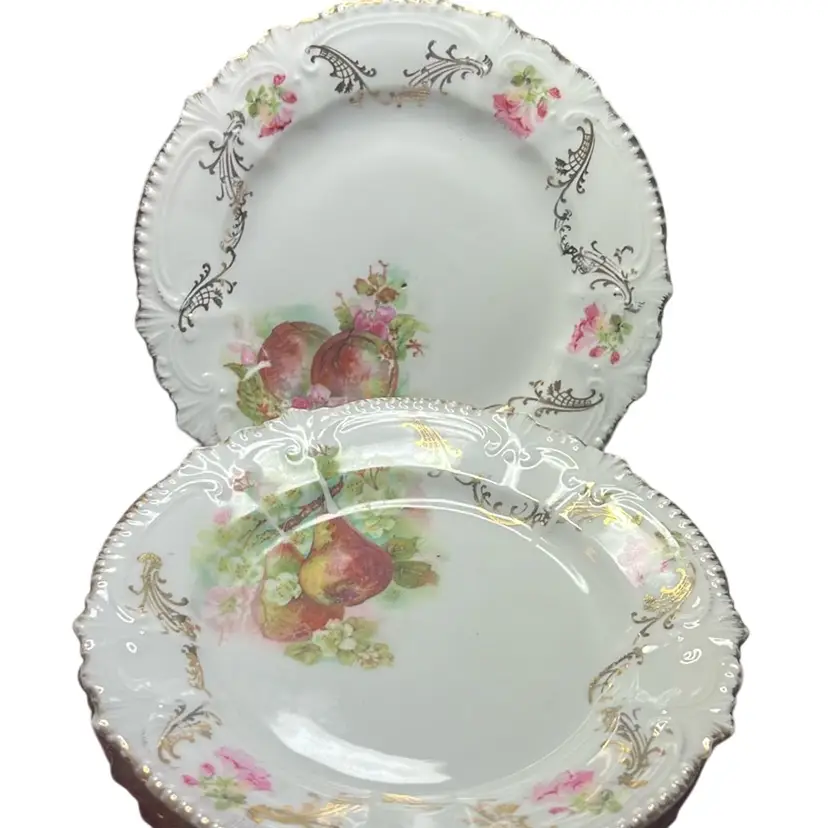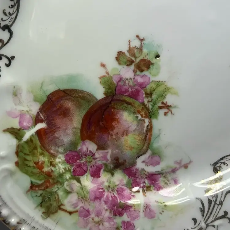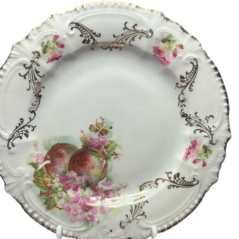 Retails for $30.00 per plate and up - Beautiful hand painted luncheon plates with fruit & flowers. These date from 1895 - 1910. Plate has scalloped edges and gold accents with black scrollwork. They are considered unique. One plate has some crazing, the 3 others do not. They measure 7 1/4” x 7. 1/4”