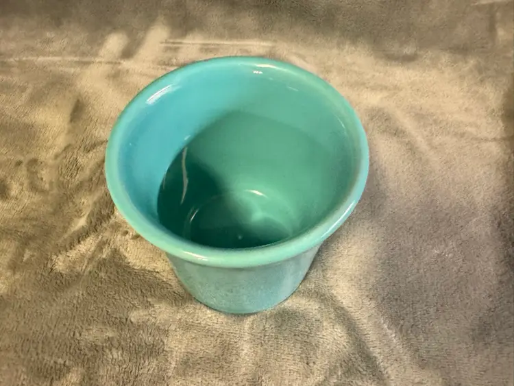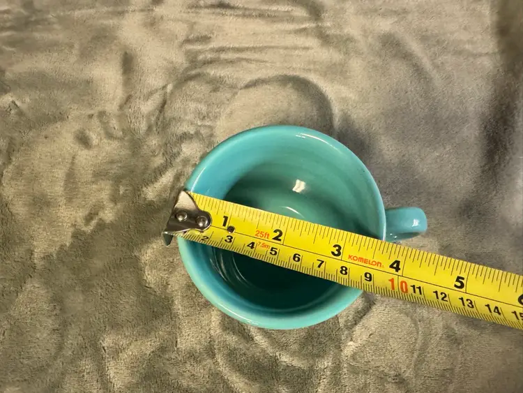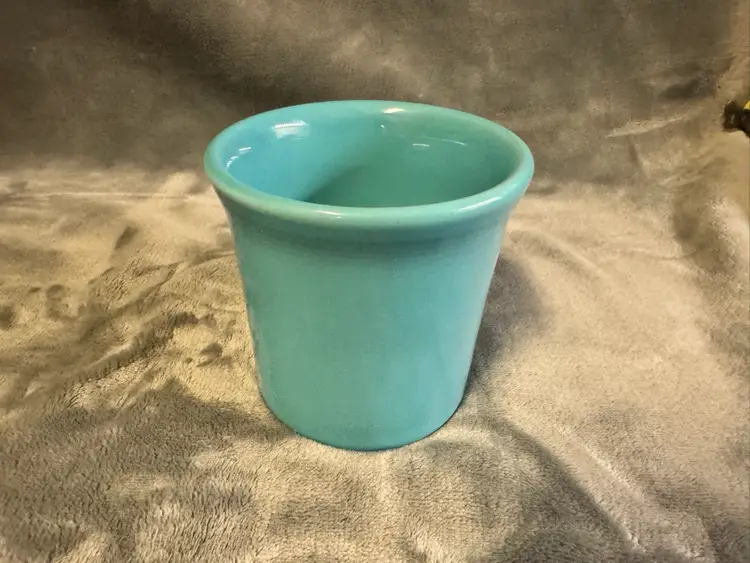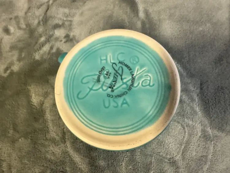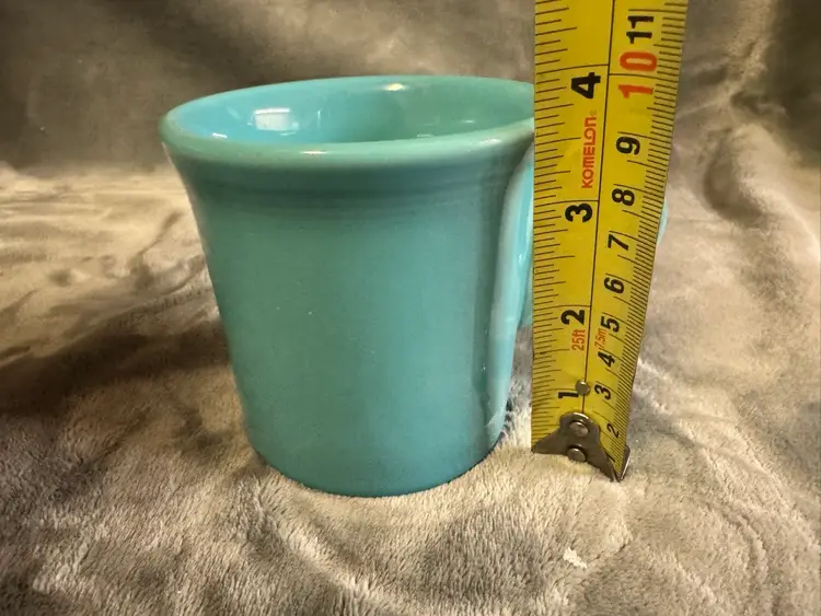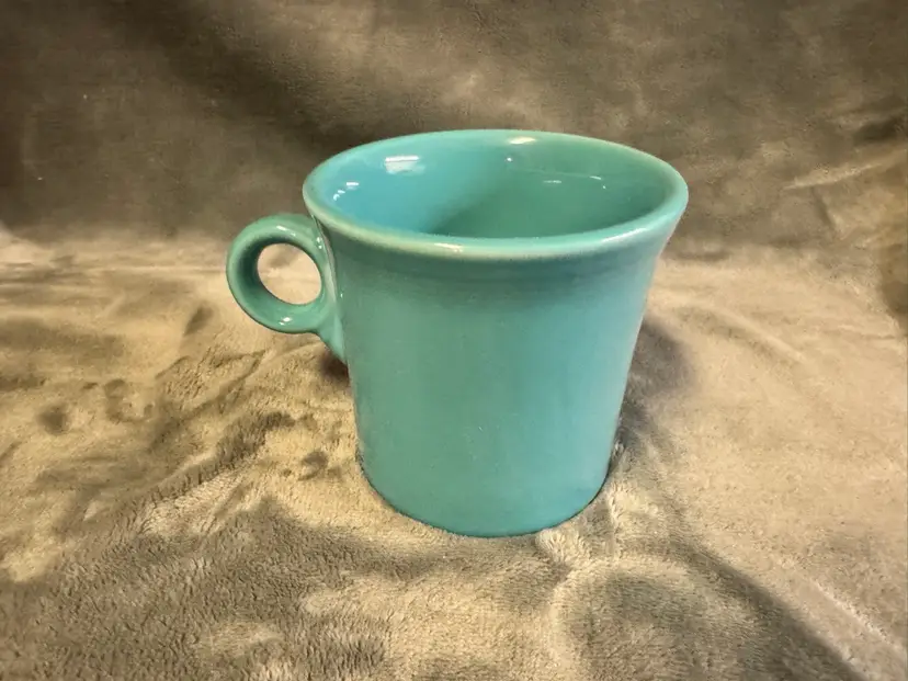 4 available for individual purchase. The product is a Fiesta Fiestaware teal blue/green Coffee Mug Cup made by Homer Laughlin in the United States. This round ceramic mug features a glossy finish and an O handle for ease of use. With a diameter of 3.5 inches and a height of 3.5 inches, it is suitable for all occasions and can be enjoyed by unisex adults. This original piece of American-themed pottery showcases the art pottery production style and technique, making it a unique addition to any collection. Excellent condition. No chips, cracks, scratches, crazing, or staining.