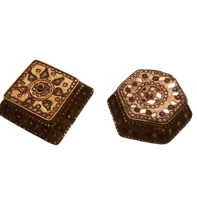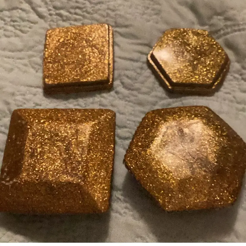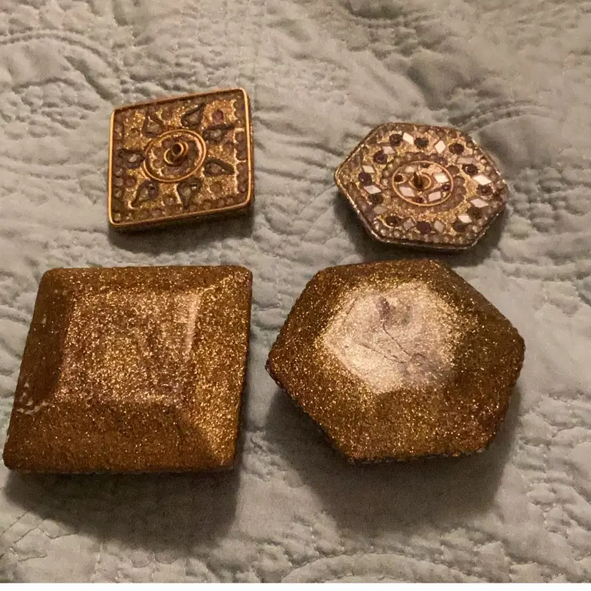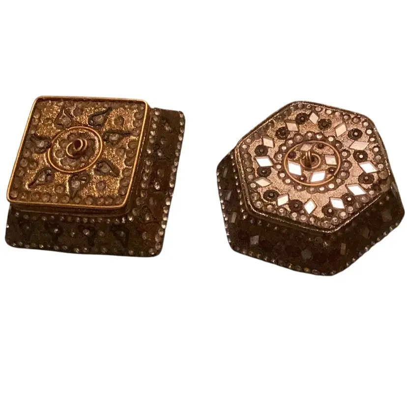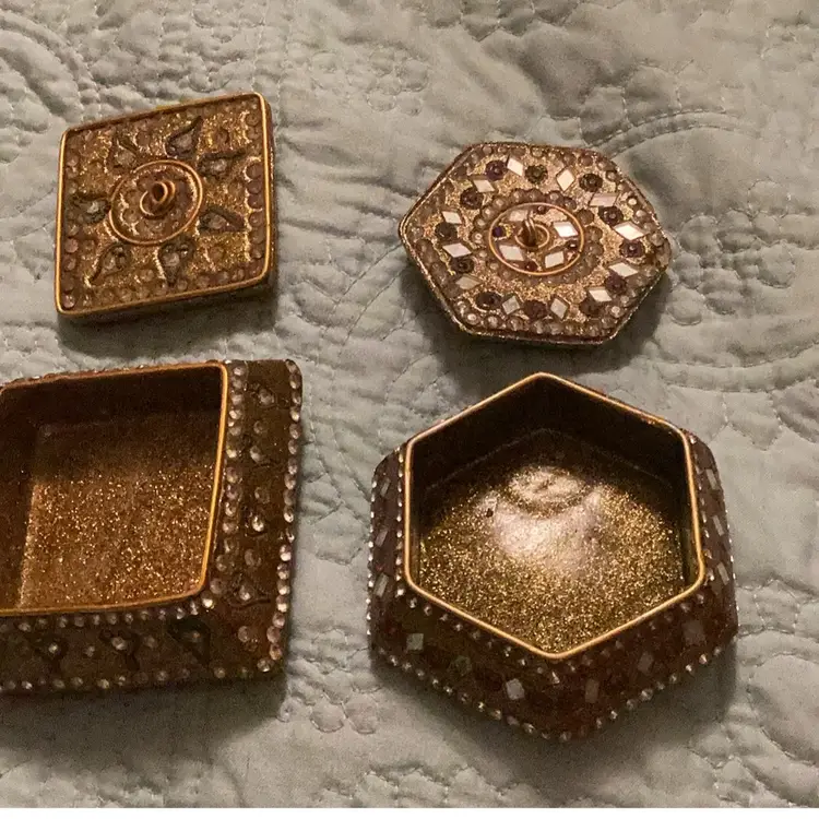 Buyers choice of a square or a octagon styled trinket box kind of like Egyptian Mediterranean Ethiopian. I don’t know what it’s made from. All I know is that they’re cute little boxes.