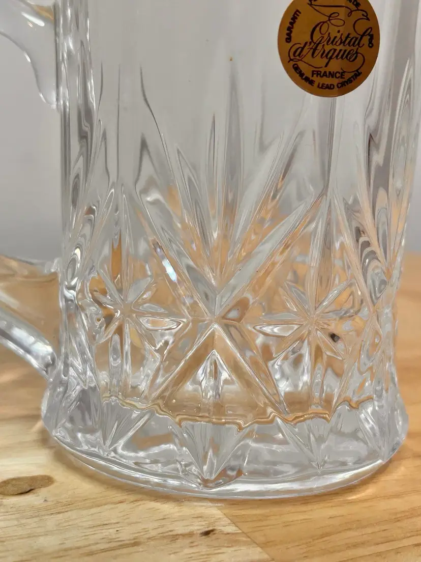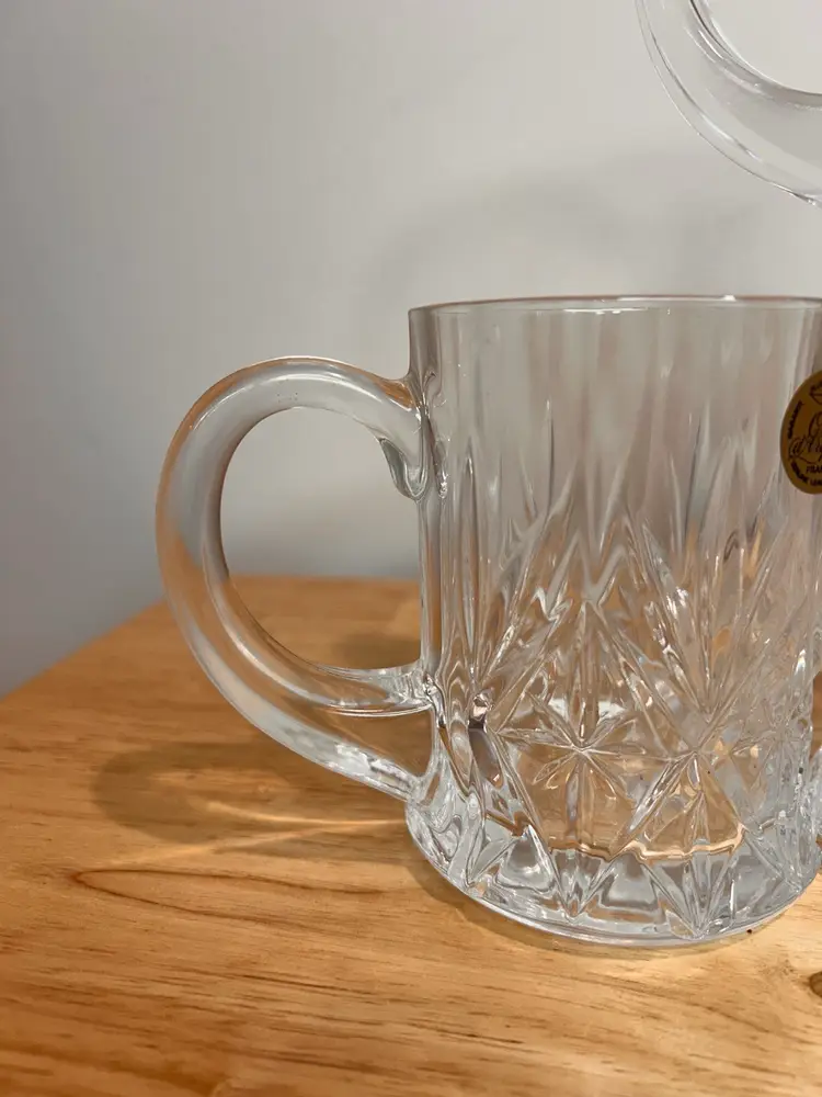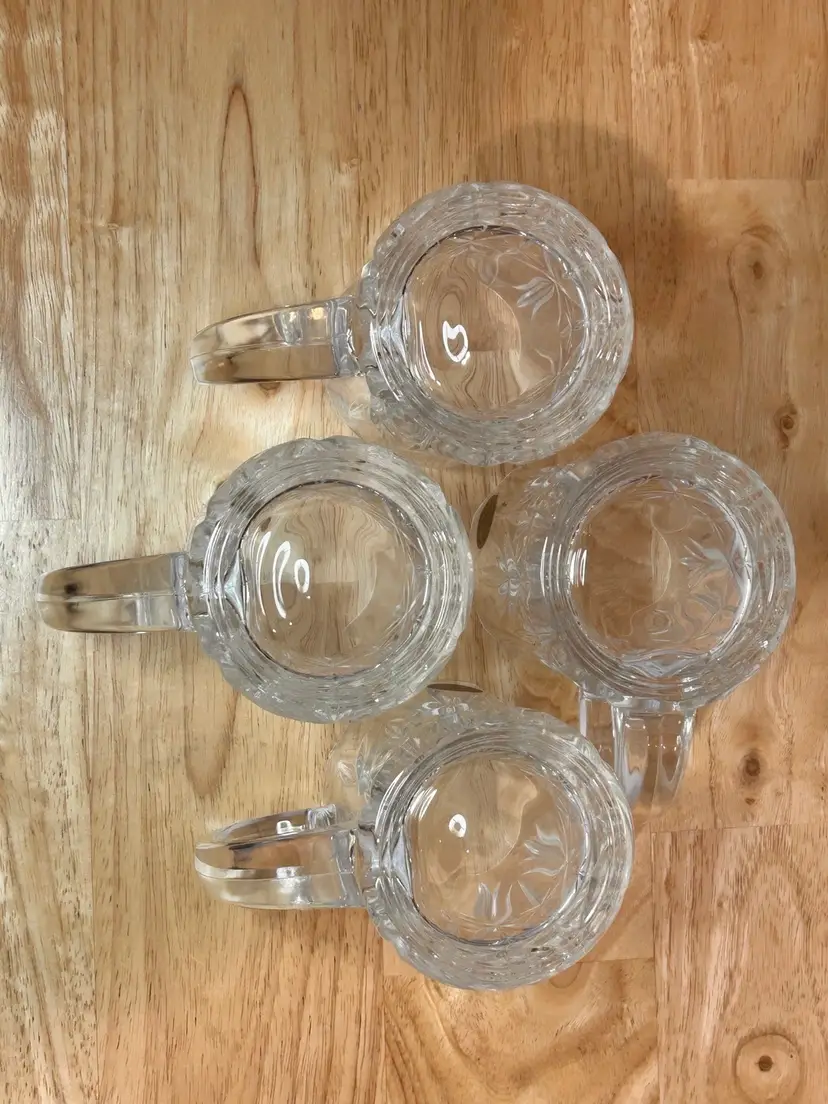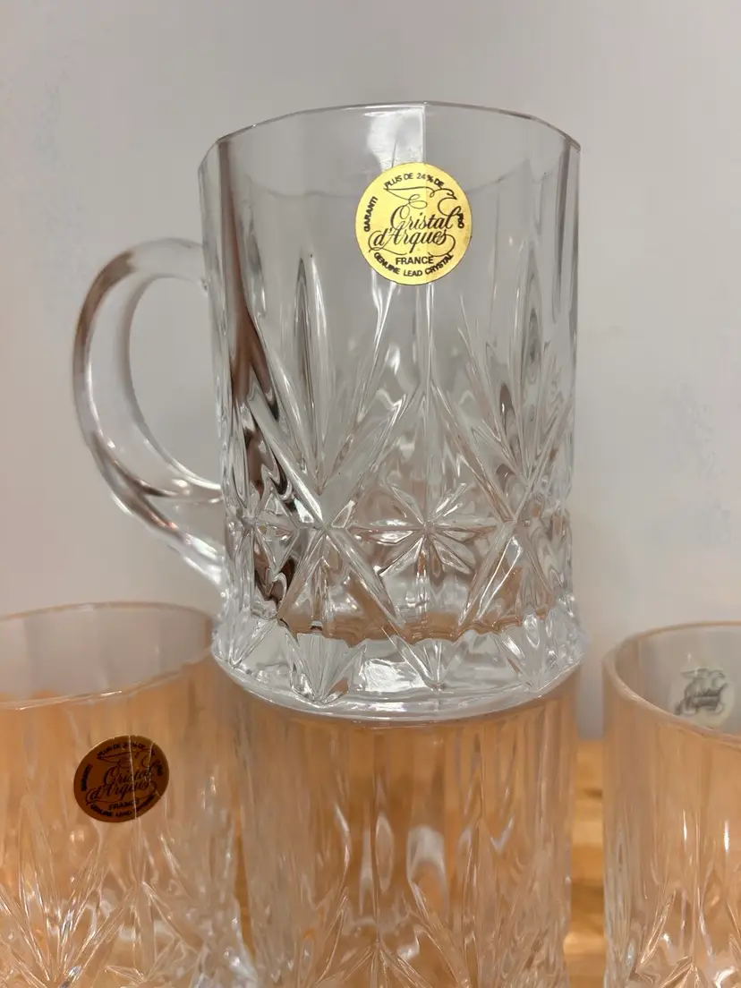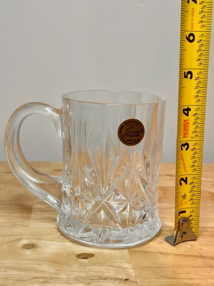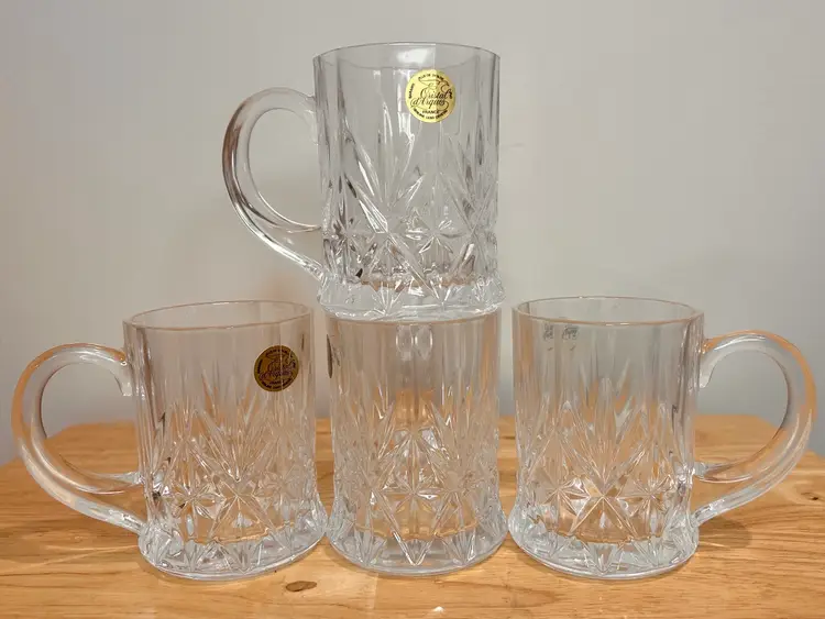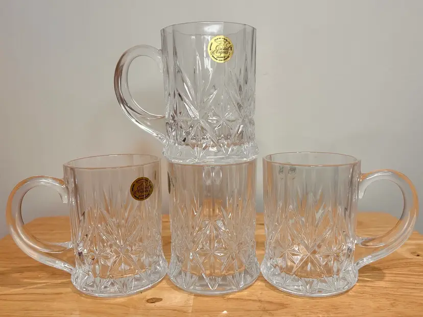 The 4 Cristal D'Arques Drinking Glasses Coffee Mugs are a luxurious set of lead crystal mugs made in France. Durable enough for everyday use. The set includes four pieces, each featuring a contemporary style with a criss-cross and fan theme. These durable and solid mugs are elegant and stylish, with handles for easy grip. The mugs will blend seamlessly to your kitchen or dining room with these genuine crystal mugs from the renowned Cristal d'Arques brand. Each mug holds 8oz and has a weight of 1lb 3oz each. Smoke pet free home. Flawless condition, no scratches, cracks or chips. ** If you’re loving Drinking Glasses, Serve-ware or Kitchen/Dining Accessories, Including vintage travel over to my listings to explore once upon a time items for you or a friend.