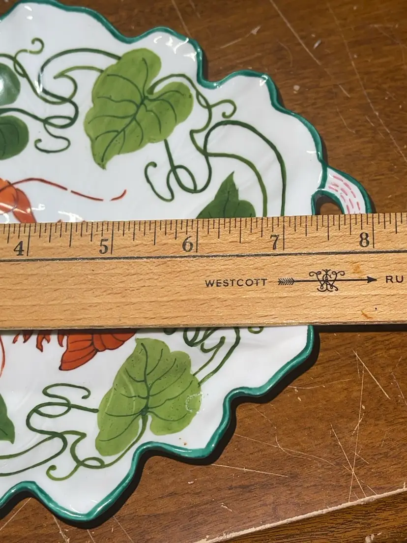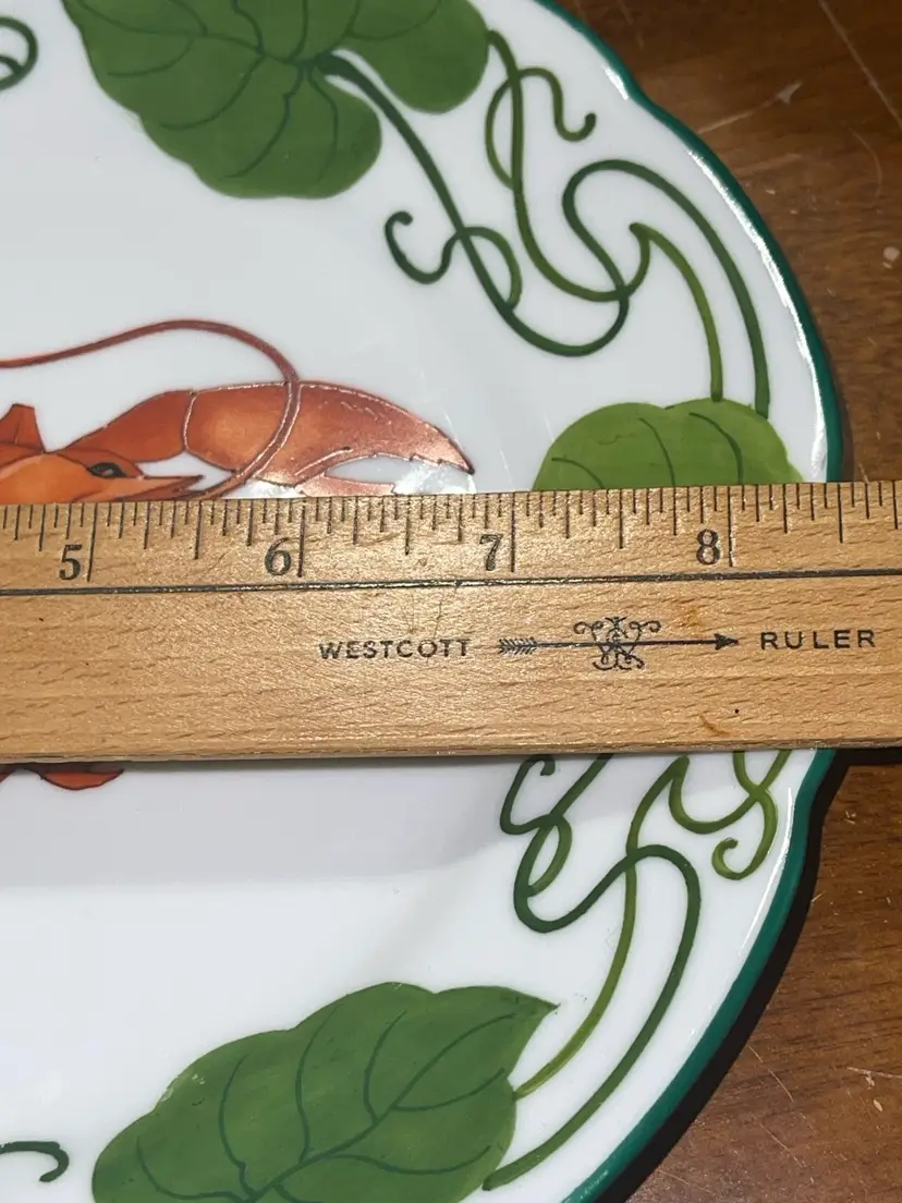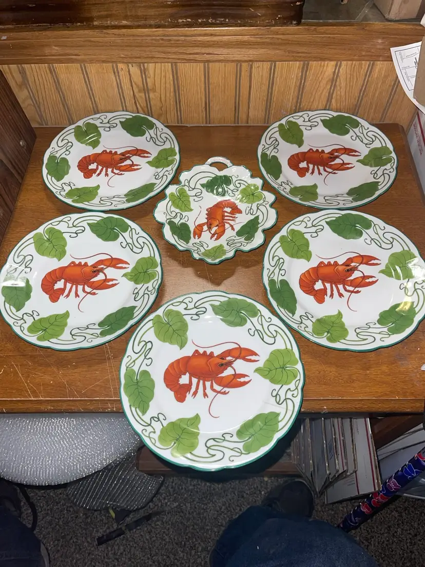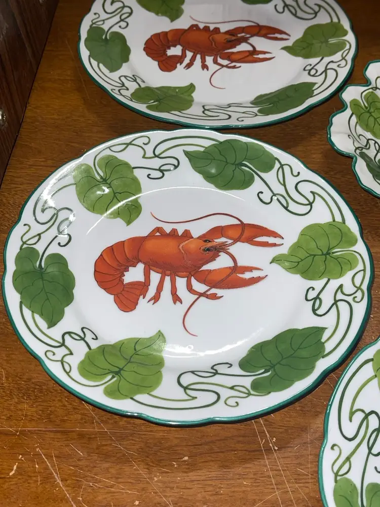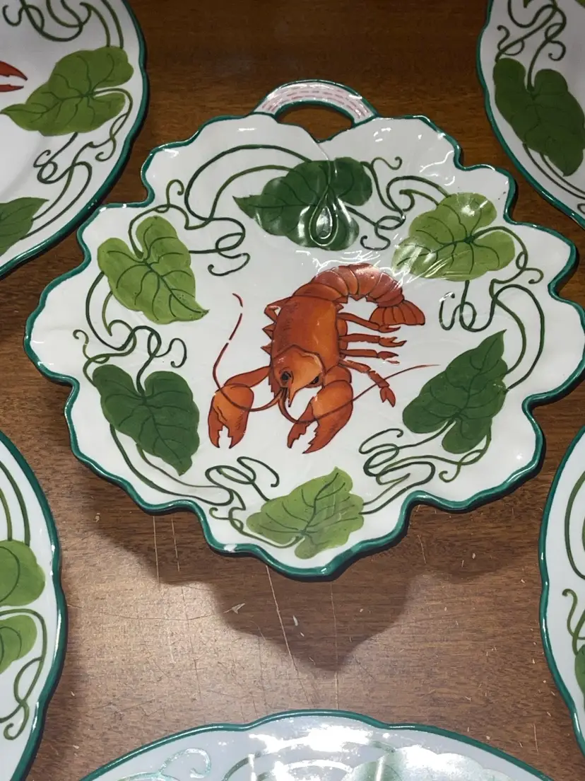 4 Crown SAXE Lobster Plates And Handle Dish Excellent Vintage MCM Condition. All feature a cooked red lobster surrounded by ivy. They are in excellent shape, not sure if they were ever used as there are no scratches on the plate surface. You will receive the 4 perfect plates as listed in the title and the handle lemon/butter dish plus one plate that has about a 2” crack on the side for a total of 6 pieces.