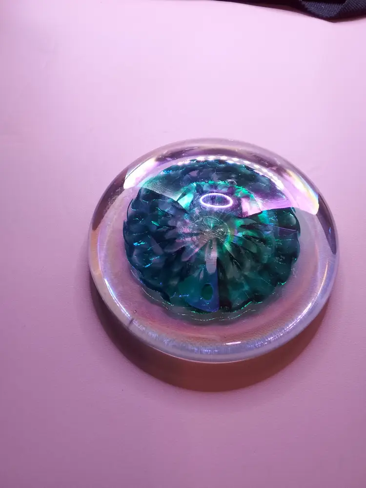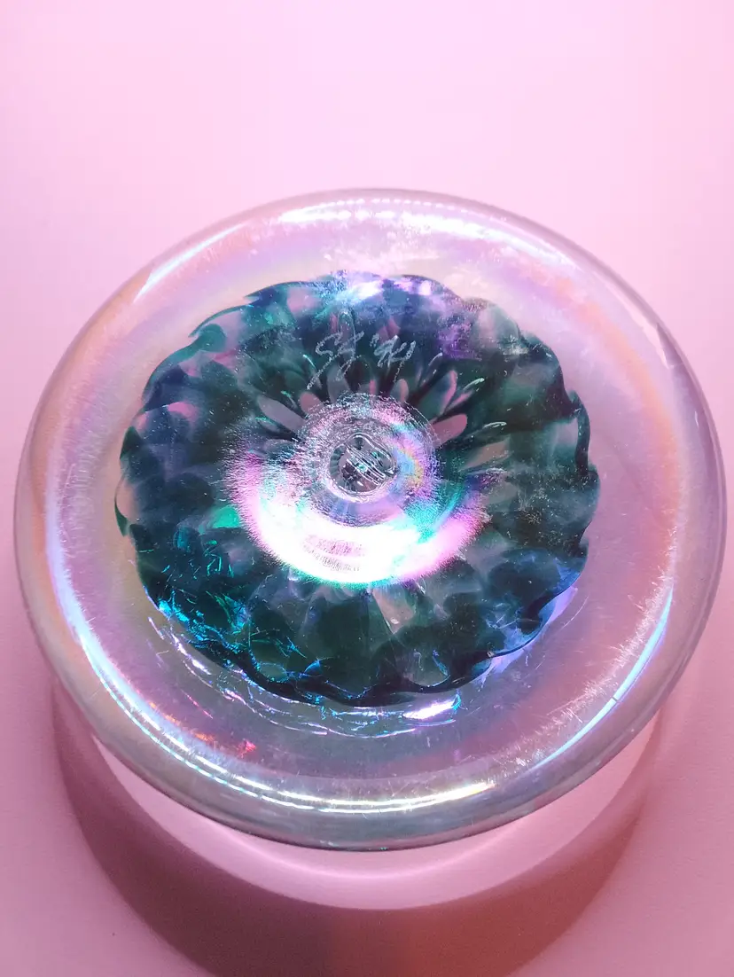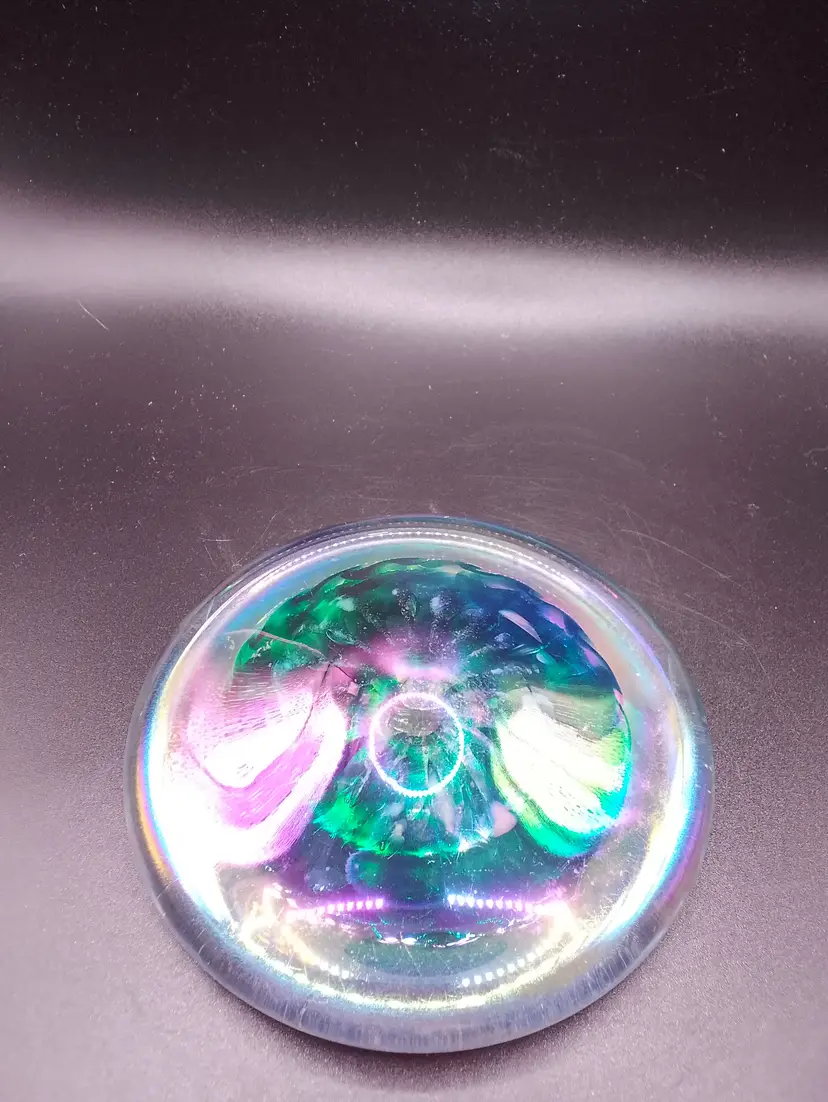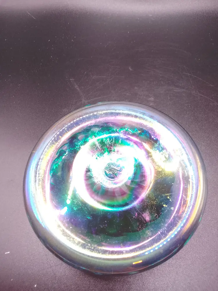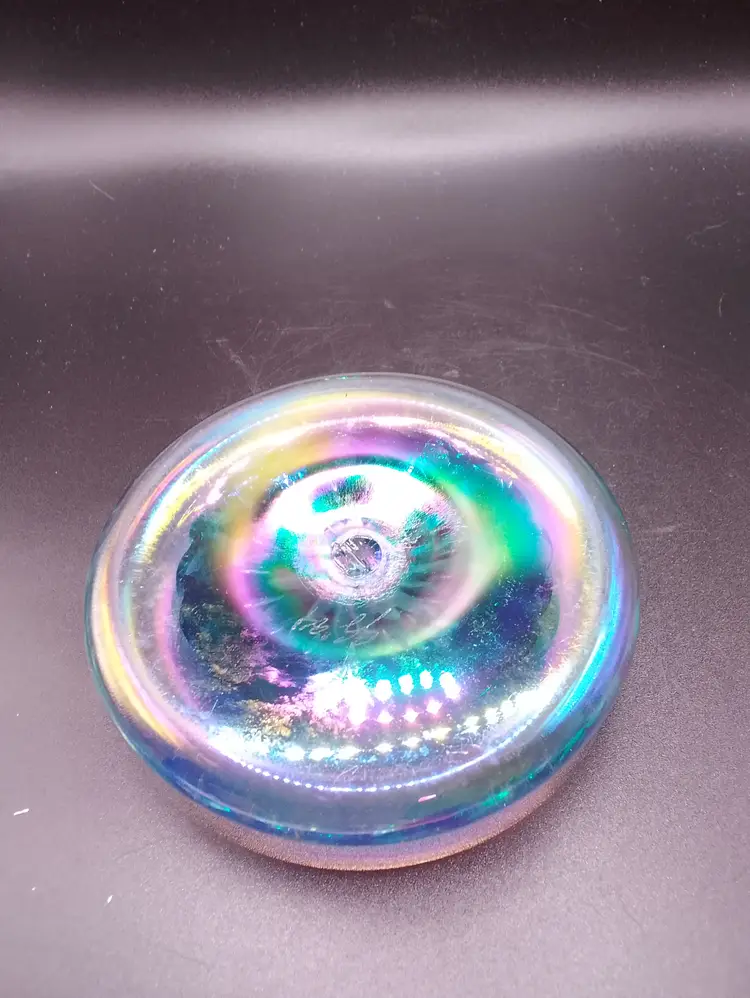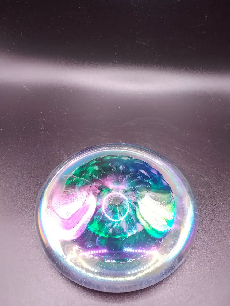 The product is a 4" flat iridescent glass paperweight signed SS '94 with a green and blue design. It features a swirl pattern and is made of hand-blown art glass from the late 20th century. The glossy finish adds to its appeal, making it a unique and decorative piece for any collection. The paperweight is unmarked and showcases the craftsmanship of the era, making it a vintage piece that stands out. beautiful piece