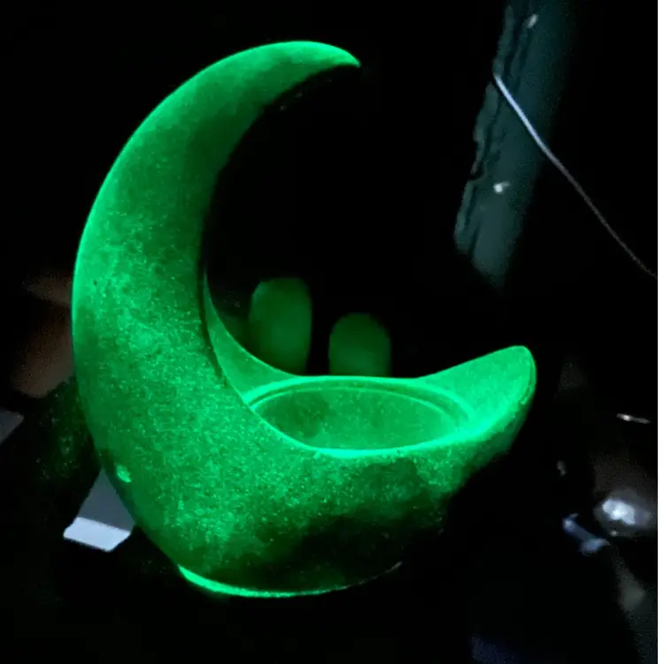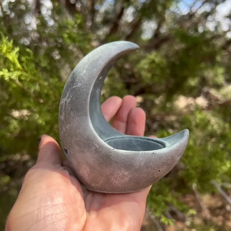 Hand poured concrete with charcoal hues and glows in the dark. Can be used for tea light or air plant.