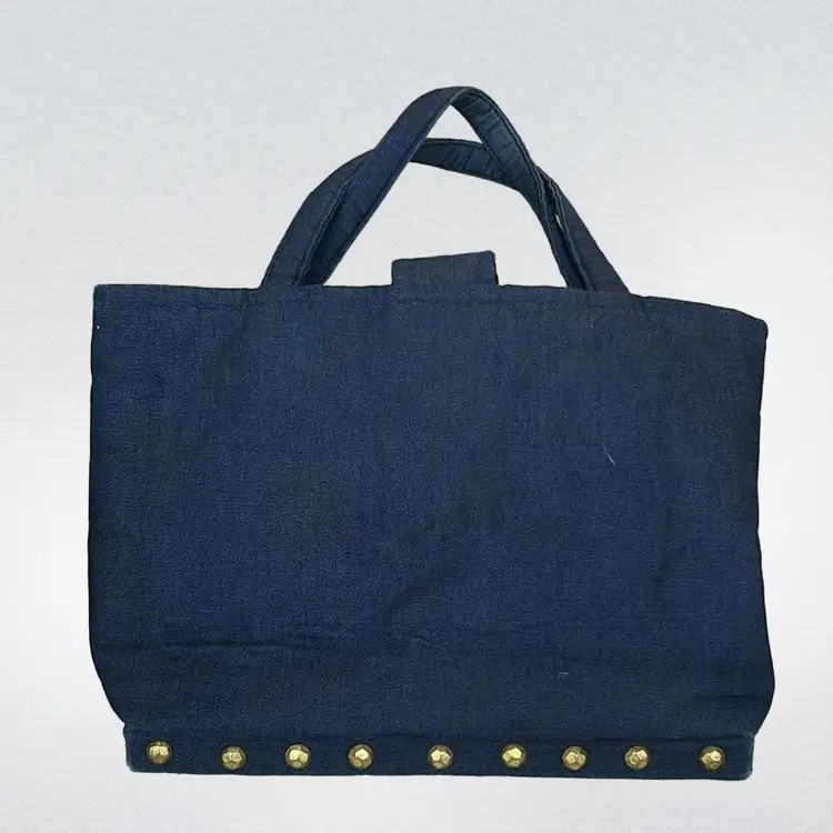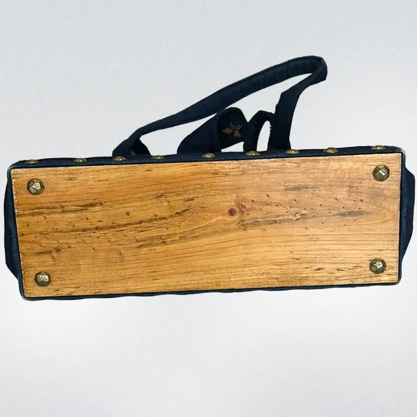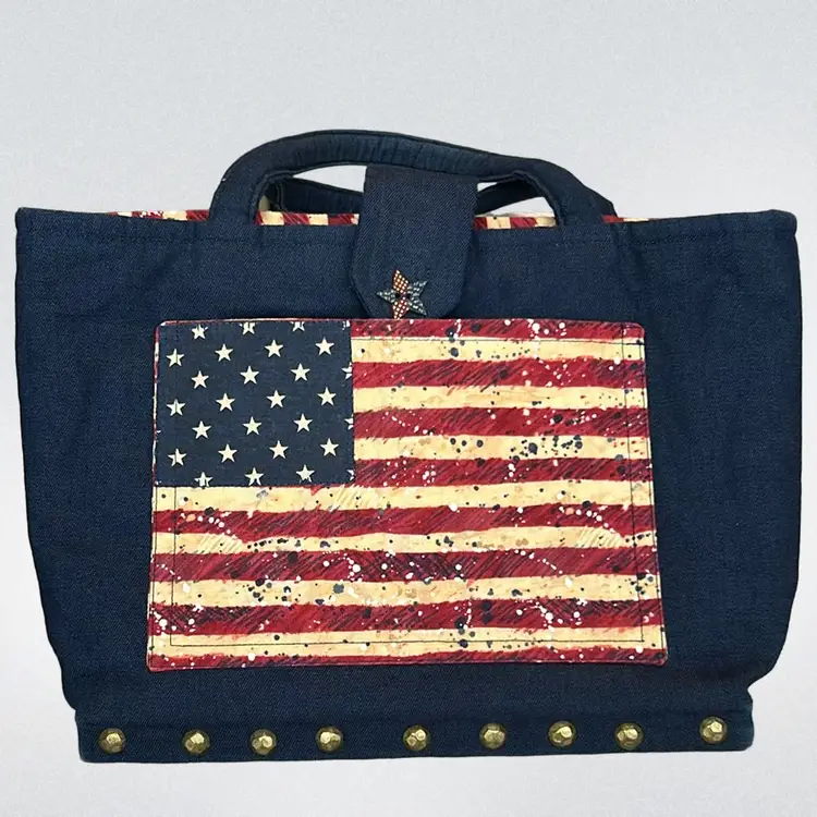 Handmade Americana purse with a wooden bottom. Handbag is 8.5 inches tall with a 6 inch handle drop. There is a 7 x 5 inch pocket on front. 3 pockets on the inside. Total width is 10 inches and depth is 3.5 inches. Made of denim and cotton fabric.