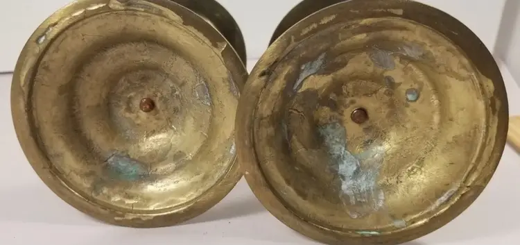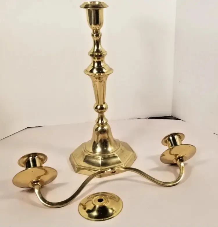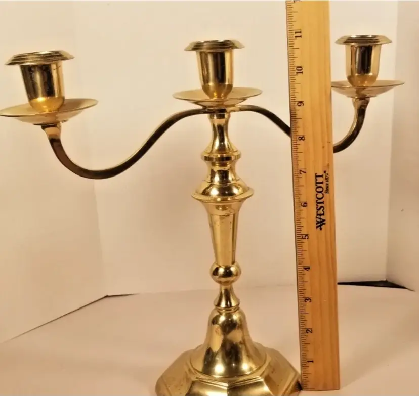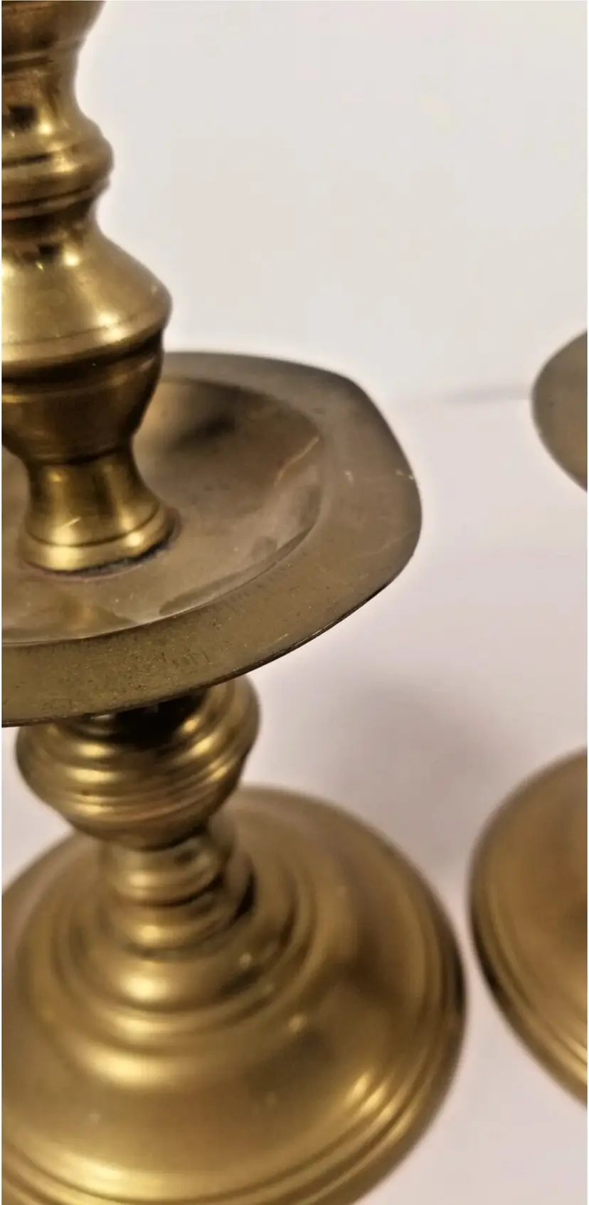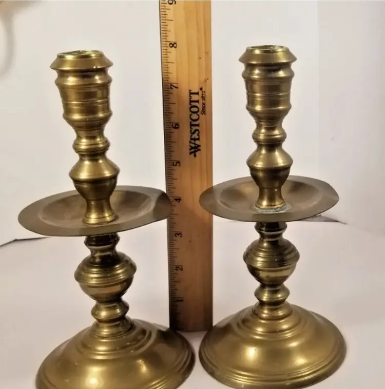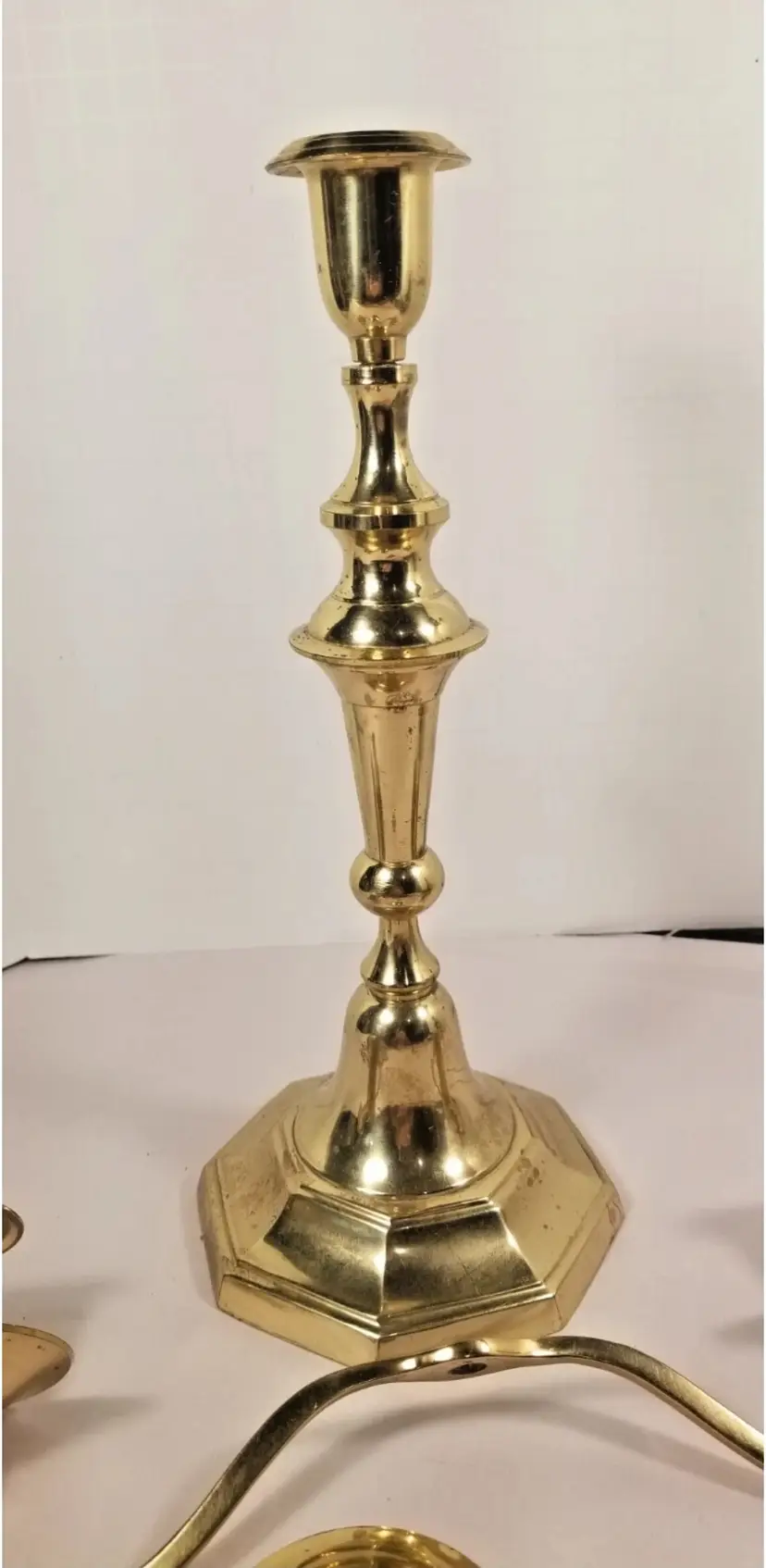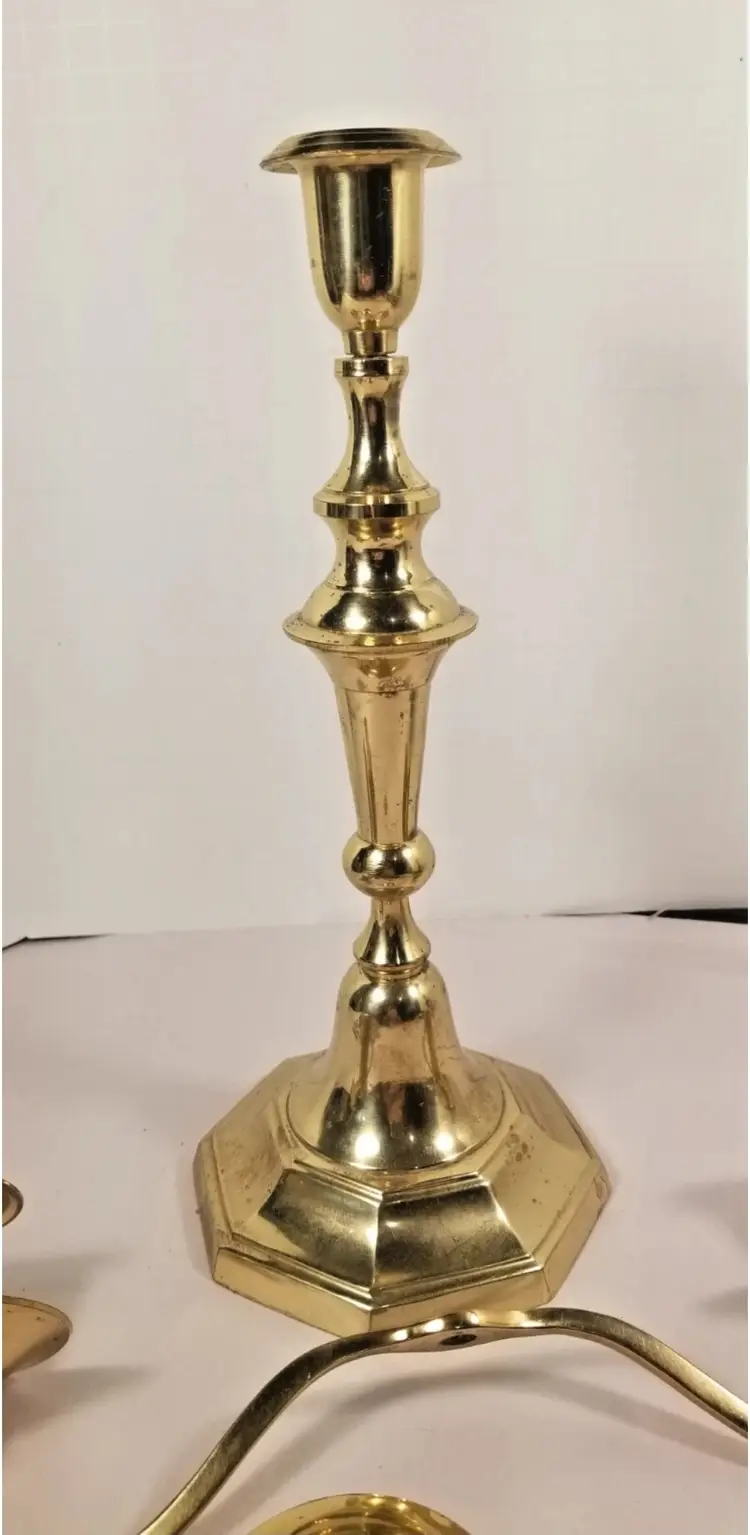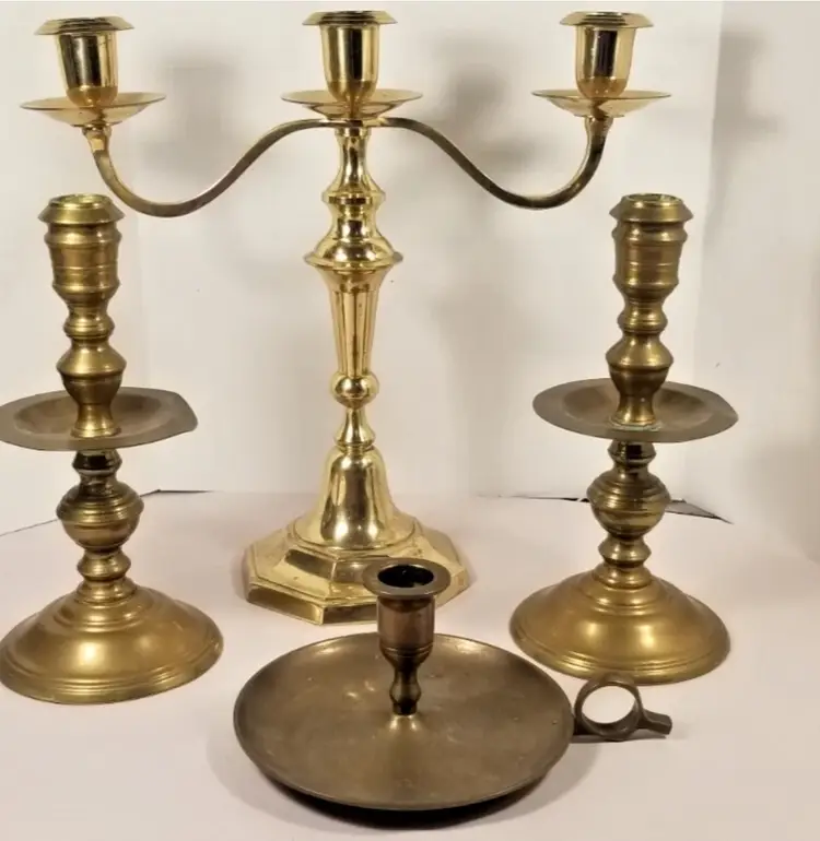 This lot of 4 heavy vintage brass candle holders includes one with a finger loop and one candlelabra. These medium-sized decorative collectibles are made of antique brass, adding a touch of elegance to any space. The finger loop feature adds a unique and practical element to the design, making them easy to carry and use. Perfect for adding a vintage touch to your home decor or for collecting and displaying