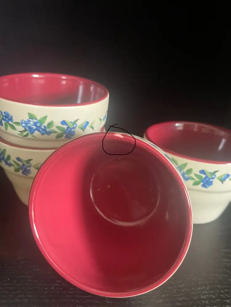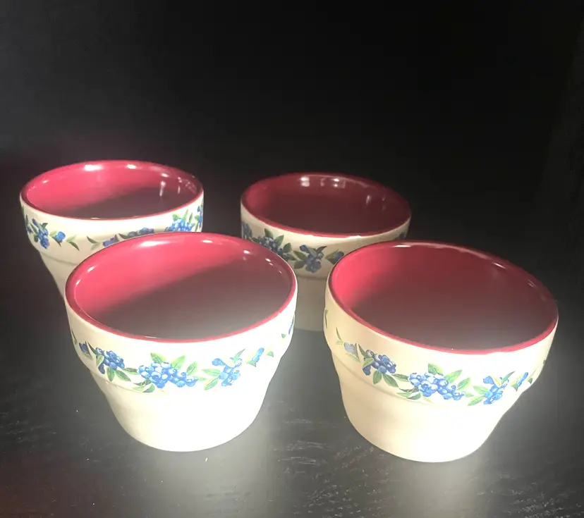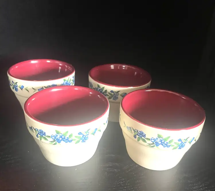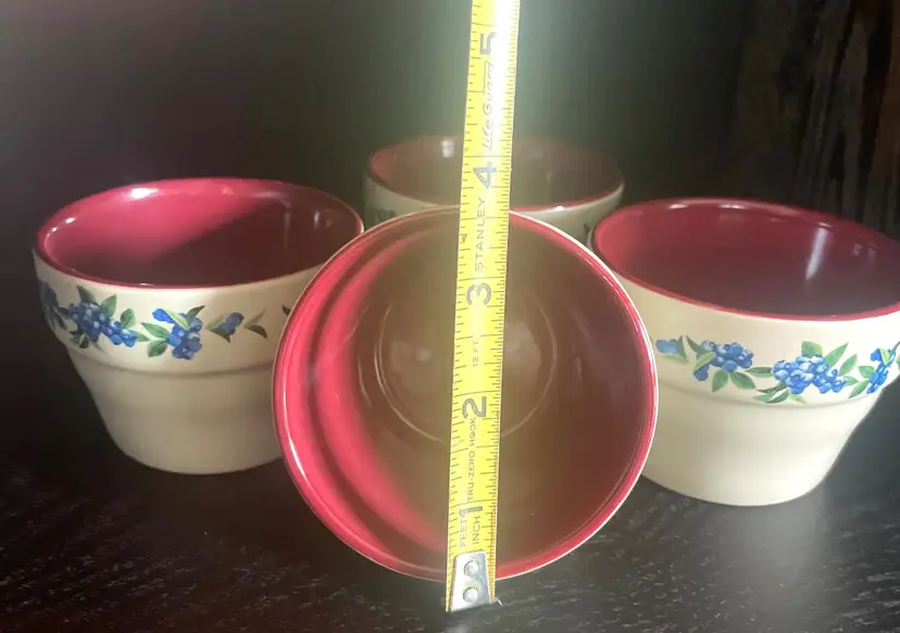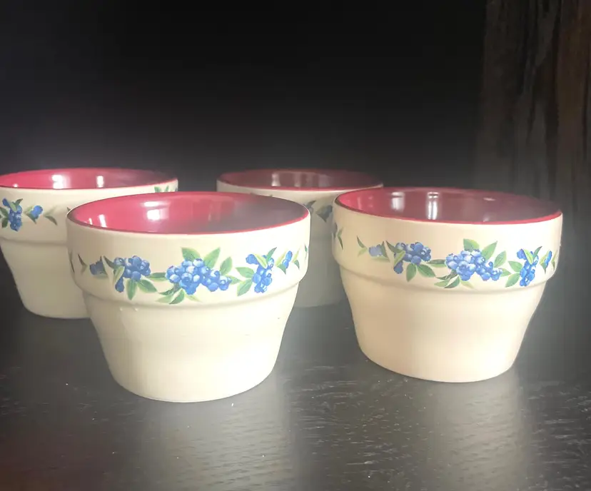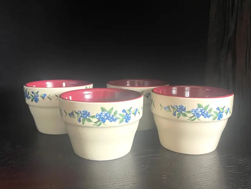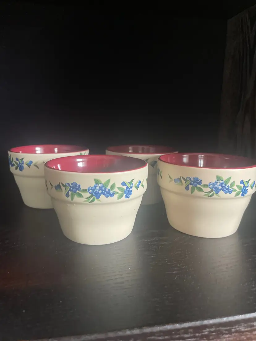 4 flower pots small with floral design. Would make nice gift to give one with a small plant for teacher gift, Mother’s Day gift, birthday gift, Easter gift, or even displayed on your own window sill with flowers or herbs. All are in excellent like new condition. One has a small imperfection in the glaze at the rim that I think is just a manufacturing defect. . I circled it in the last picture. Please view all pictures as they are part of this description.