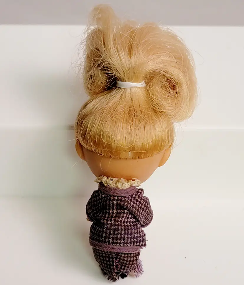 1960s Mattel Little Kiddle's doll. 2.5-3.5" tall. Vinyl/rubber with posable legs. The doll may show wear consistent with age, such as discoloration, holes in rubber feet or hands from wire. Clothing stains or fabric issues. Frizzy hair.