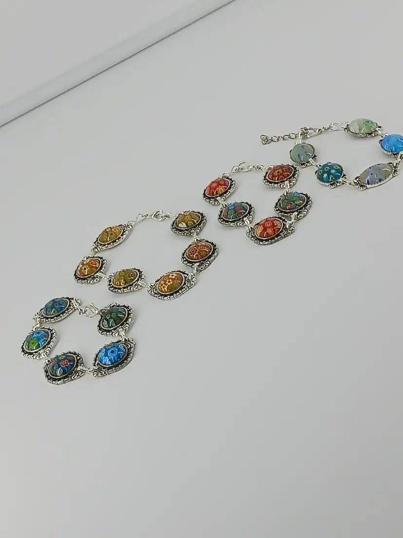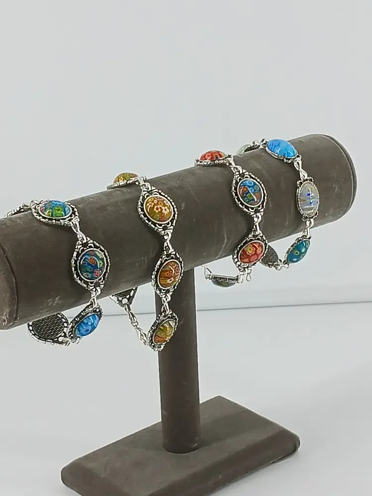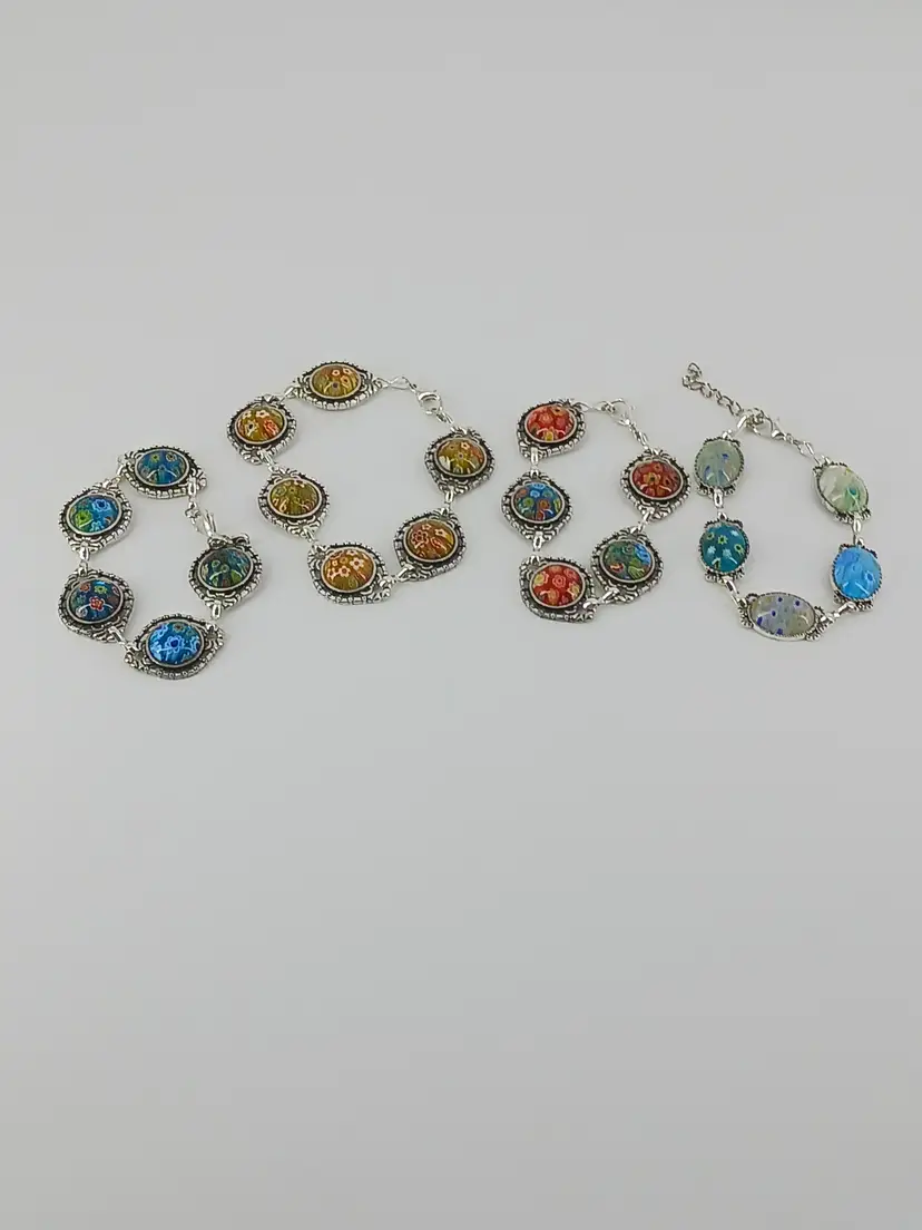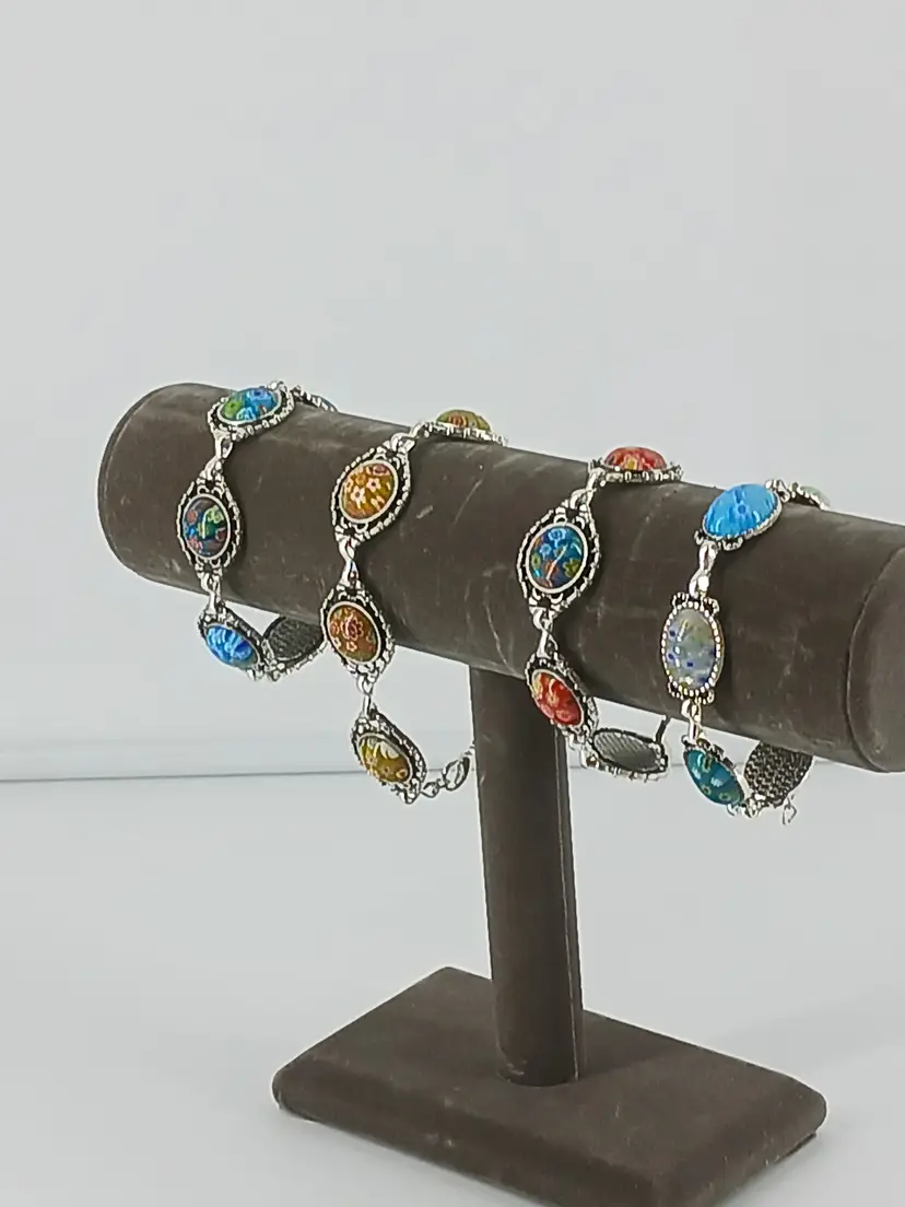 BM384 – 3/4x ½ x3/16 inch Teal Blue and clear Millefiori Glass Cabochon has been mounted into a 1 1/8 x 7/8 inch antique silver cabochon link settings and has been linked together to make this 7 3/4inch bracelet and has an extra 2 inch extension chain for added length.