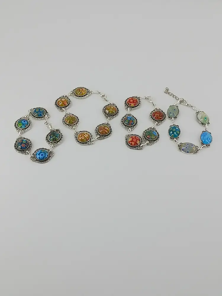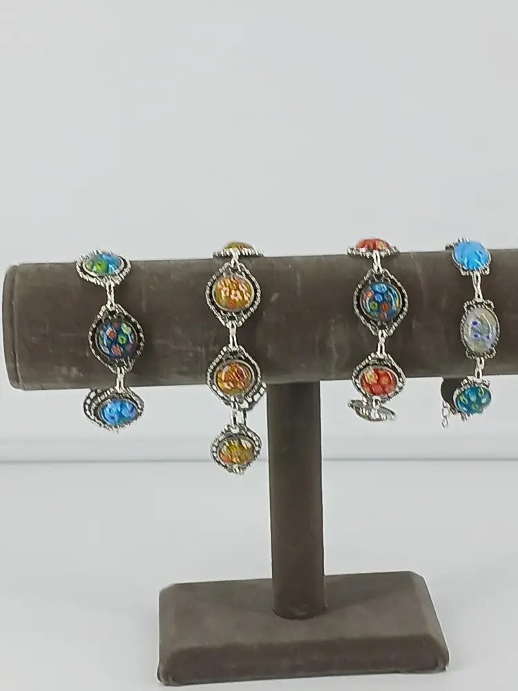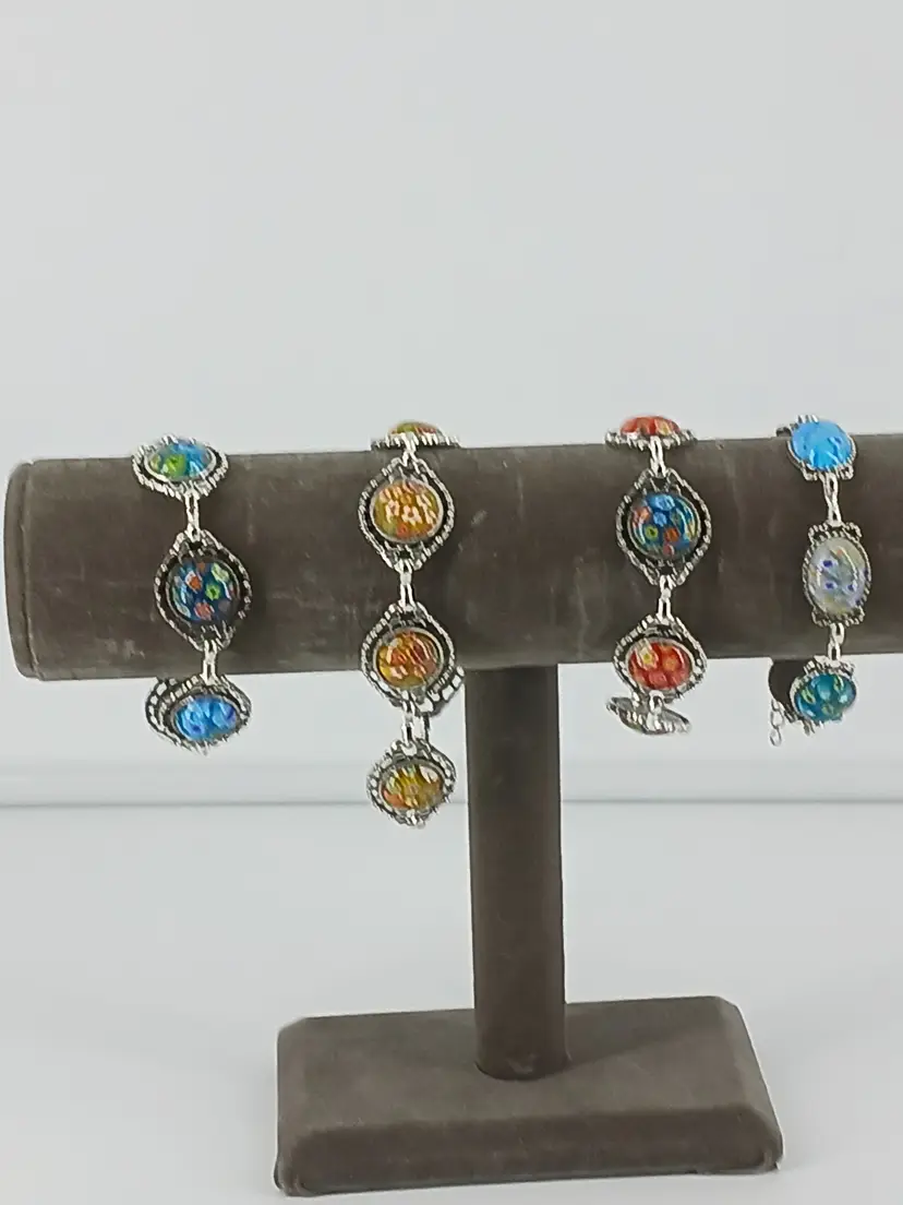 BM382 – 9/16 x 3/16 inch round Yellow Millefiori Glass Cabochon has been mounted into a 1 1/8 x 7/8 inch antique silver cabochon link settings and has been linked together to make this 9 inch bracelet.