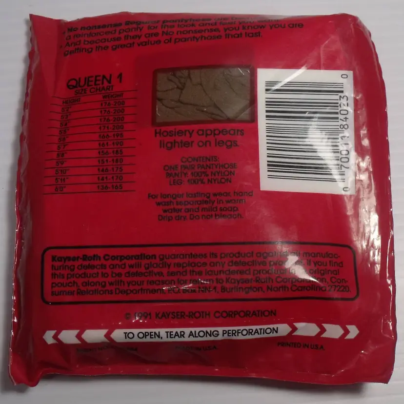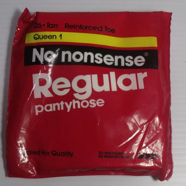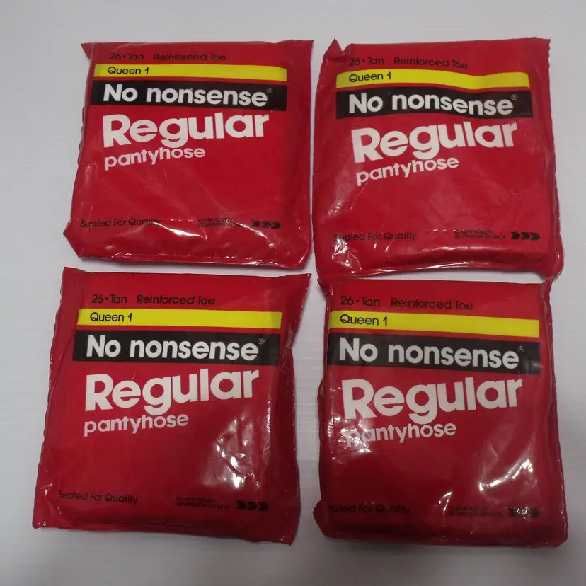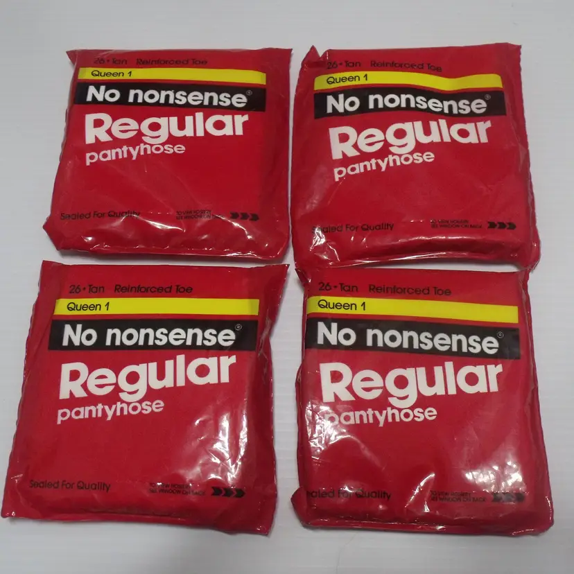 The product is a vintage 1991 4 pair of No Nonsense regular pantyhose in tan color, size Queen 1 (136-200lbs). Made of 100% Nylon with a reinforced toe, these sheer pantyhose are suitable for various occasions such as travel, weddings, everyday wear, casual outings, christenings, workwear, and business meetings. With a classic solid pattern and a hand wash only care instruction, these pantyhose are designed for all seasons and are perfect for women who appreciate quality and timeless style in their wardrobe. Made in the United States, these pantyhose come in a pack of 1.