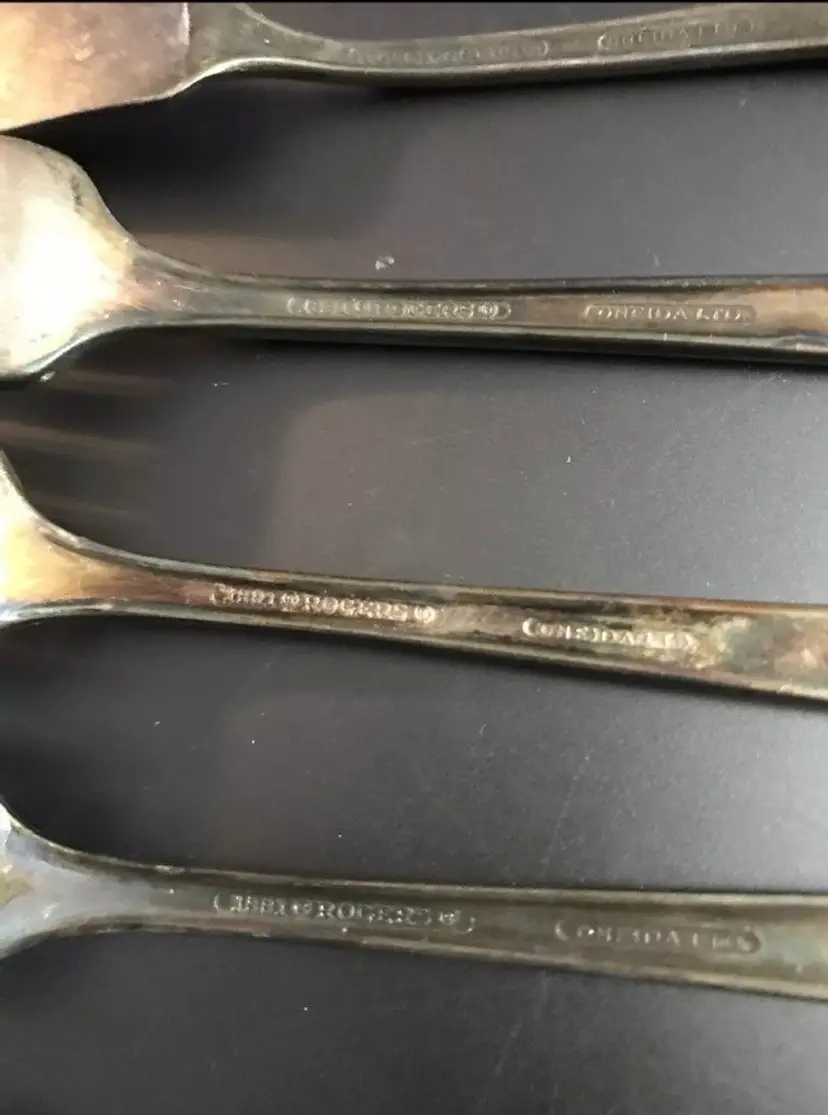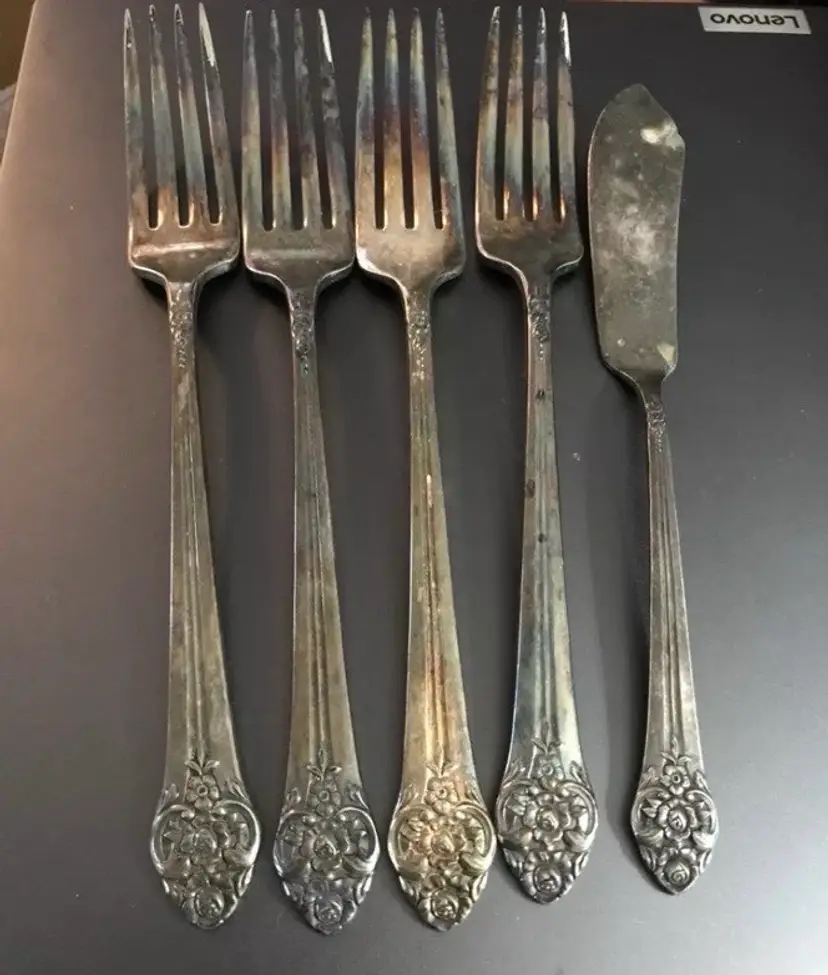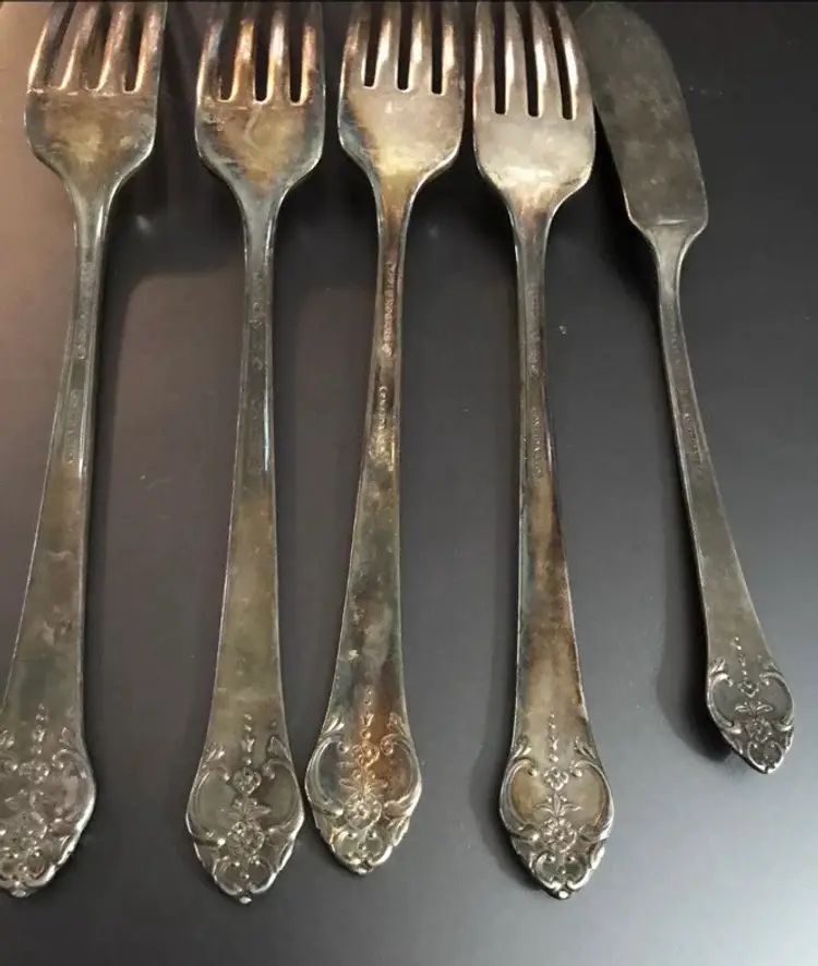 4 Oneida PLANTATION Silver Plate Forks 1 Cheese Knife1881 Rogers Silverware 1948.