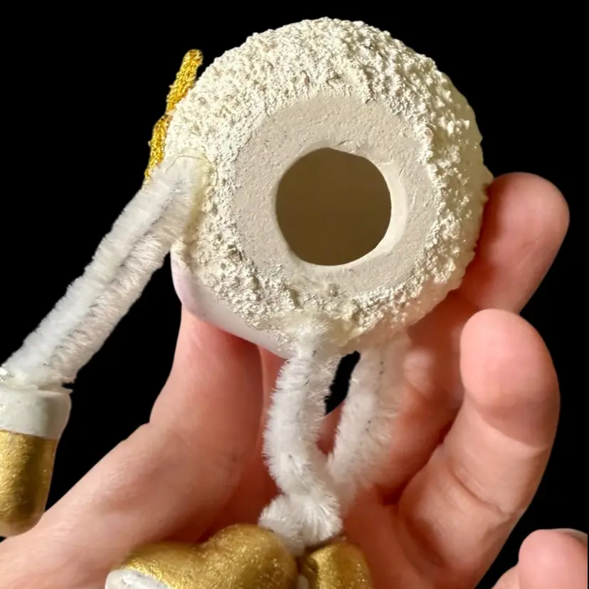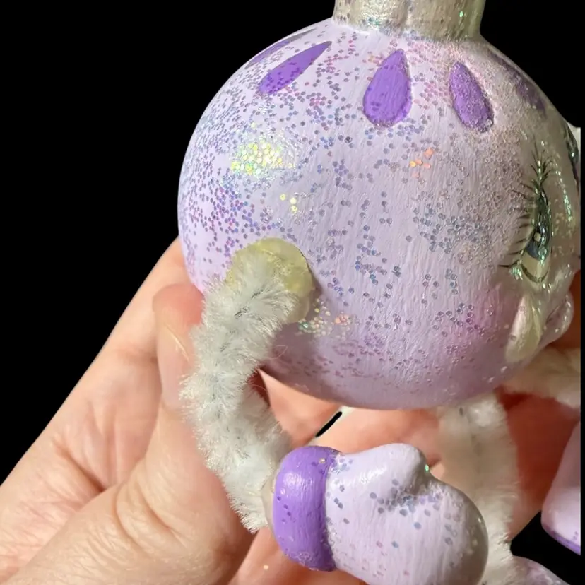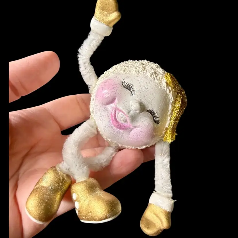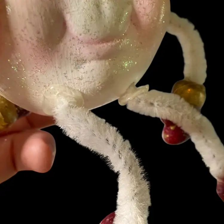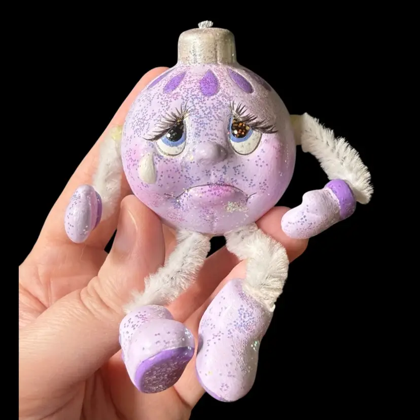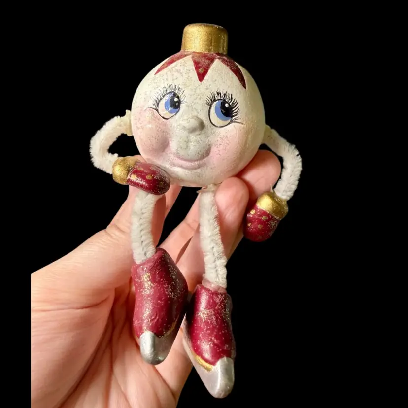 2"x2"x2" - 2"x2.5"x2". Lot of FOUR ceramic ornament figurines/shelf sitters, featuring dangling pipe cleaner arms & legs. Each have a different face, full of personality, and are painted in different colorways & glitter. The textured one (looks like a snowball) is made to sit at a slight angle, like it’s about to roll over while laughing. May have been hobbyist pieces. NOTE all legs/arms are connected, however glue can be seen at connection points. Due to the nature of the construction/materials used, the arms/legs do flop around in all directions, although that’s standard for these!