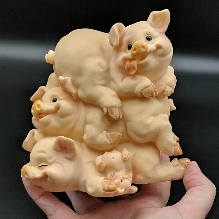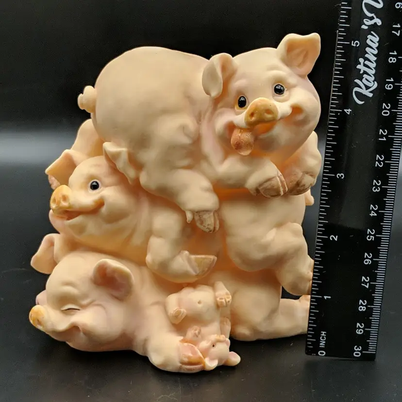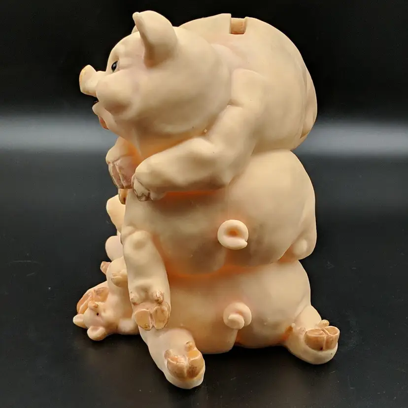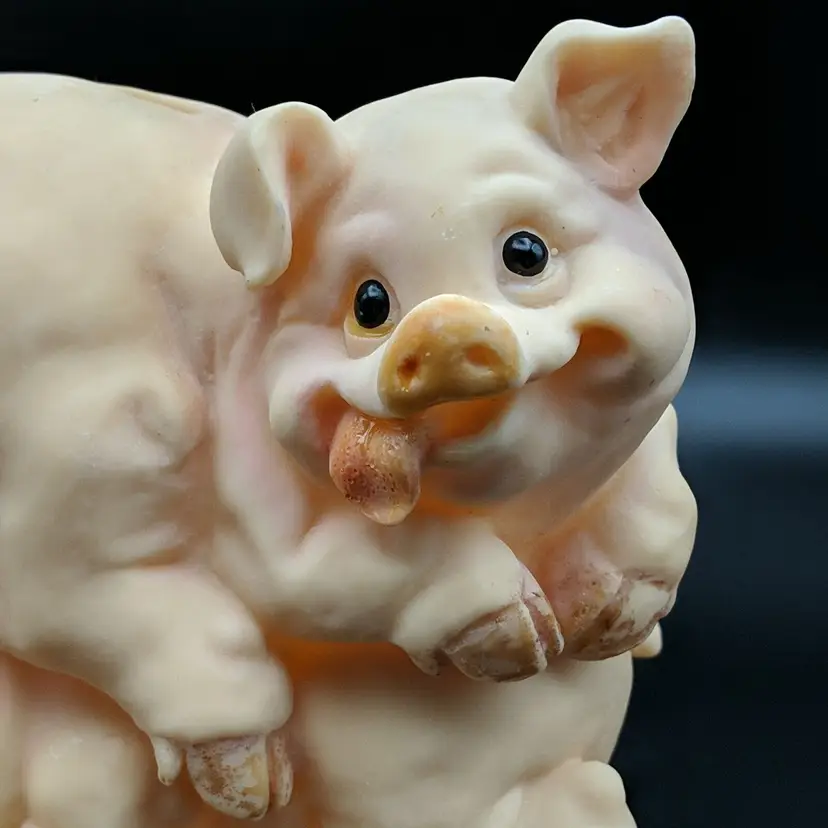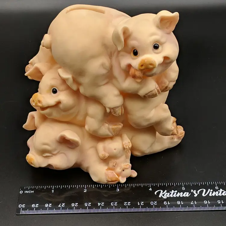 Paint wear on hooves, includes stopper Brand: Unknown Animal Class: Pig Item Height: 5 in Theme: Animals Original/Reproduction: Unknown Material: Plastic Country/Region of Manufacture: Unknown Item Width: 5.25 in Item Weight: 9.3 oz