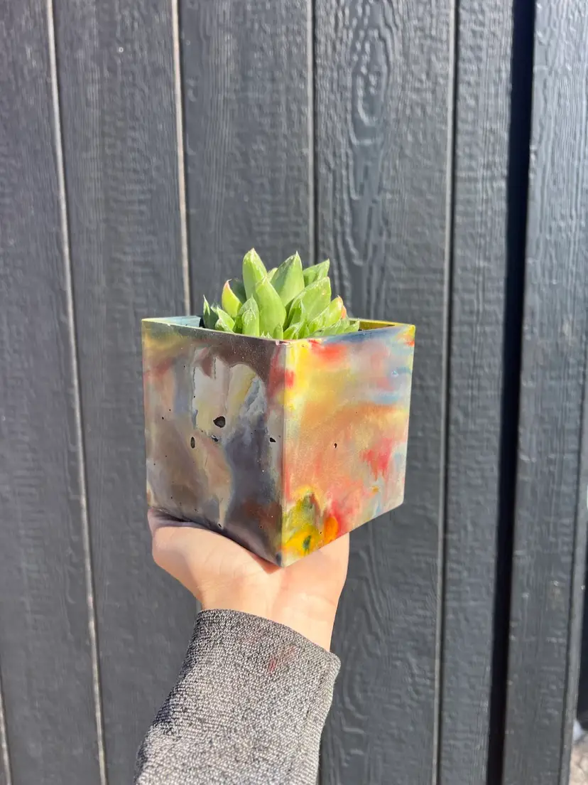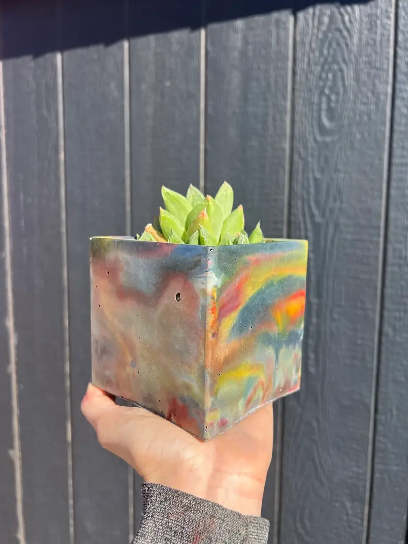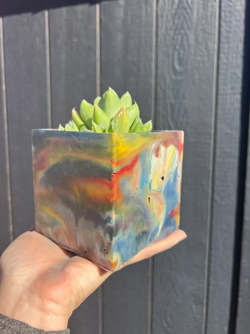 Hand poured concrete square planter using various dye for color. Drainage added upon request.