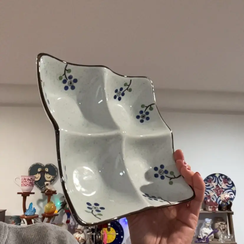4-section Square Speckled Ceramic Blue Flower Dish 7”