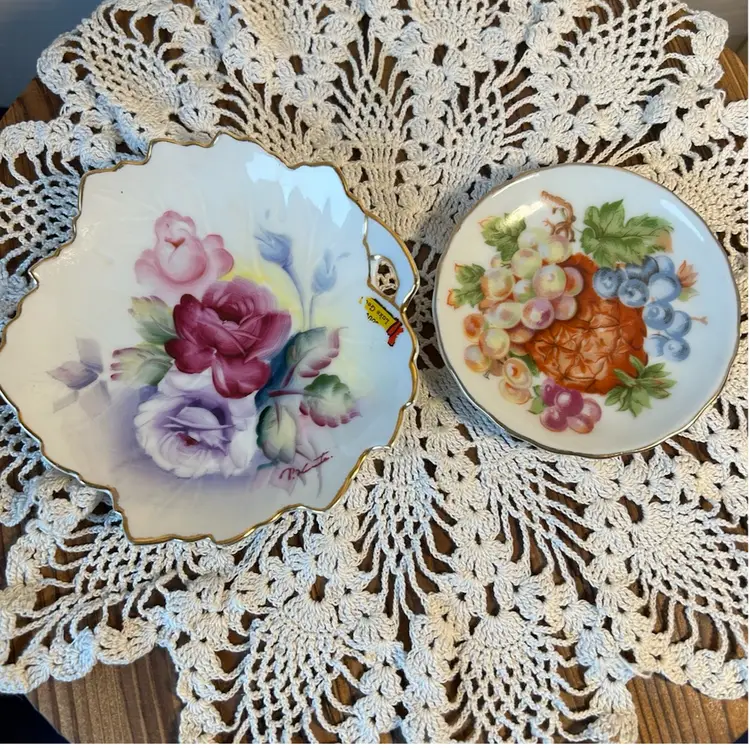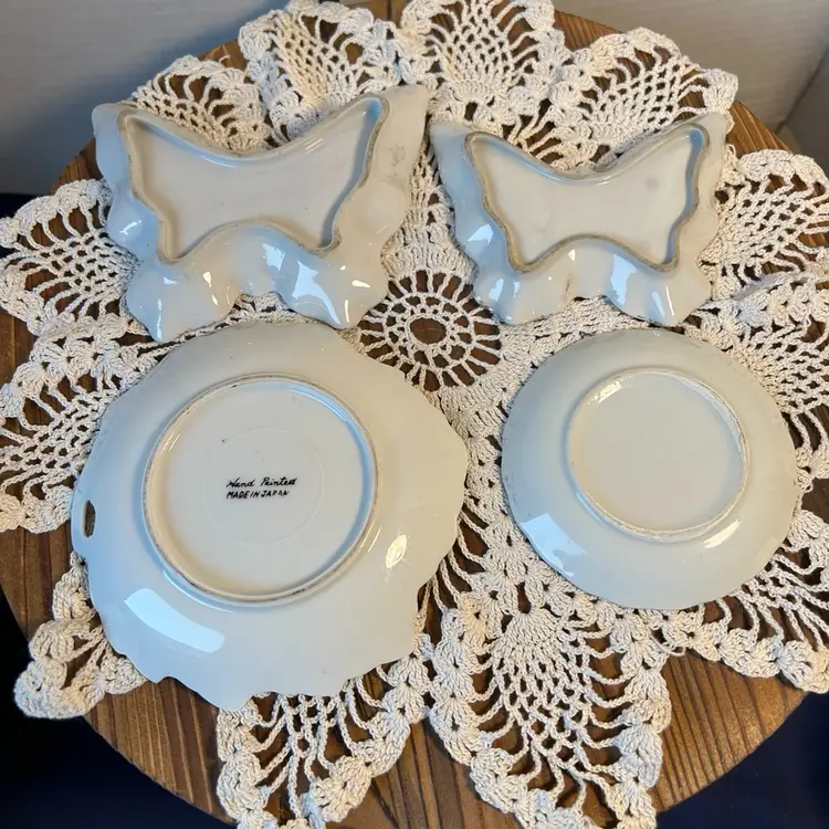 All in perfect condition. Bottom left measures 4.75” in diameter and is hand painted. Bottom right measures 3.5” in diameter. Bigger butterfly measures 4” long by 4” tall to the top of its wings. Smaller butterfly measures 3.5” wide by 3.5” to the wings