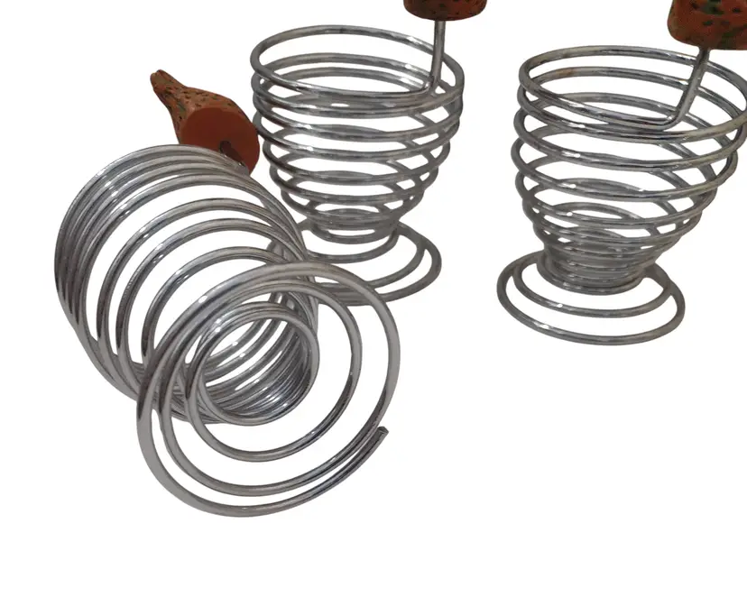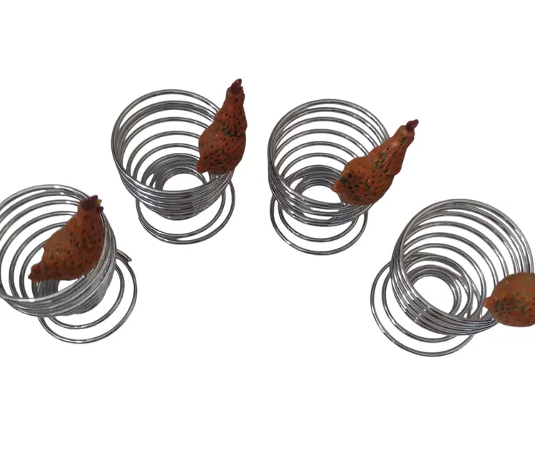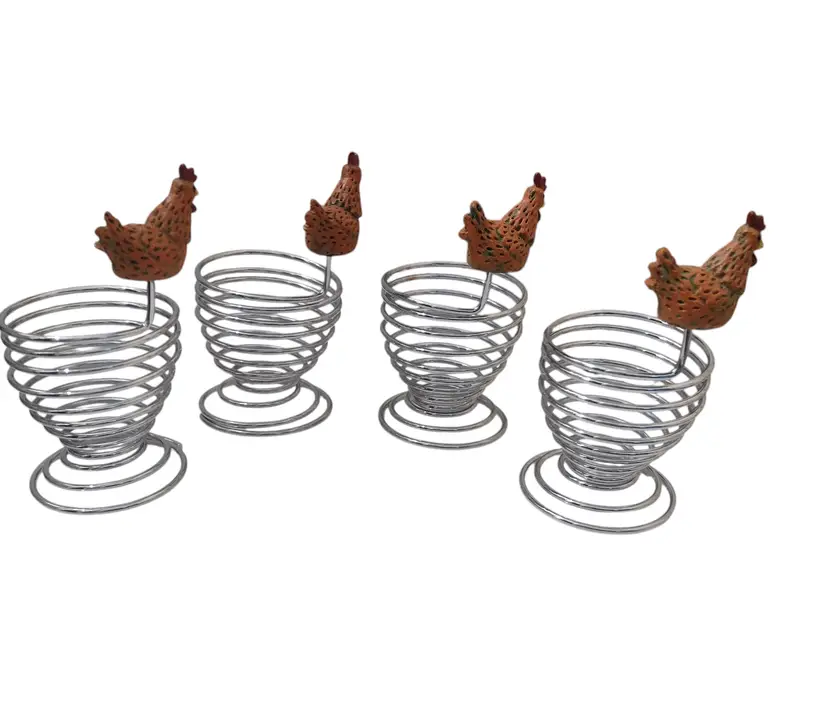 These are nice sturdy stainless steel egg holders with a cute chicken on top. These are very versatile & easy to clean. Holders measure 4" tall x 2.5" wide.