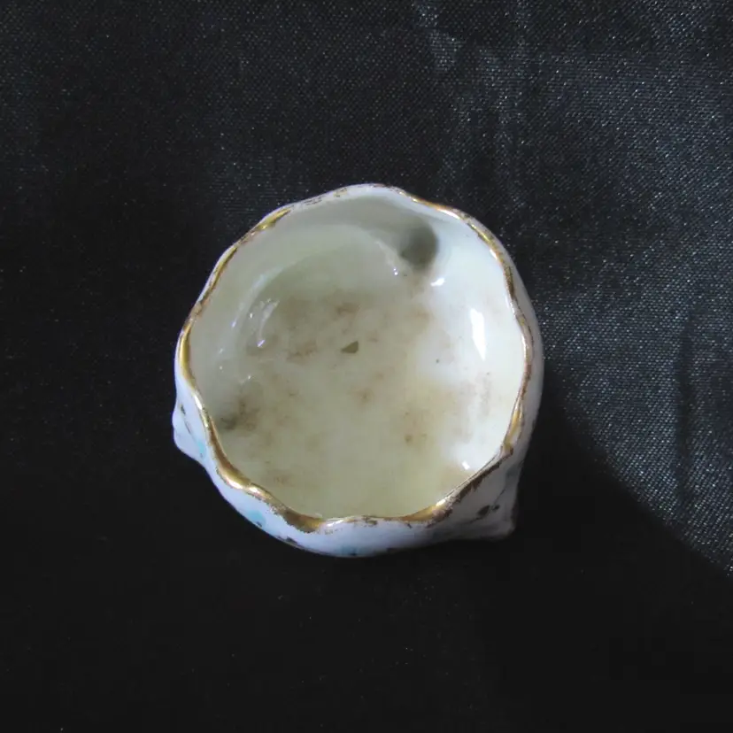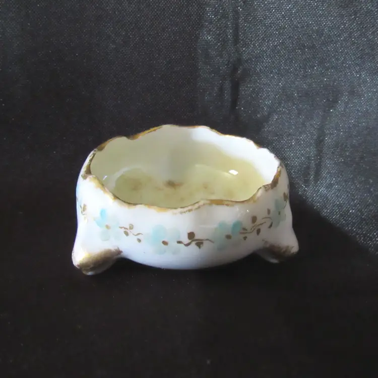 This 3 footed porcelain salt is approx. 1" tall x 2" across rim. White porcelain with gold trim and a ring of flowers. No marks. There is some wear to the gold but it is in overall very good condition with no chips, cracks or breaks.