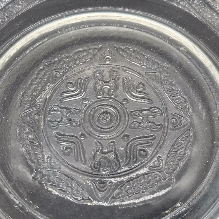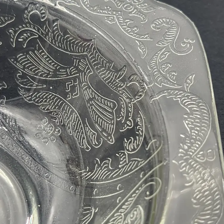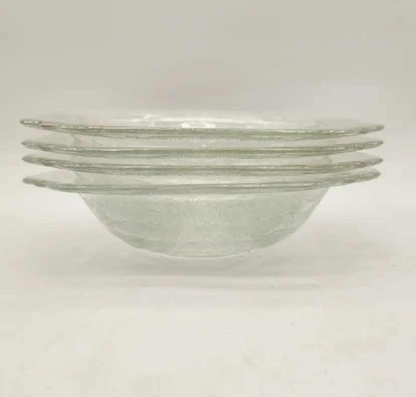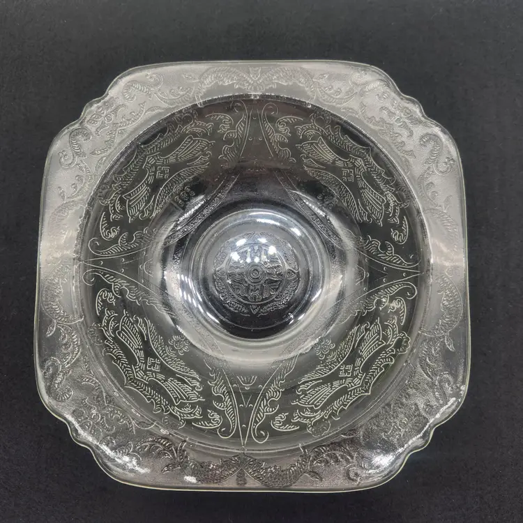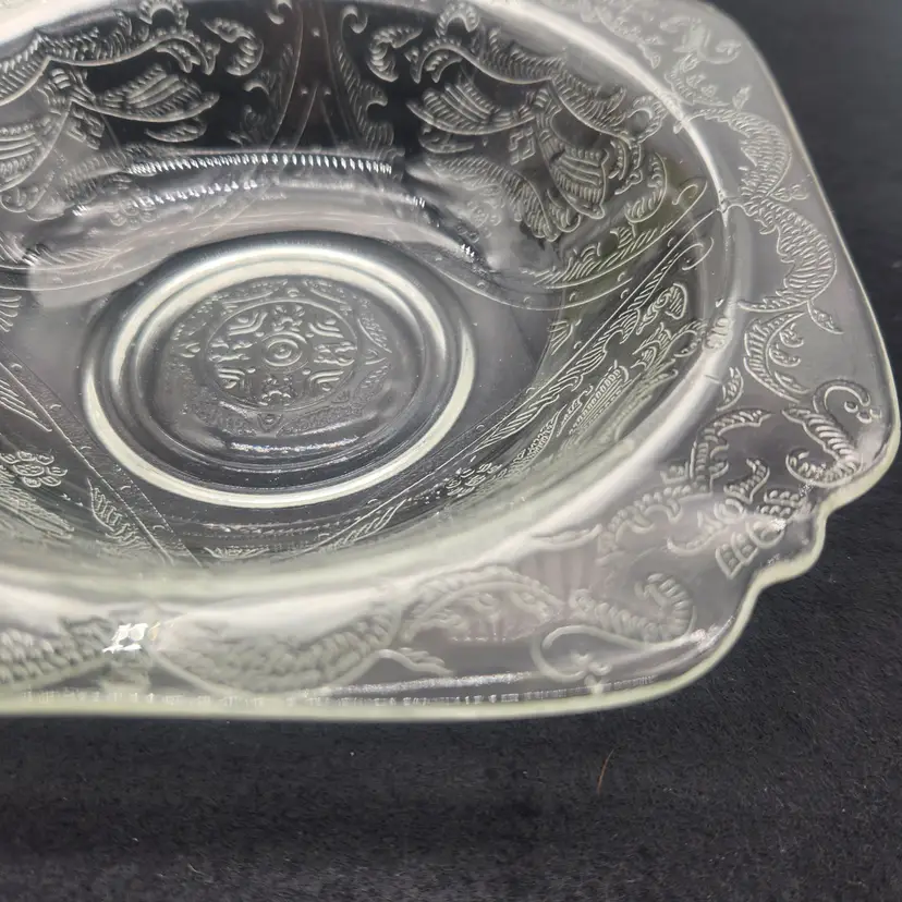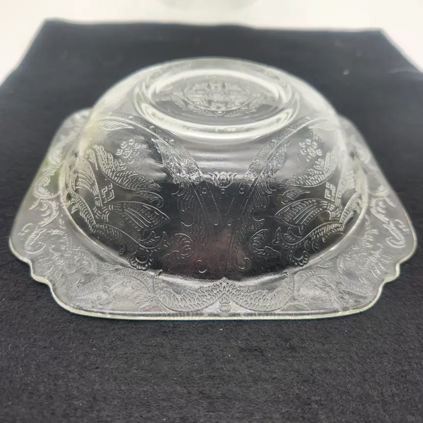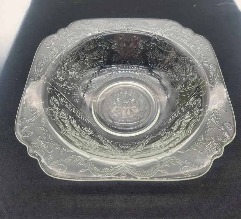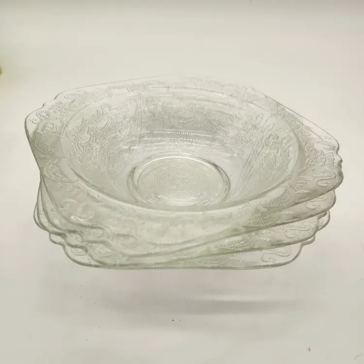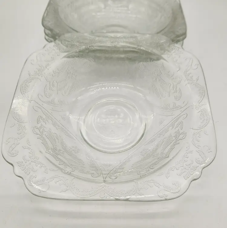 These 4 stunning bowls are a perfect example of Depression glass: the scalloped edges and floral and scroll design elements are characteristic of the Art Deco influence during that time. Produced by the Federal Glass Company of Columbus, OH, a leading maker of machine pressed glass that was often used as a promotional item - a strange bit of elegance during a solemn economic period. Madrid was one of their most popular patterns. Measurements: 6 7/8" square, 1 7/8" deep Like New Condition: no chips, cracks, or evidence of use.