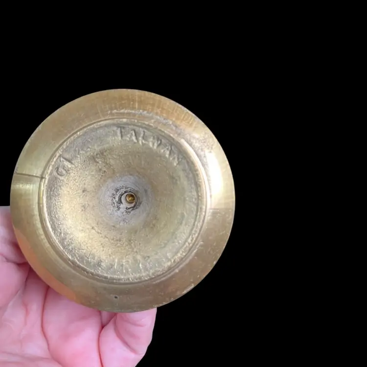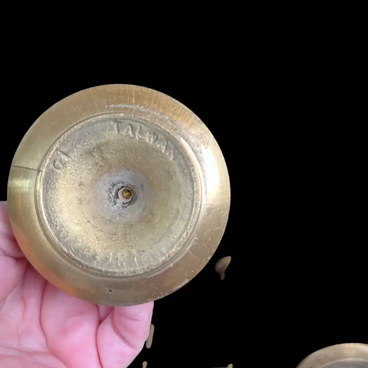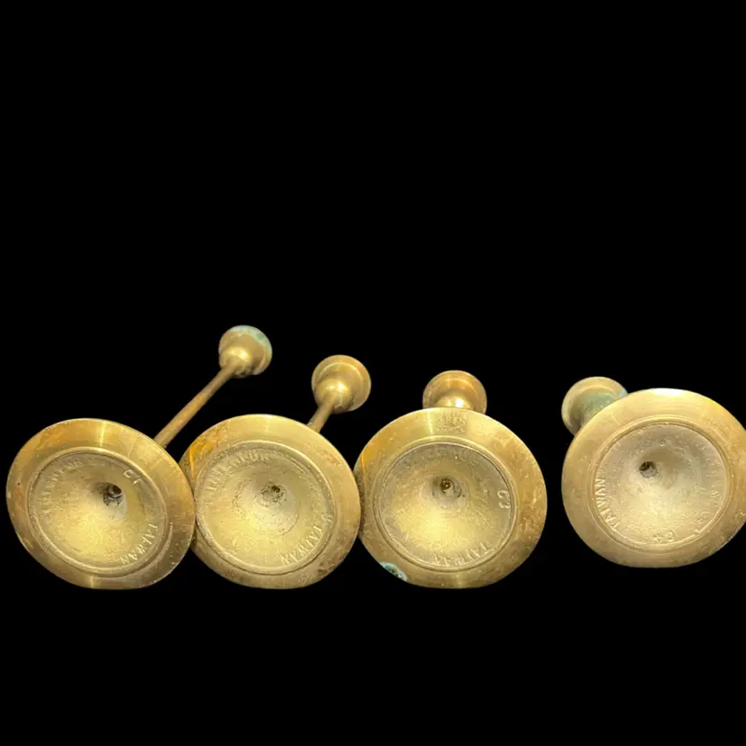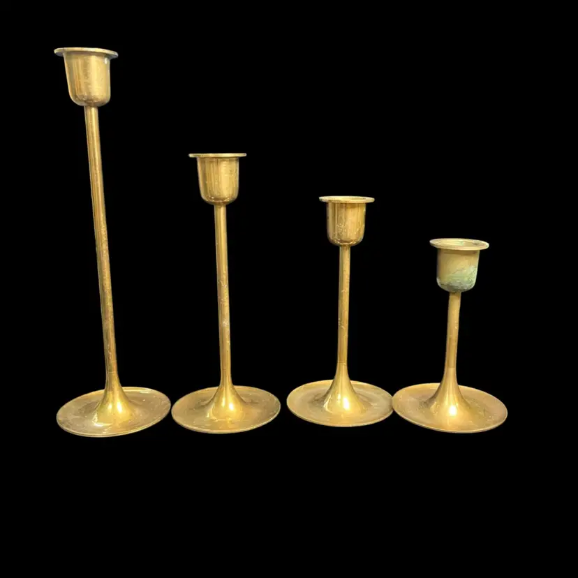 Has patina. The smallest has most patina-all could be easily polished w/ Brass polish. Use tapered candles, votives, display larger size marbles, smaller size orbs. Tallest to shortest approx height: 8", 6", 5" & 4" H, 2.5" diameter at each base, Together pre shipping wt is approx 12 Oz