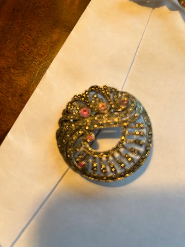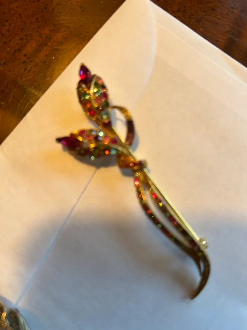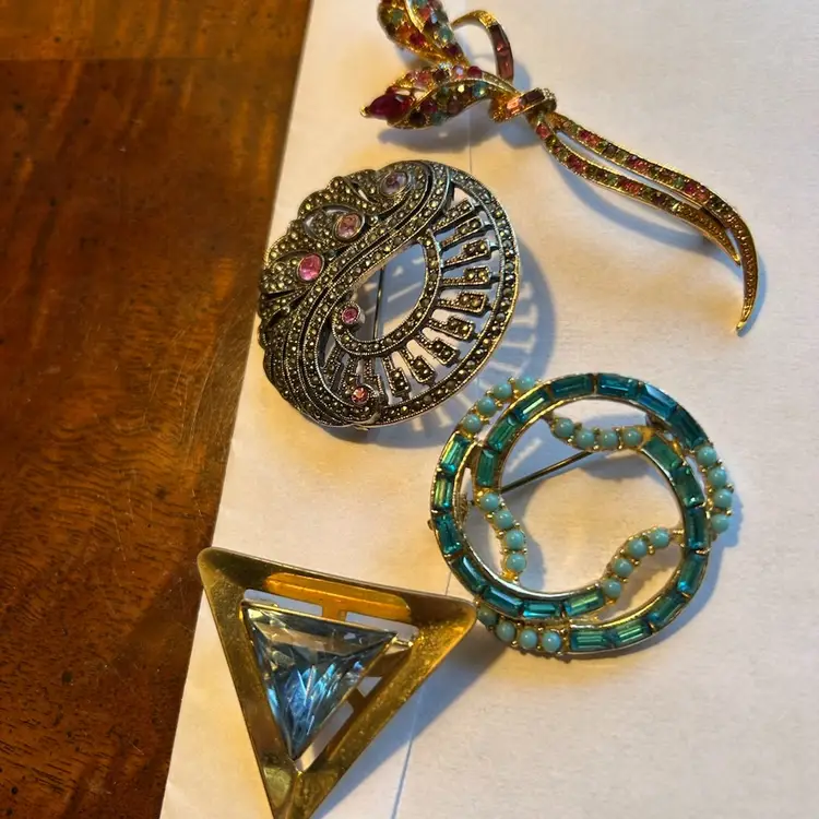 EMJ Edmond triangle pin, Intertwined circles rhinestone pin, 1928 Marcasite brooch, Rhinestone flower stem pin