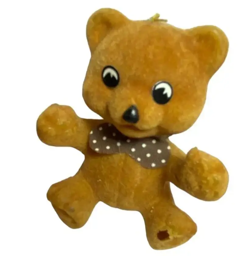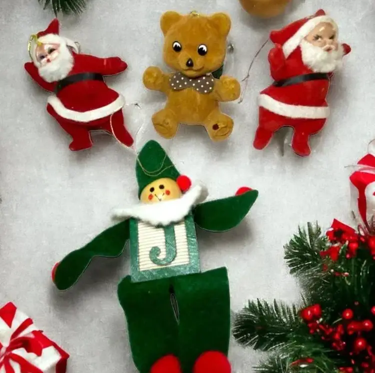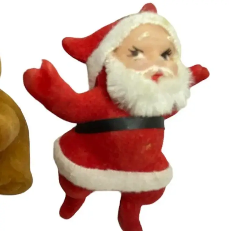 4 Vintage Christmas Ornaments 2 Flocked Santas, Bear, 1 Wooden Block Jester They range between 3.25 inches and 4.75 inches. Combined weight is 58 grams