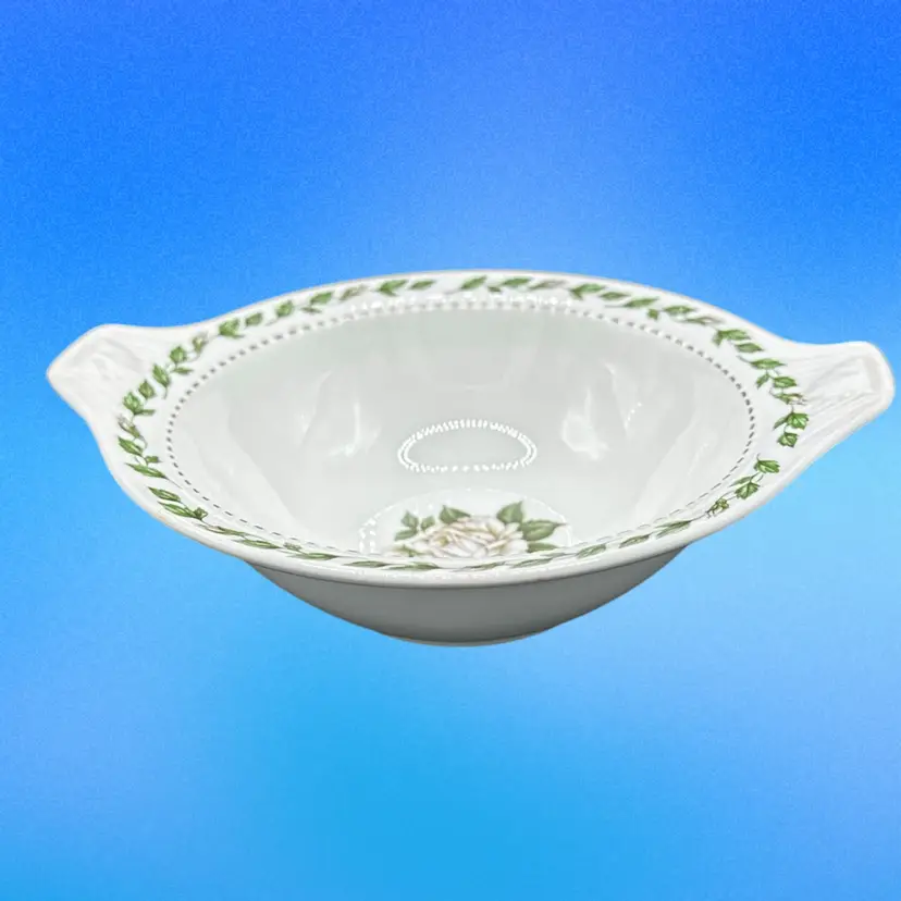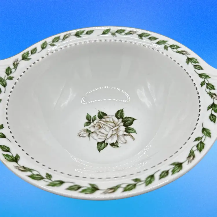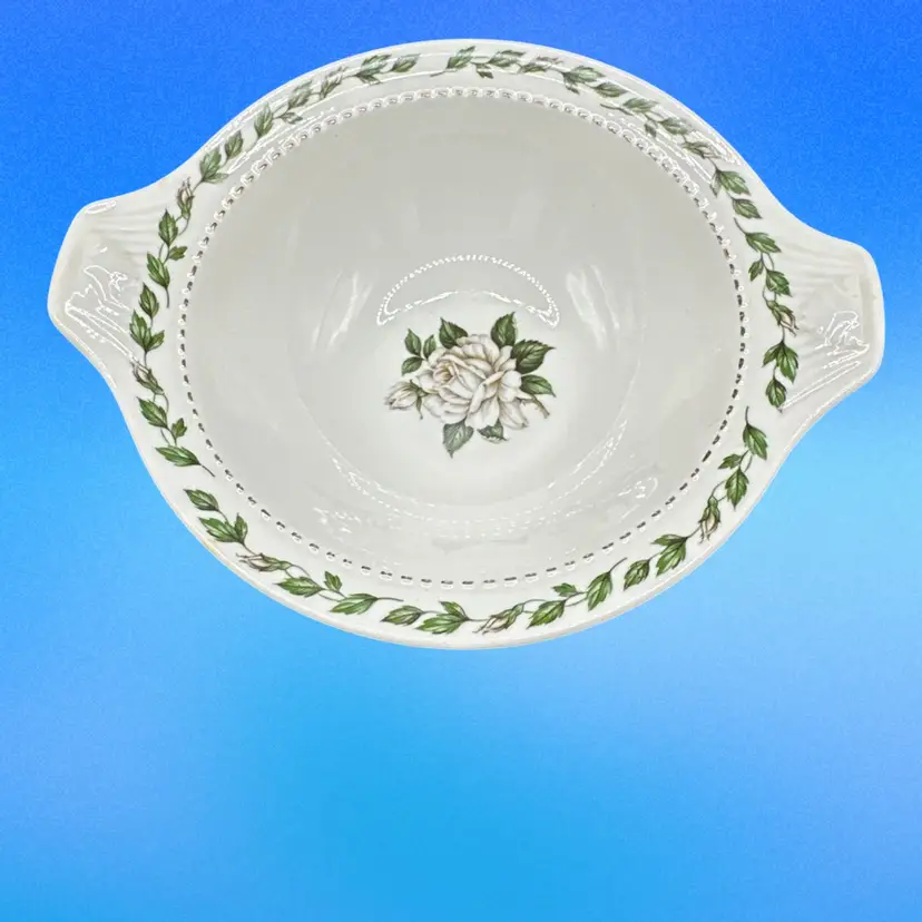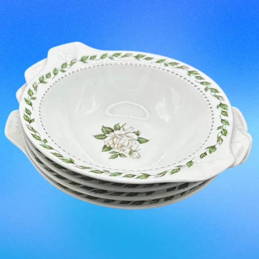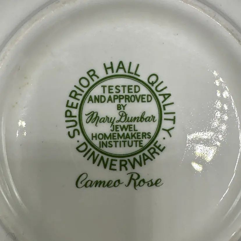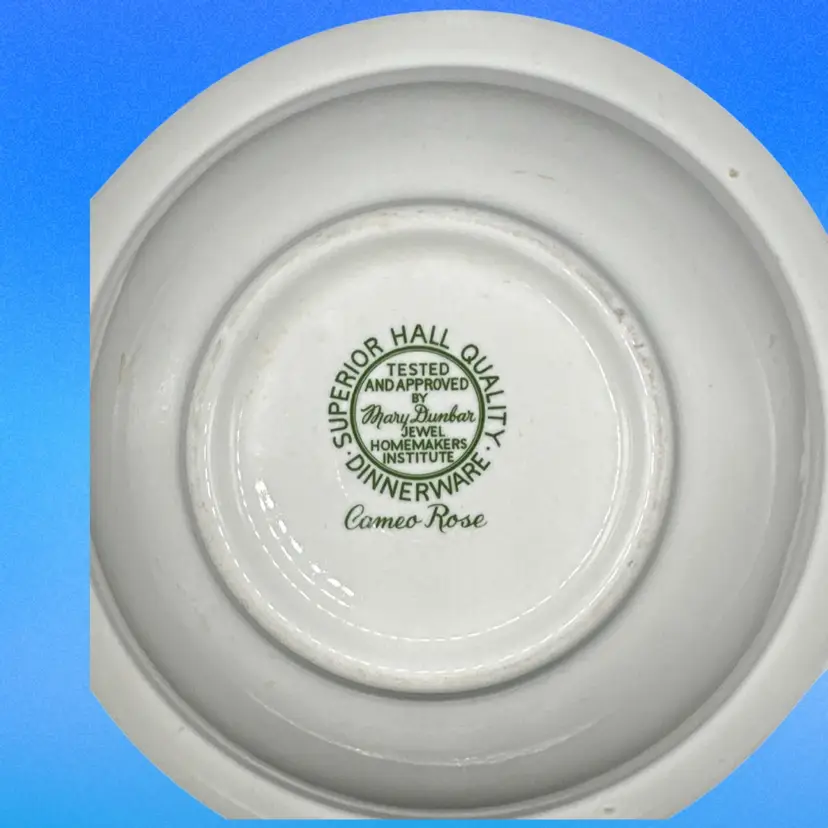 The product is a set of four vintage 1950’s Hall Superior China Jewel Mary Dunbar "CAMEO ROSE" tabbed cereal bowls. These bowls are part of the Toleware style, manufactured in the United States by the Hall brand. Perfect for collectors of dinnerware or those looking to add a touch of vintage charm to their kitchen. One bowl has a tiny chip on underside of handle as noted in the picture.