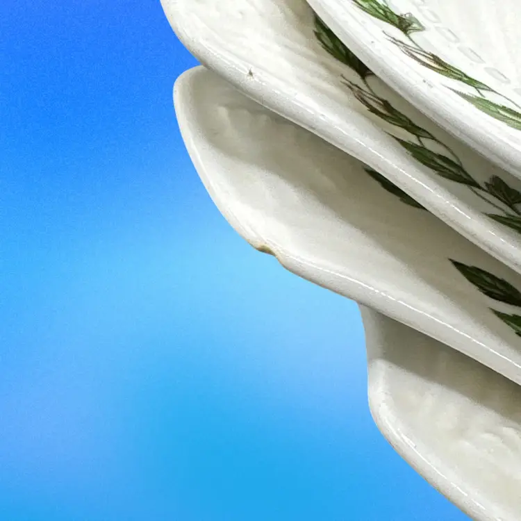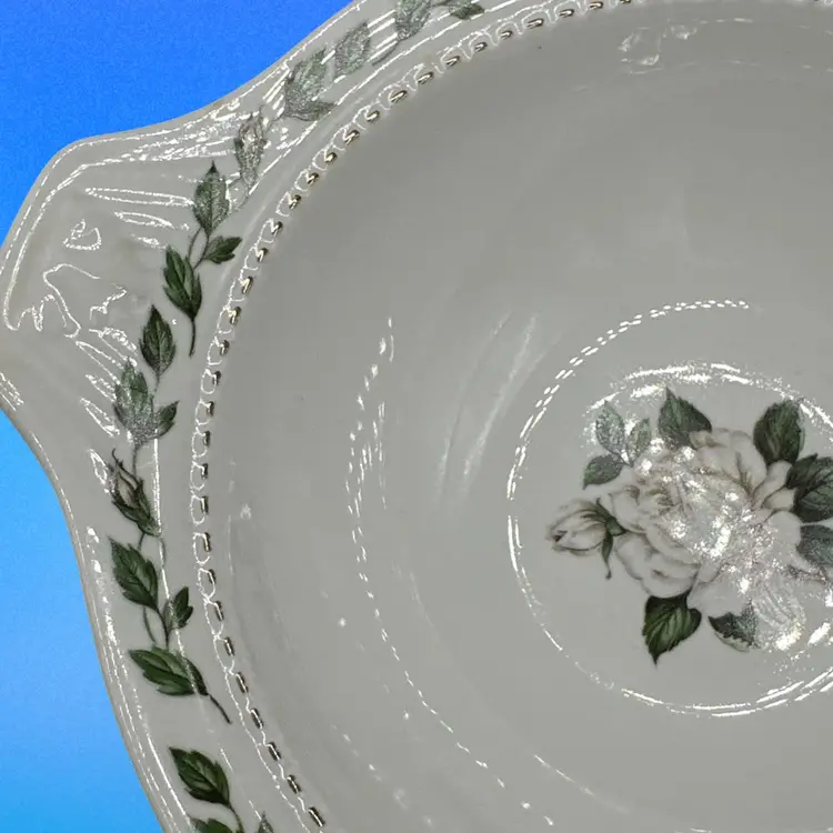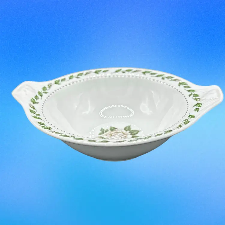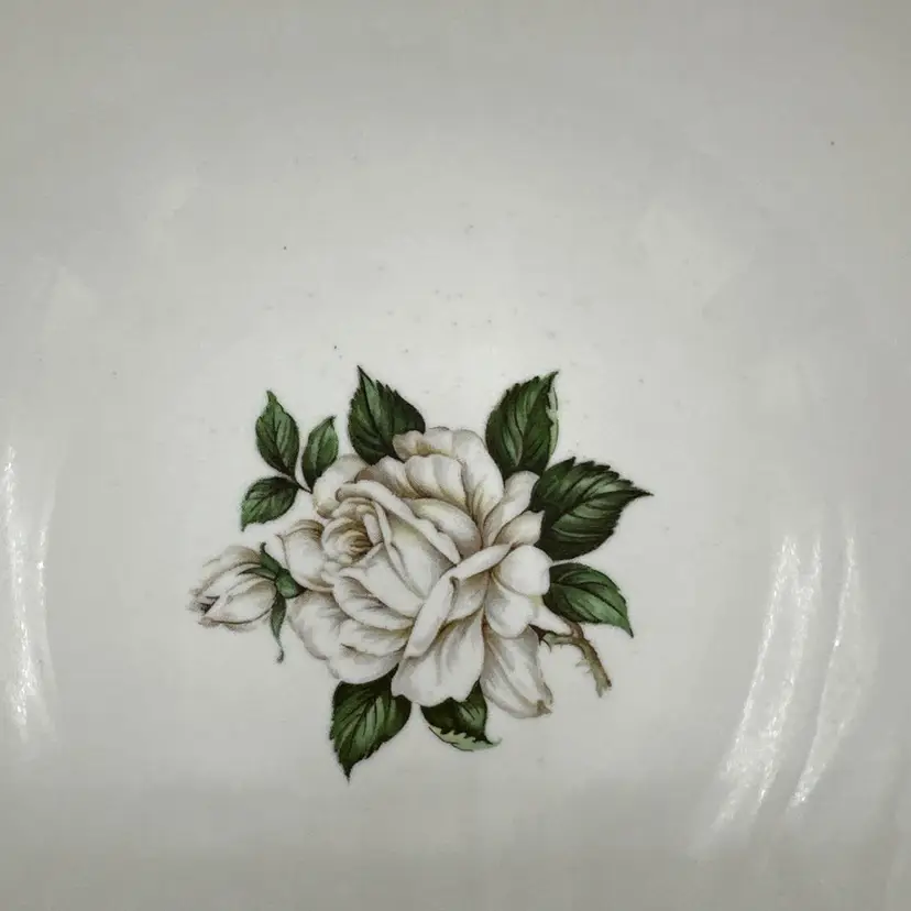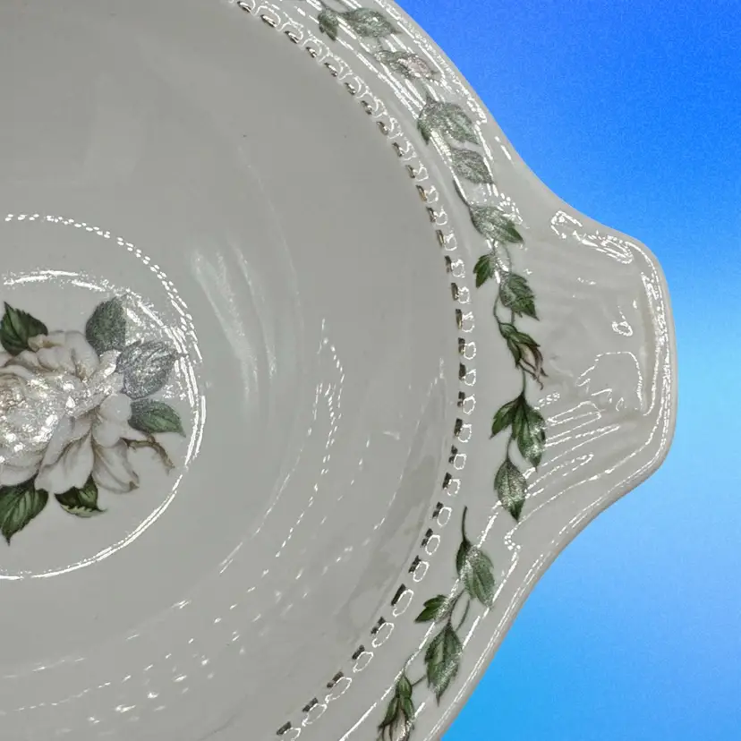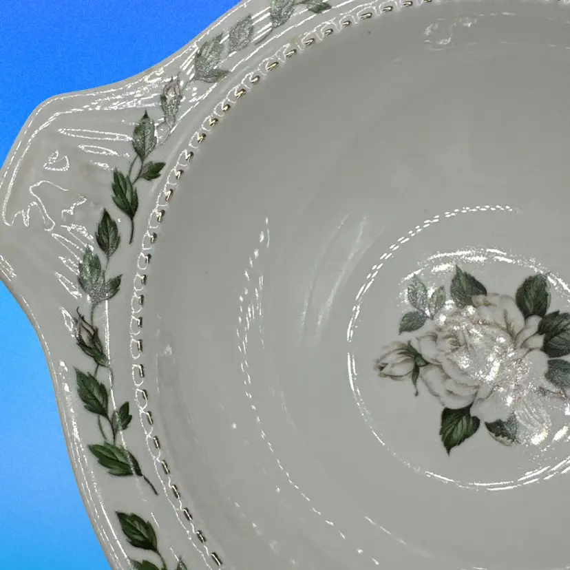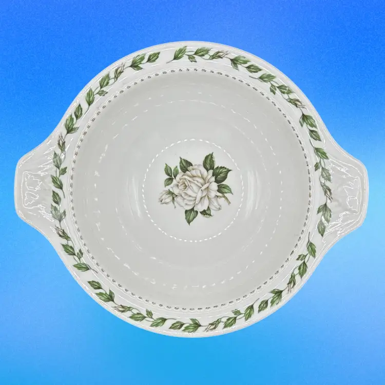 The product is a set of four vintage 1950’s Hall Superior China Jewel Mary Dunbar "CAMEO ROSE" tabbed cereal bowls. These bowls are part of the Toleware style, manufactured in the United States by the Hall brand. Perfect for collectors of dinnerware or those looking to add a touch of vintage charm to their kitchen. One bowl has a tiny chip on underside of handle as noted in the picture.