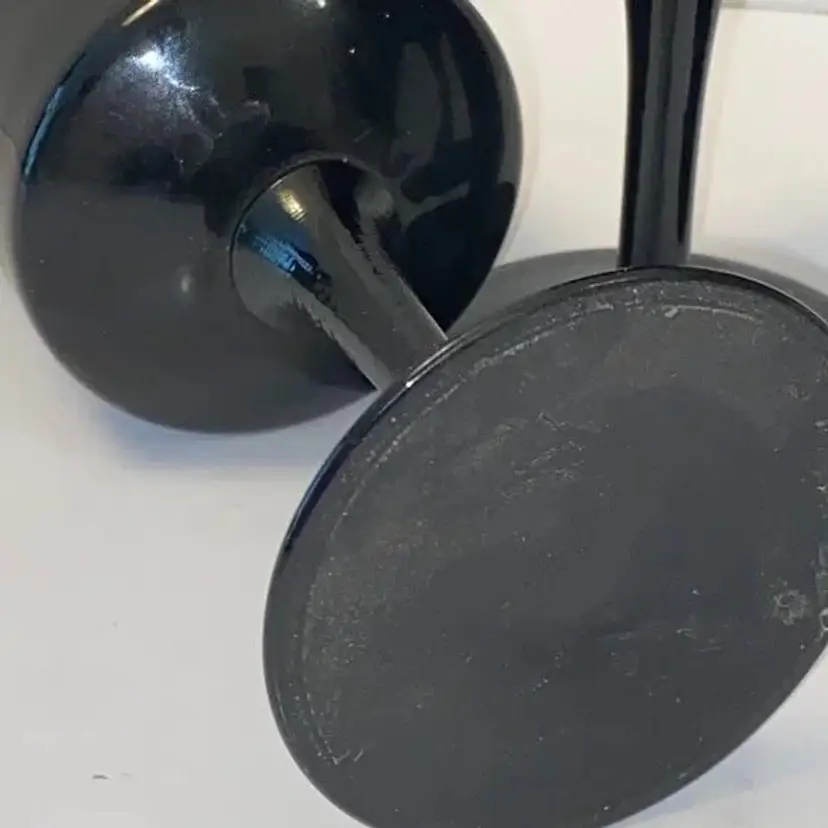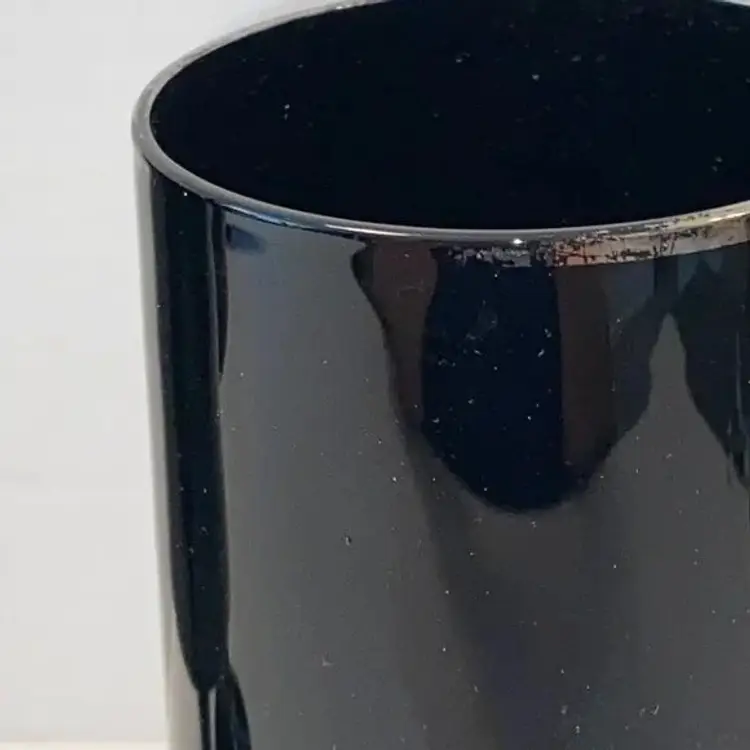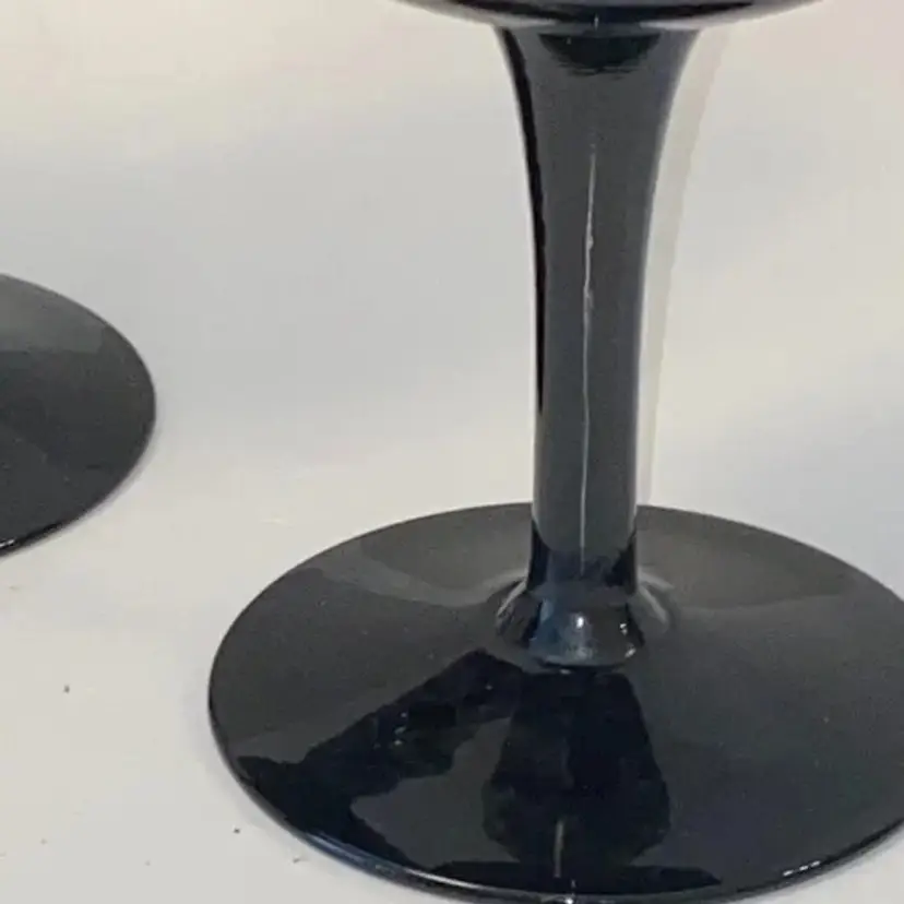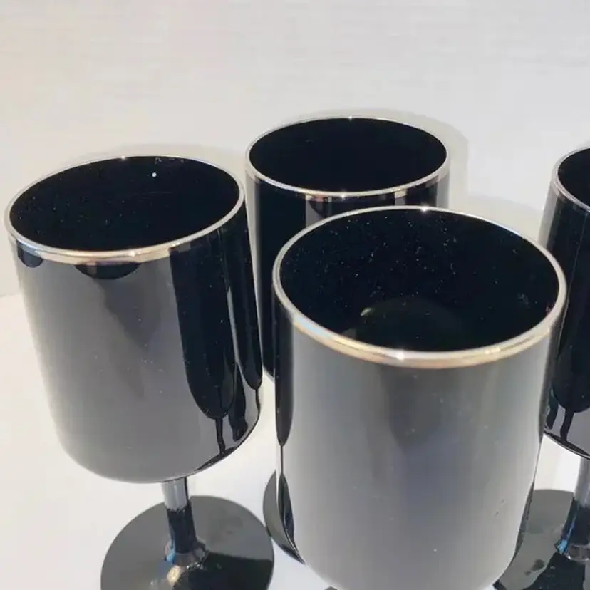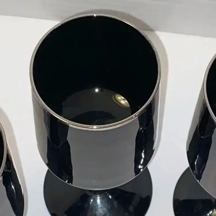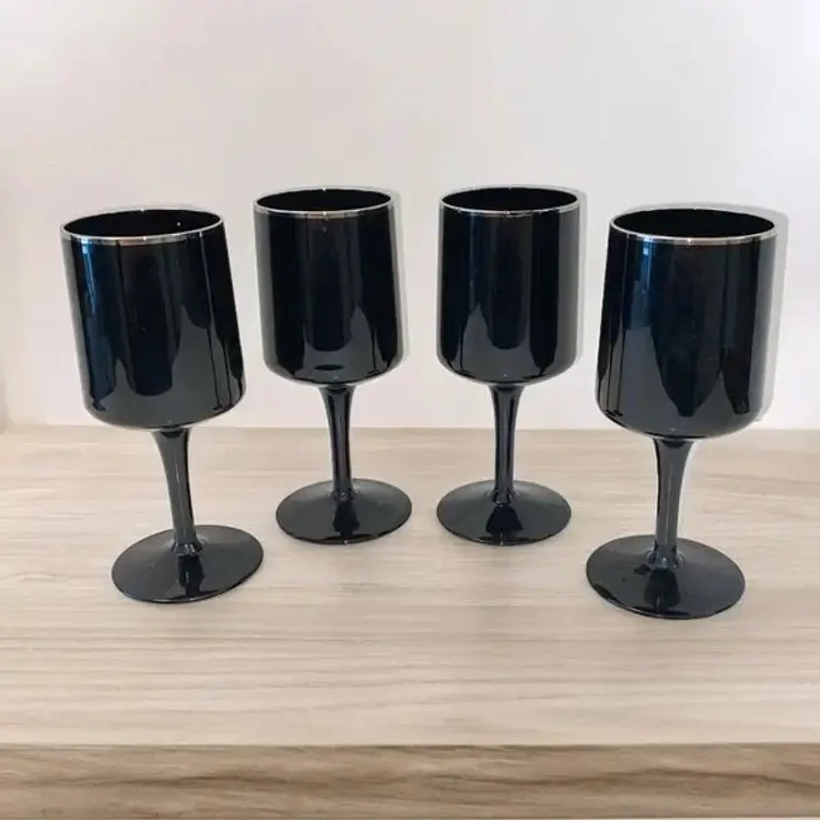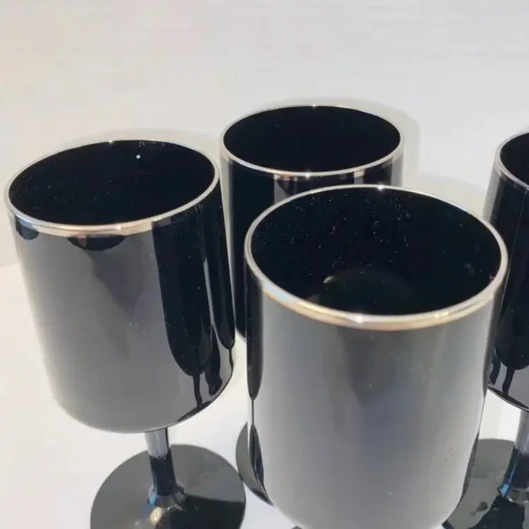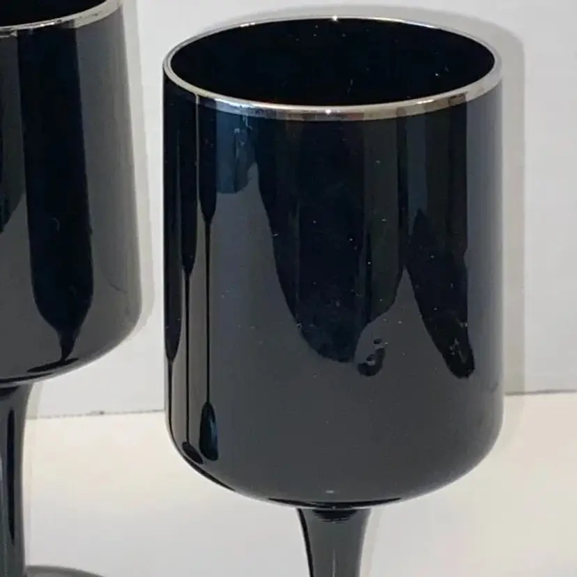 4 Vintage Lenox Black Glass Wine Bar Glasses Venture Black Platinum Trim Edges Dates back from the 1970s In very nice vintage preowned condition. Measure 6.25 inches high Combined weight is 553 grams