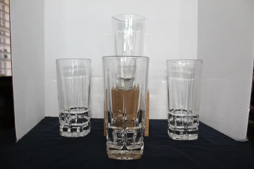 This product is a set of four vintage Libbey Squire Cooler Drinking Tumber glasses, featuring a square shape with heavy bottoms and a capacity of 16 oz. These mid-century modernist glasses are designed to keep beverages cold for 2 hours and are dishwasher safe. Manufactured in 1998 in the United States, these original glasses are ideal for all occasions and are a unique addition to any glassware collection. These glasses sell for $19.99 a glass on Replacements.com.