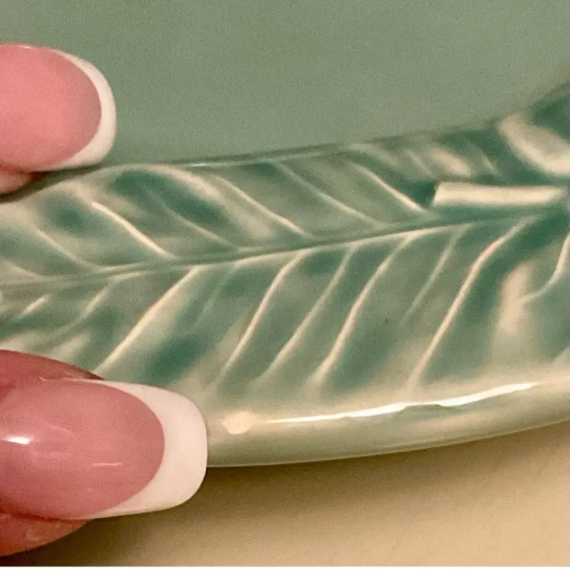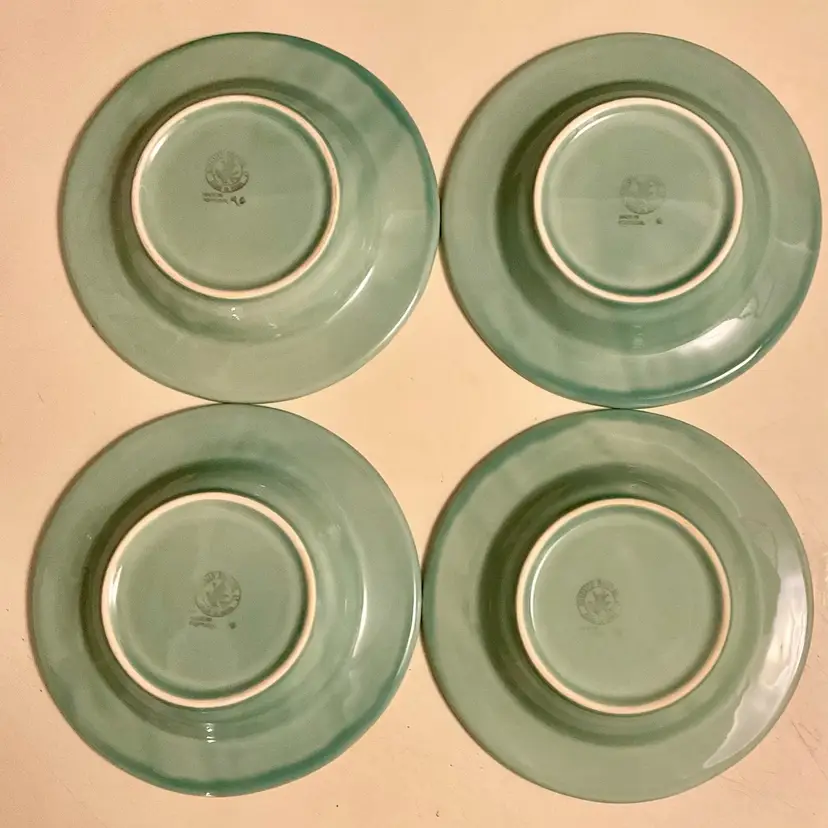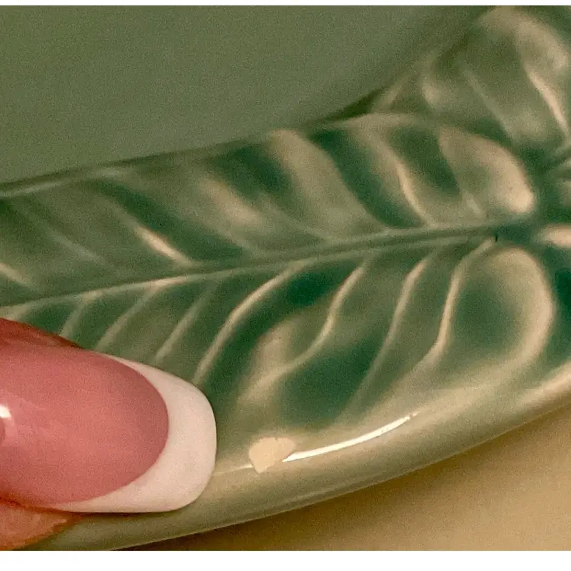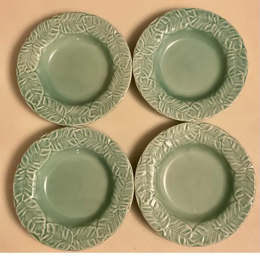Vintage Bordallo Pinheiro Leaf Rim Green Soup Bowl Portugal Set 4 2 have one small flea bite on the edge see photos