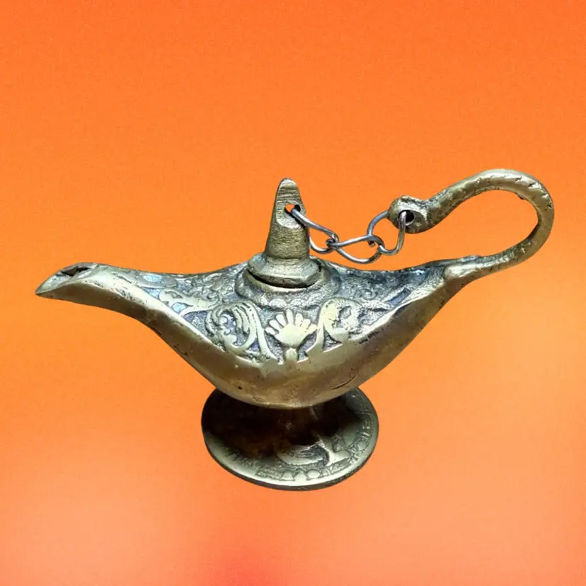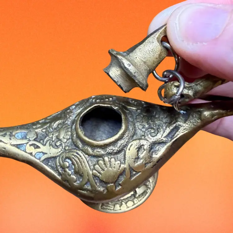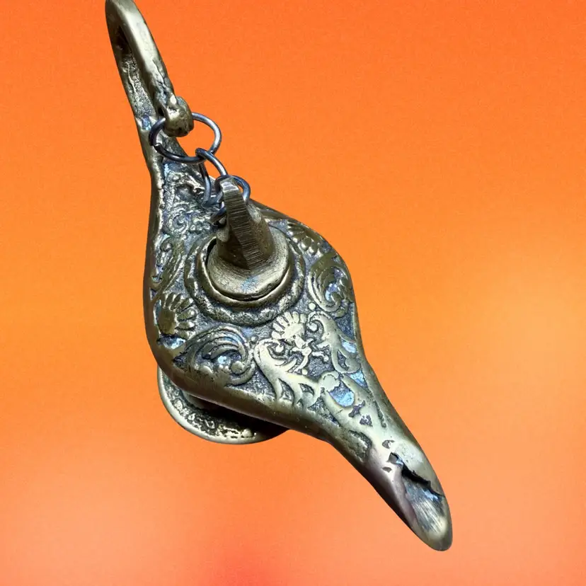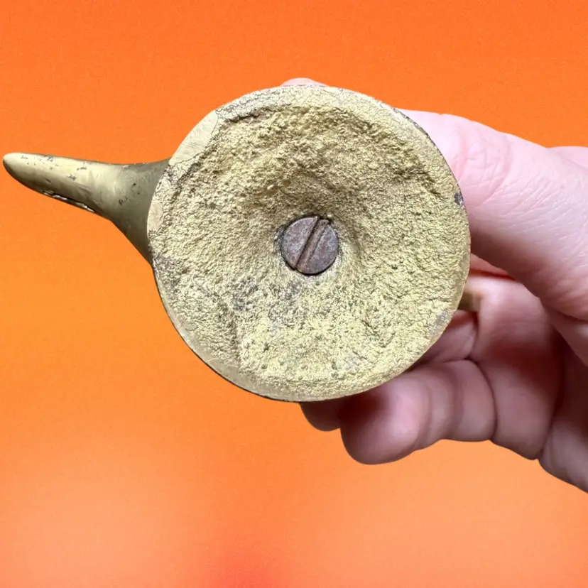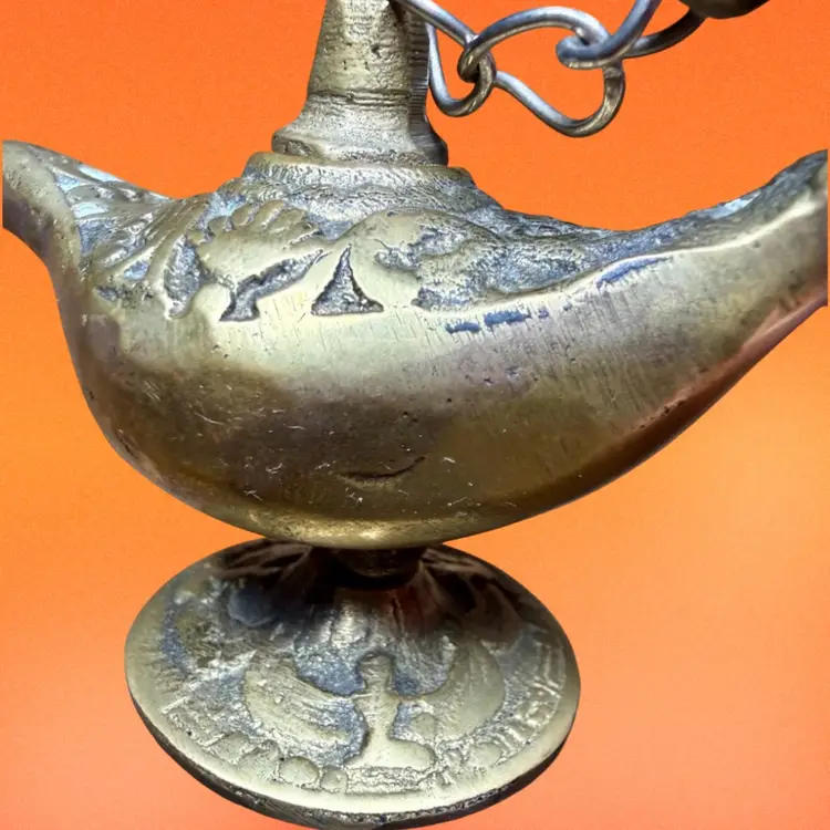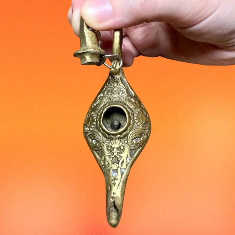 2.5”x4”. Small brass genie lamp, likely a souvenir from Egypt c. Late 19th century. Can possibly be used for incense. Has an ornate design, continued on the pedestal with a repeating design of a figure similar to the goddess Isis. Small lid is connected to handle by a chain. No stickers or makers marks. NOTE has some patina/tarnishing, visible by some light colored spots in the design.