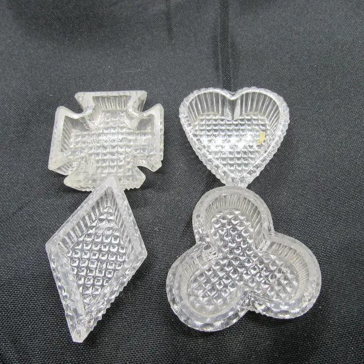 4 Vtg Clear Pressed Glass Glass Open Salt Cellars - Heart, Club, Diamond, Iron Cross
