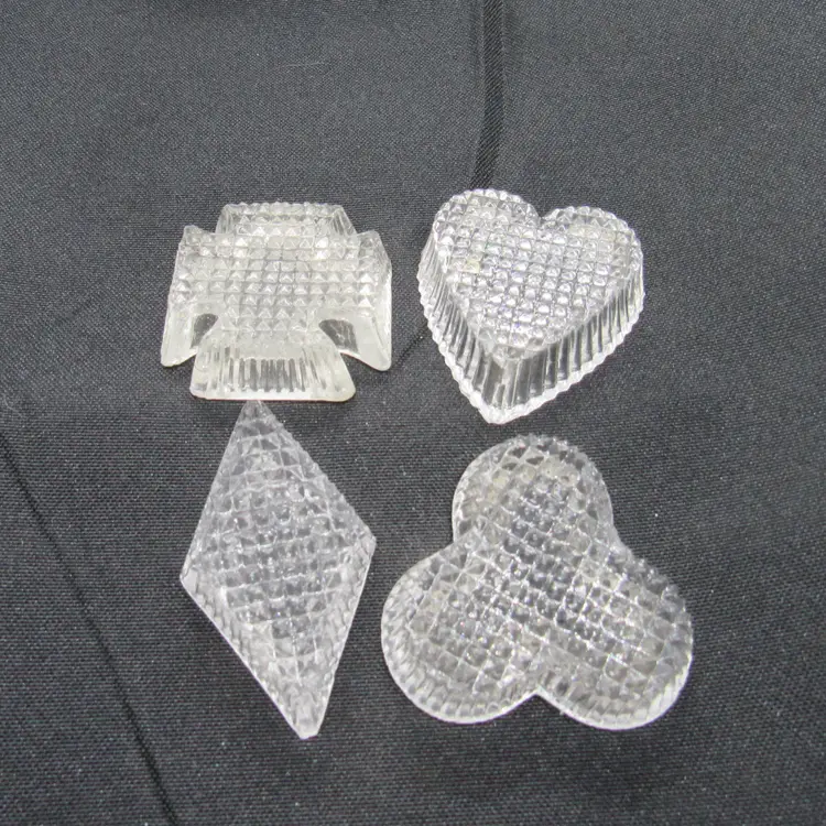 Heart - 1 3/4" x 1 5/8" x 1/2" Minor chipping on rim Iron Cross - 1 1/2" x 1 1/2" x 1/2" Minor chipping on rim Club - 1 3/4" x 1 3/4" x 1/2" - Minor chip on rim Diamond - 2" x 1 1/8" x 1/2" no issues