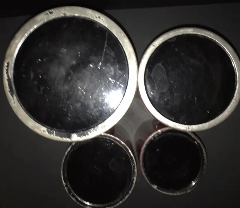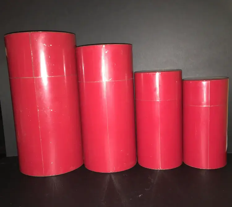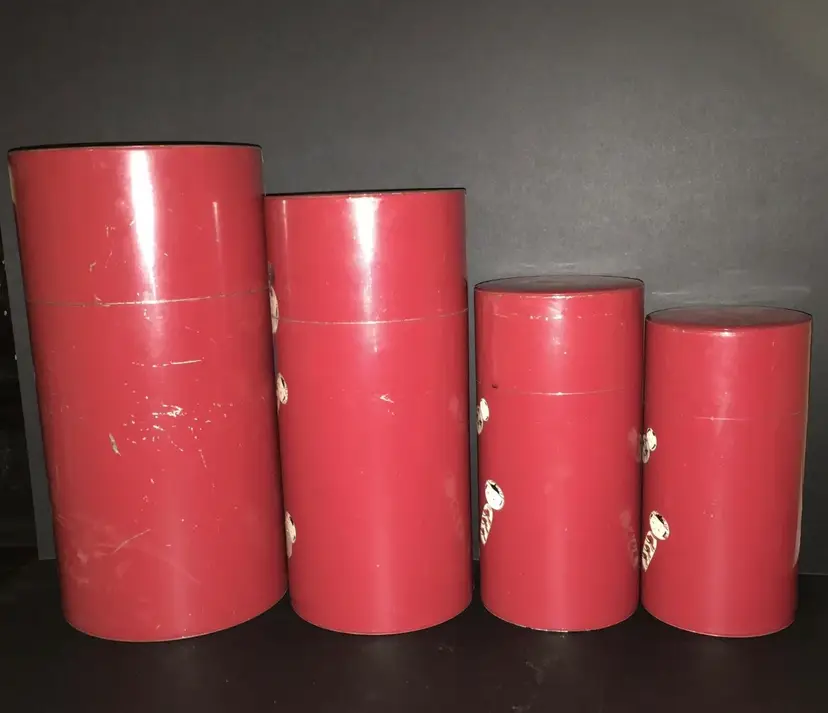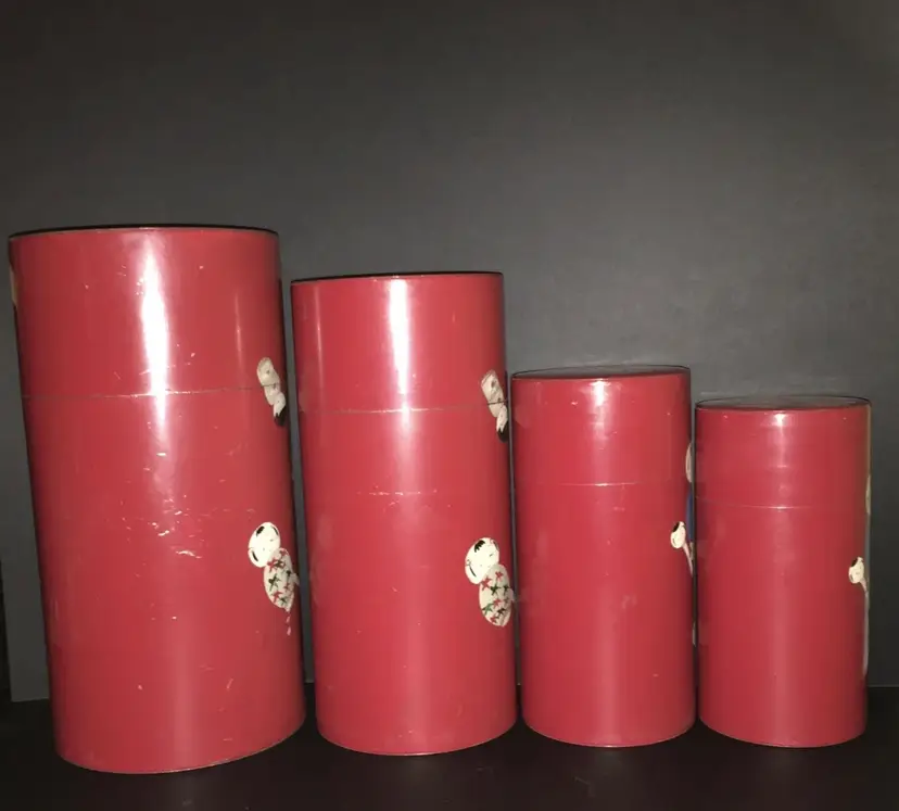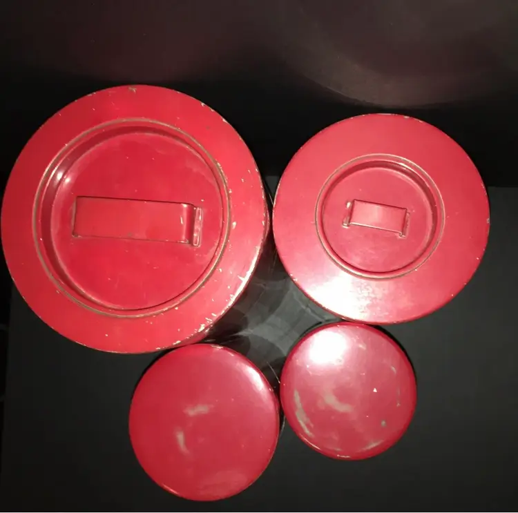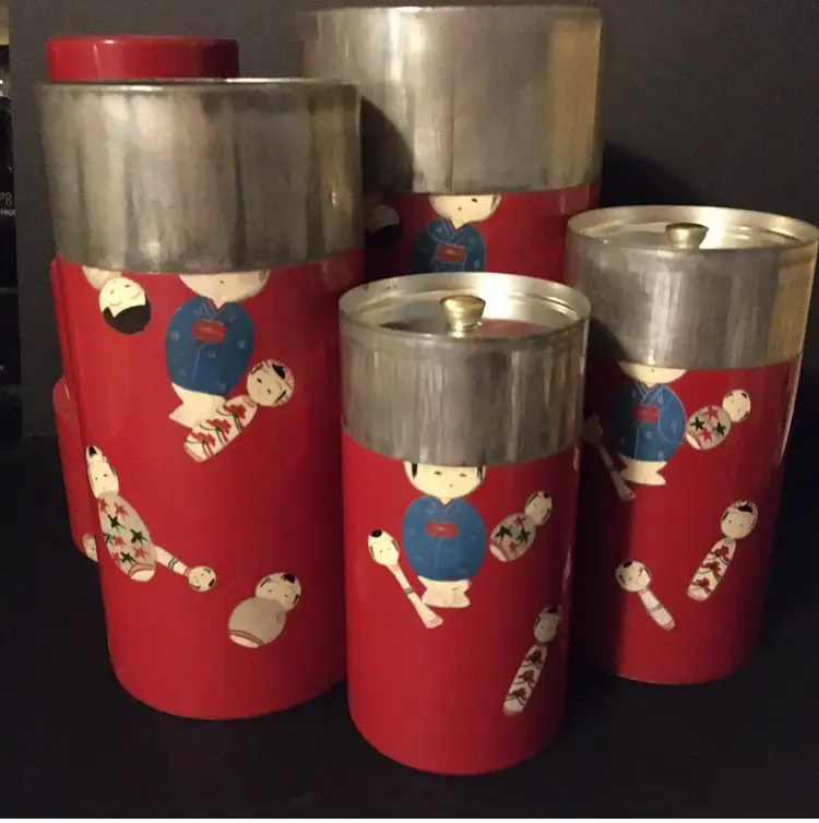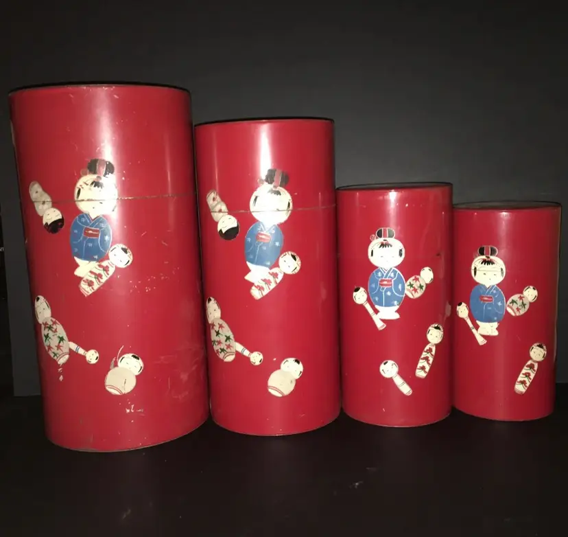 Beautiful red descending nesting canisters with kokeshi dolls on front. There is scratching to the paint throughout. See pics. No dents. Lids close tightly & take a little twisting to remove.