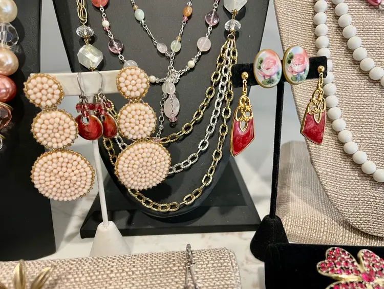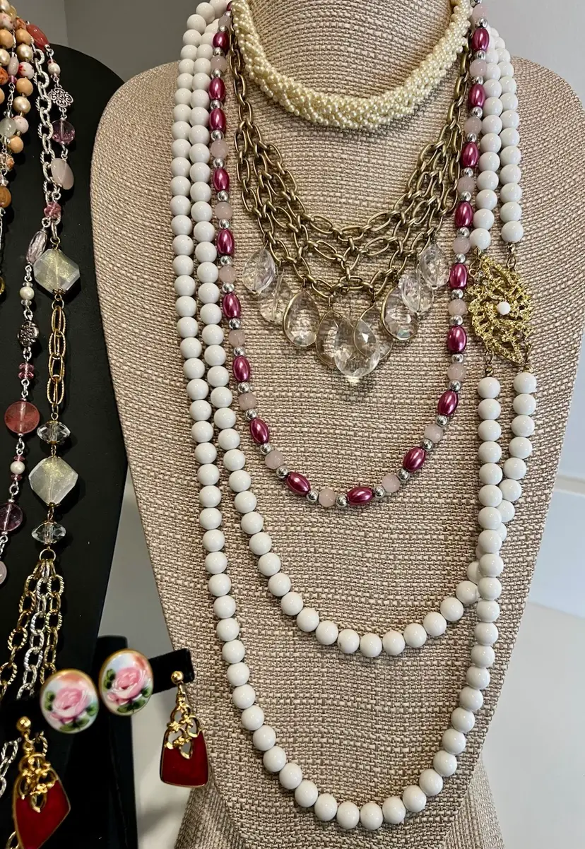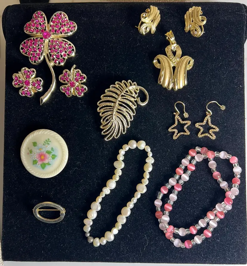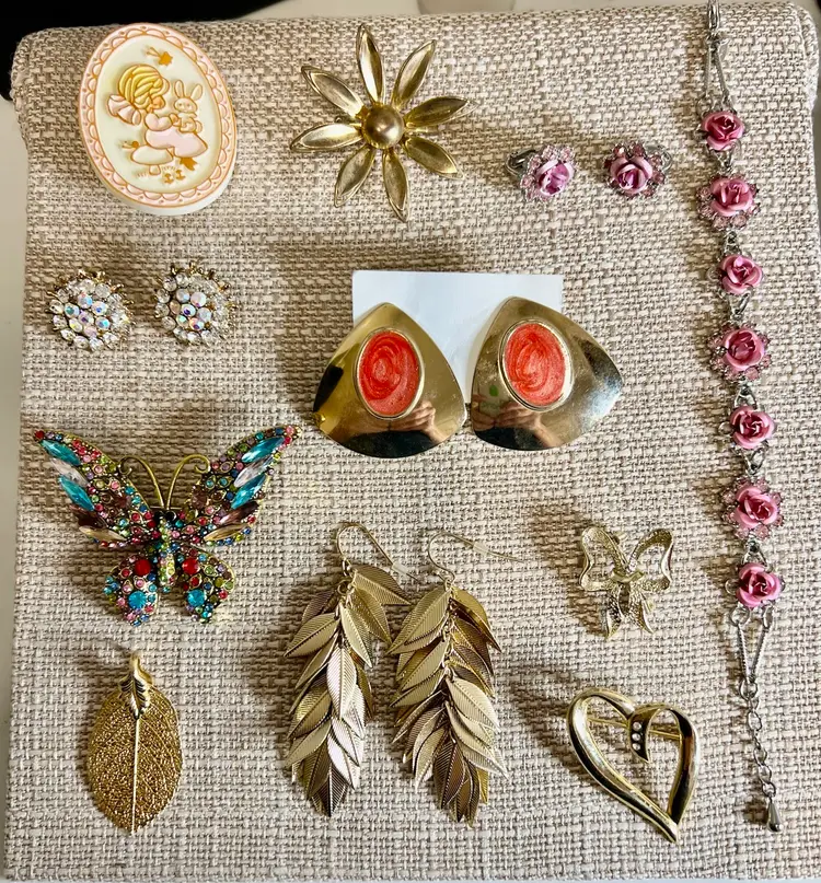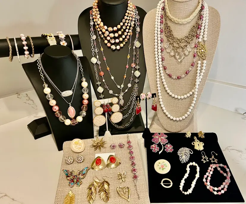 11- necklaces 8- earrings 9- bracelets 8-brooches 1-pendant gold leaf 1-sarah cov brooch/clip earring set 1-goldtone pendant/pierced earring set 1-avon rose silvertone bracelet/clip earring set