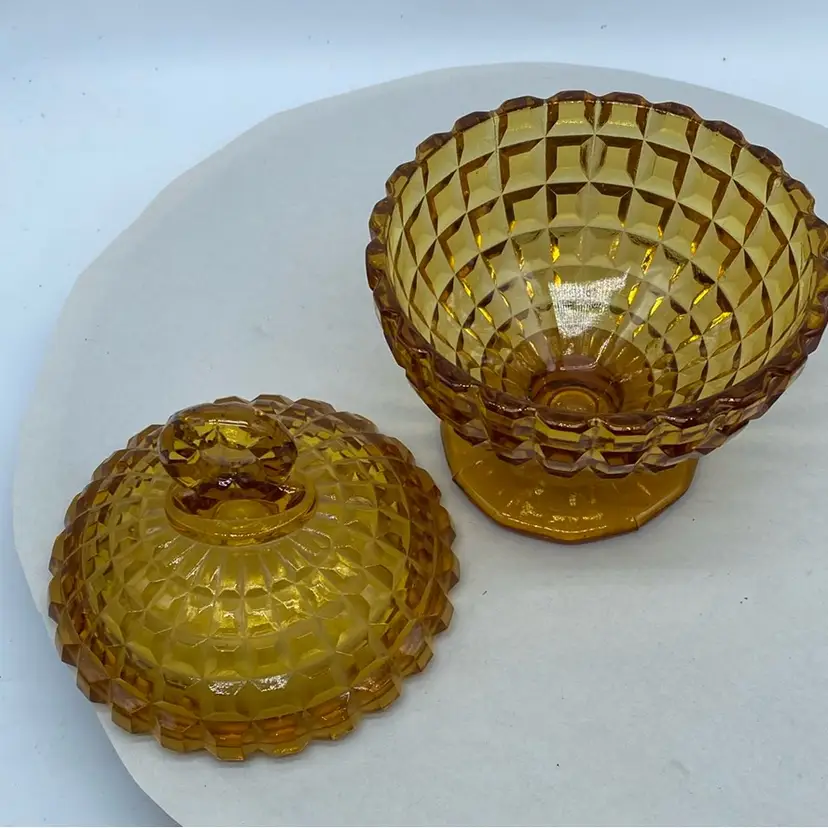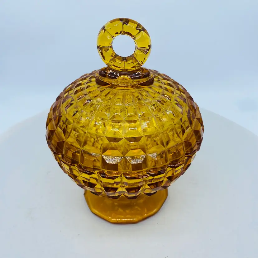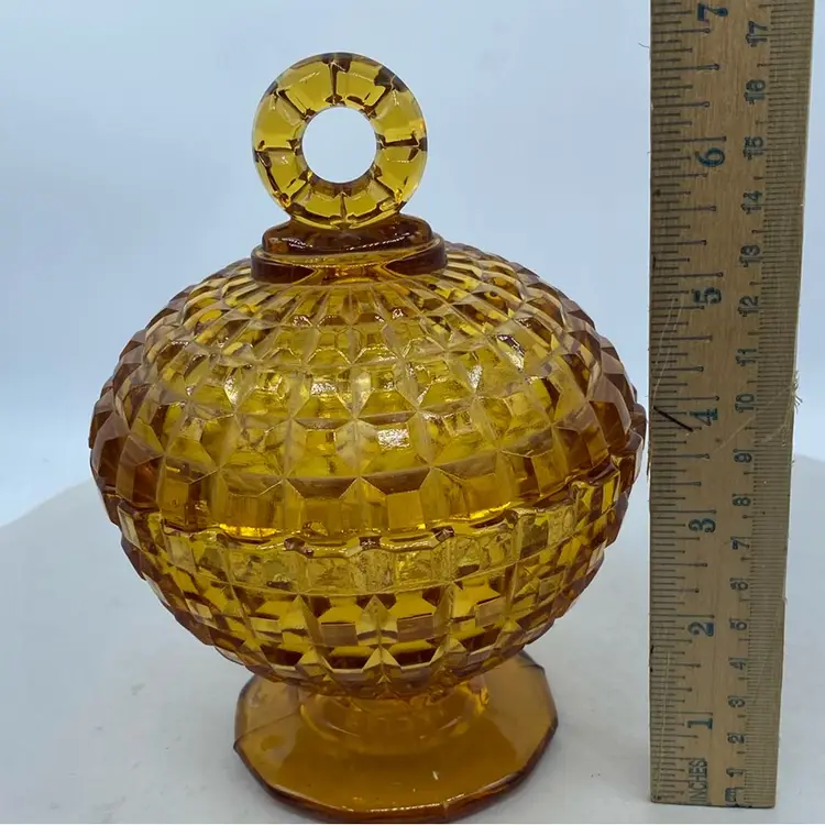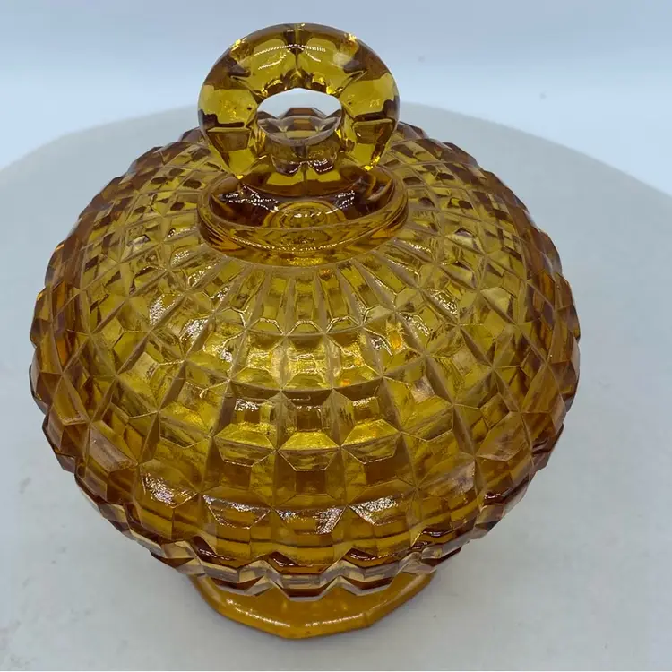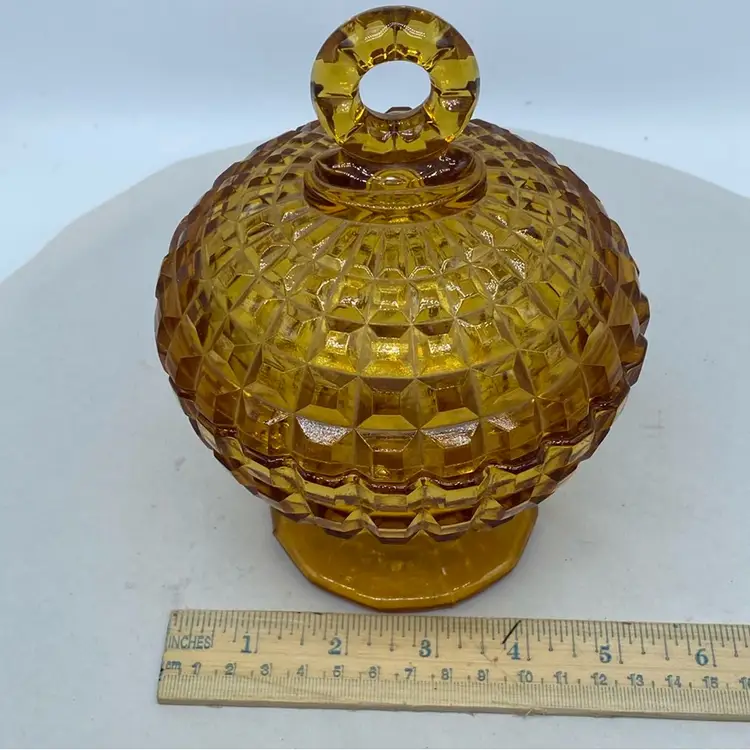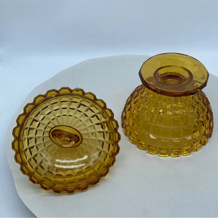 Vintage Amber Gold Glass Candy Dish with Lid and optic pattern. Round finial. No chips or cracks Mid century pressed glass Approx 5 x 7 inches