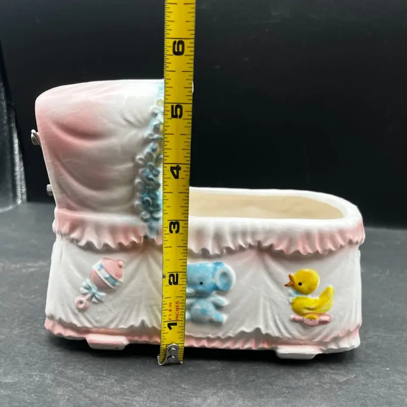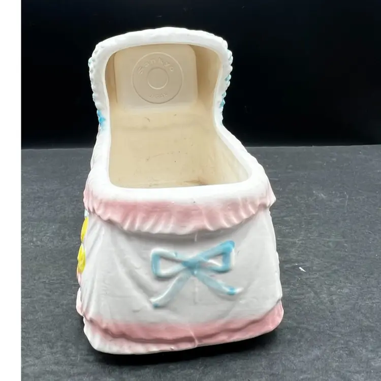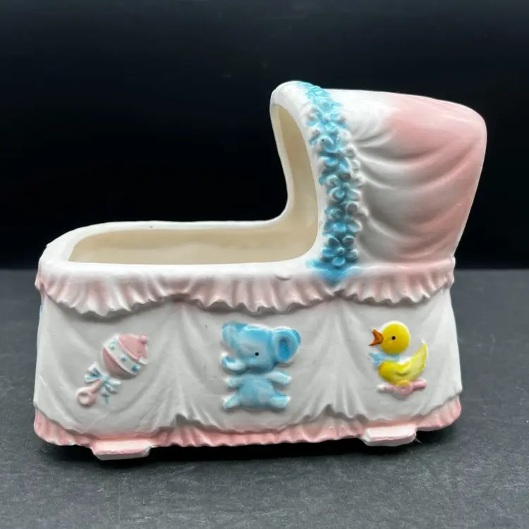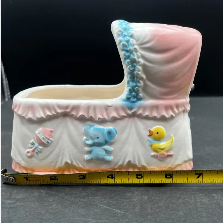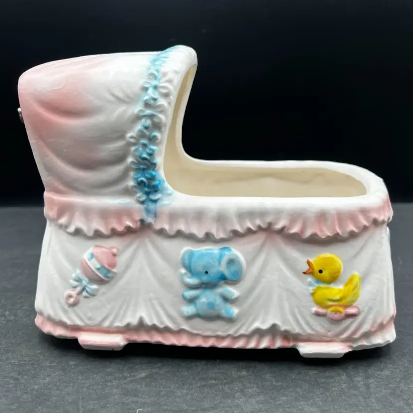Vintage Napcoware Japan Musical Baby Theme Bassinet Planter, Elephant, Duck And Rattle Plays ‘Go To Sleep Little Baby’ song and has a switch that can turn it on or off In excellent condition, no chips or cracks. 7” long x 5 1/4” tall x 4” wide