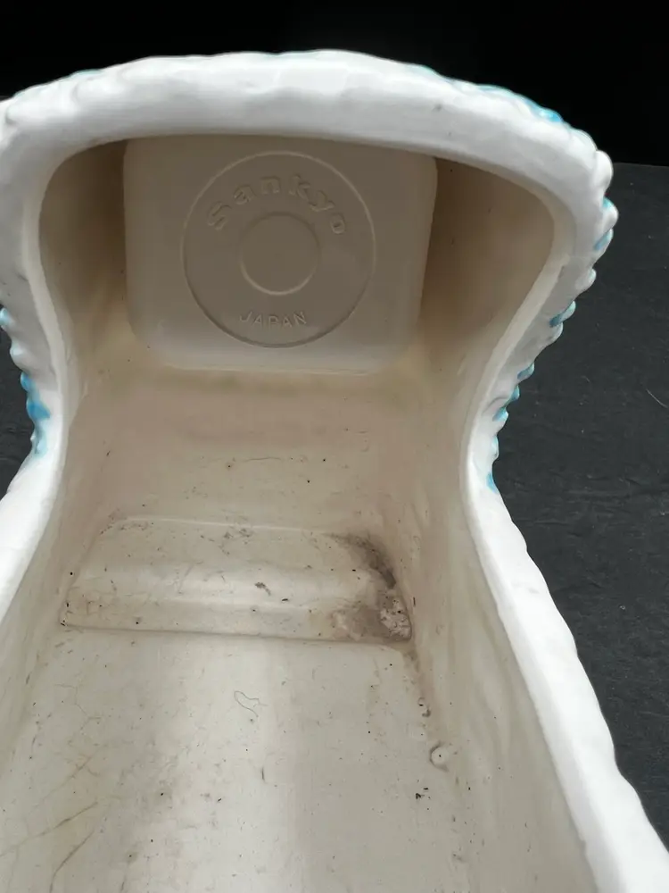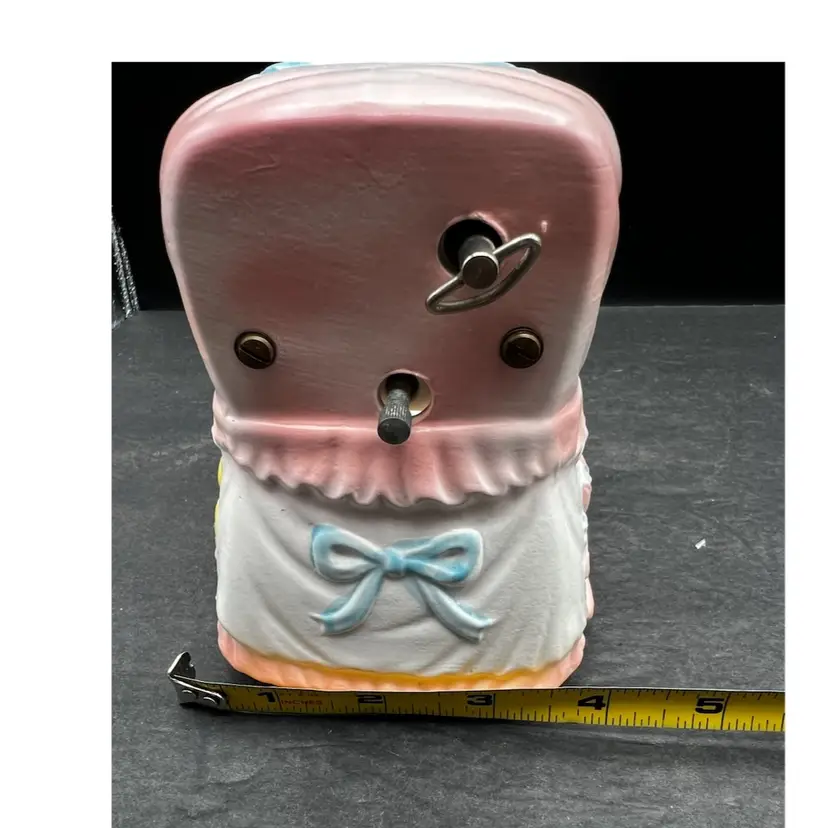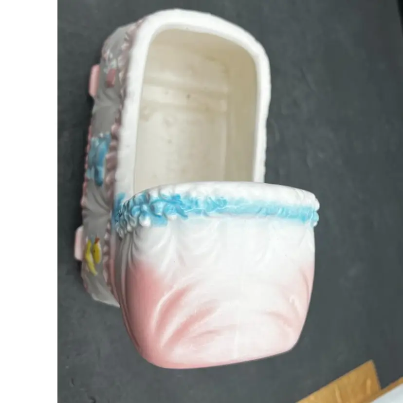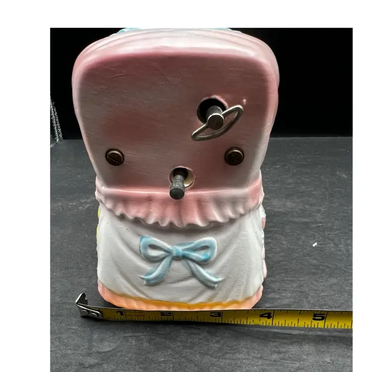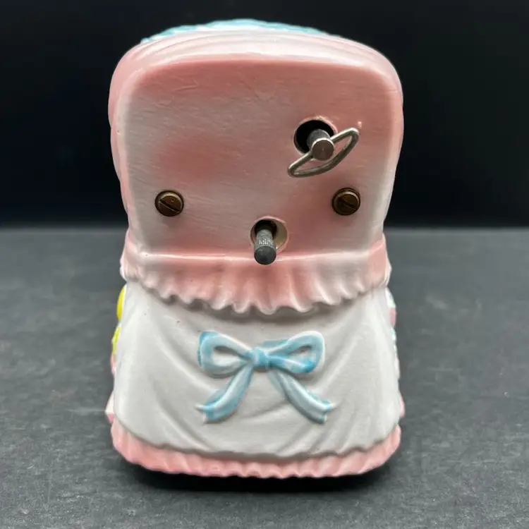 Vintage Napcoware Japan Musical Baby Theme Bassinet Planter, Elephant, Duck And Rattle Plays ‘Go To Sleep Little Baby’ song and has a switch that can turn it on or off In excellent condition, no chips or cracks. 7” long x 5 1/4” tall x 4” wide