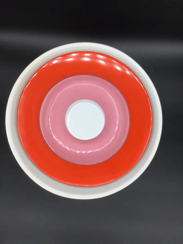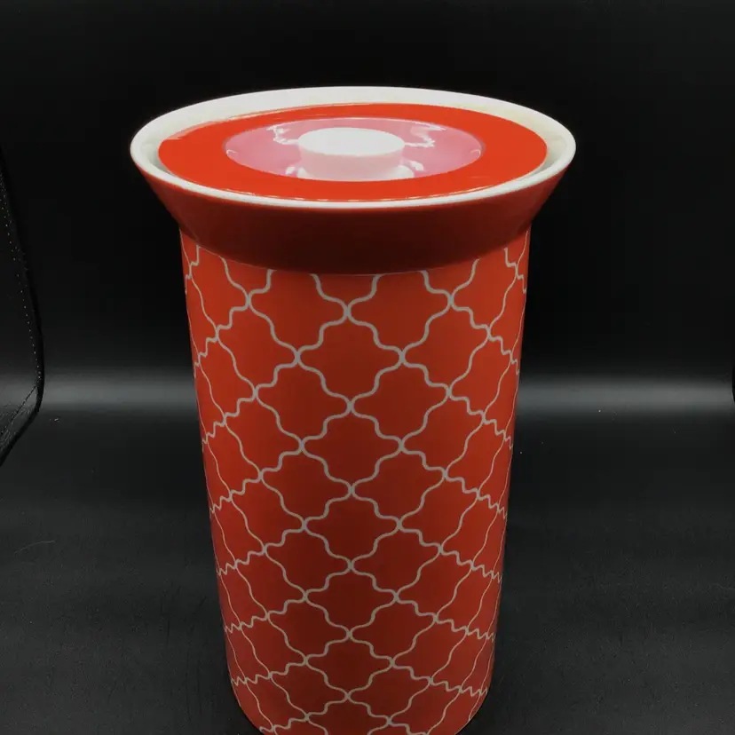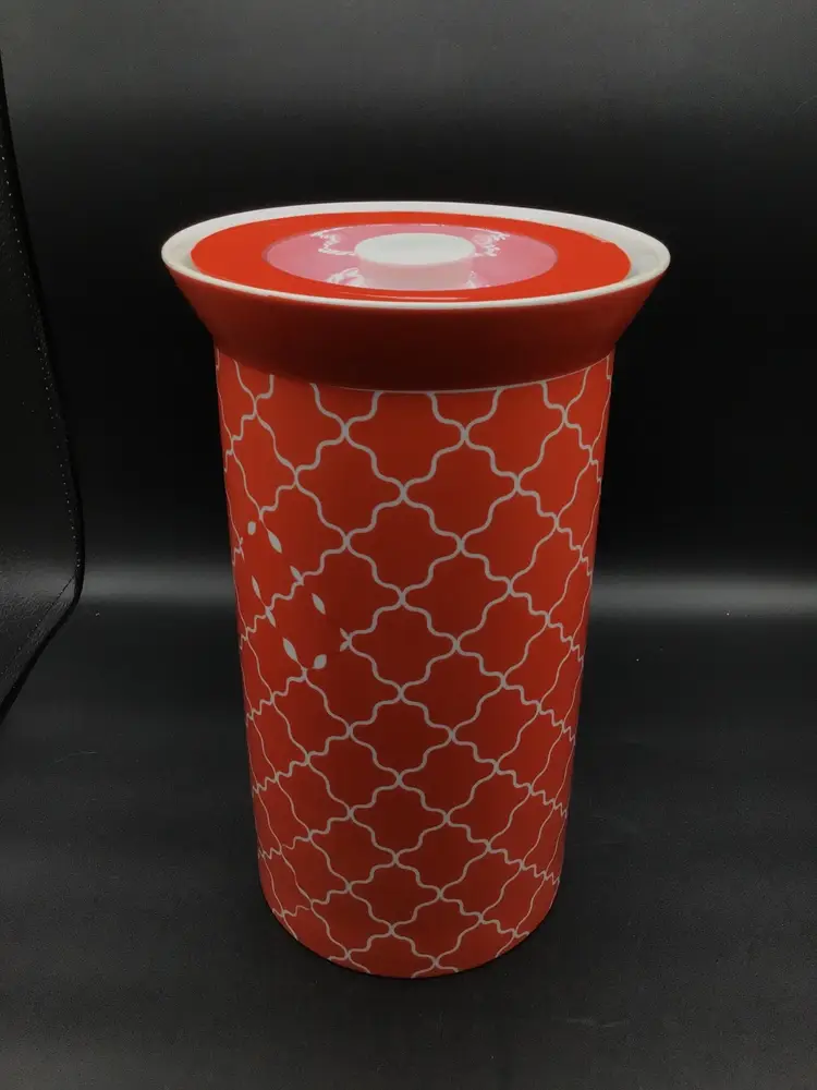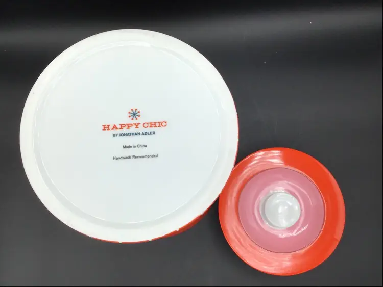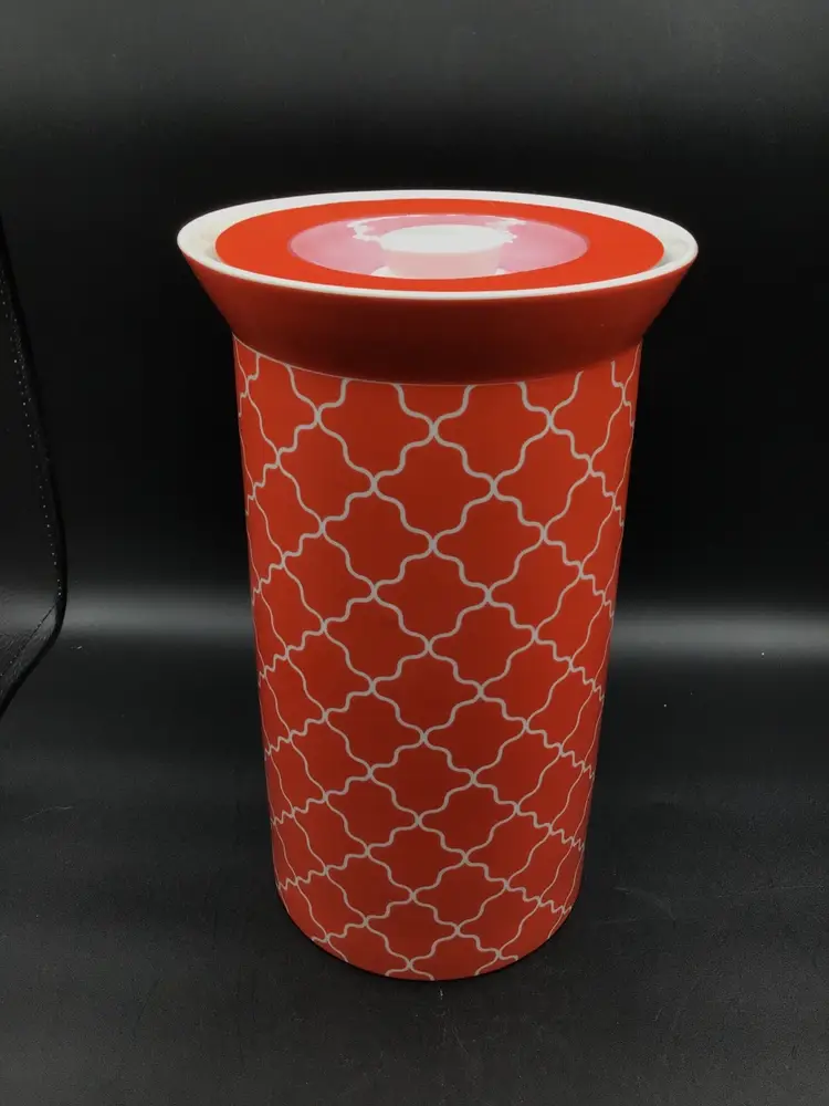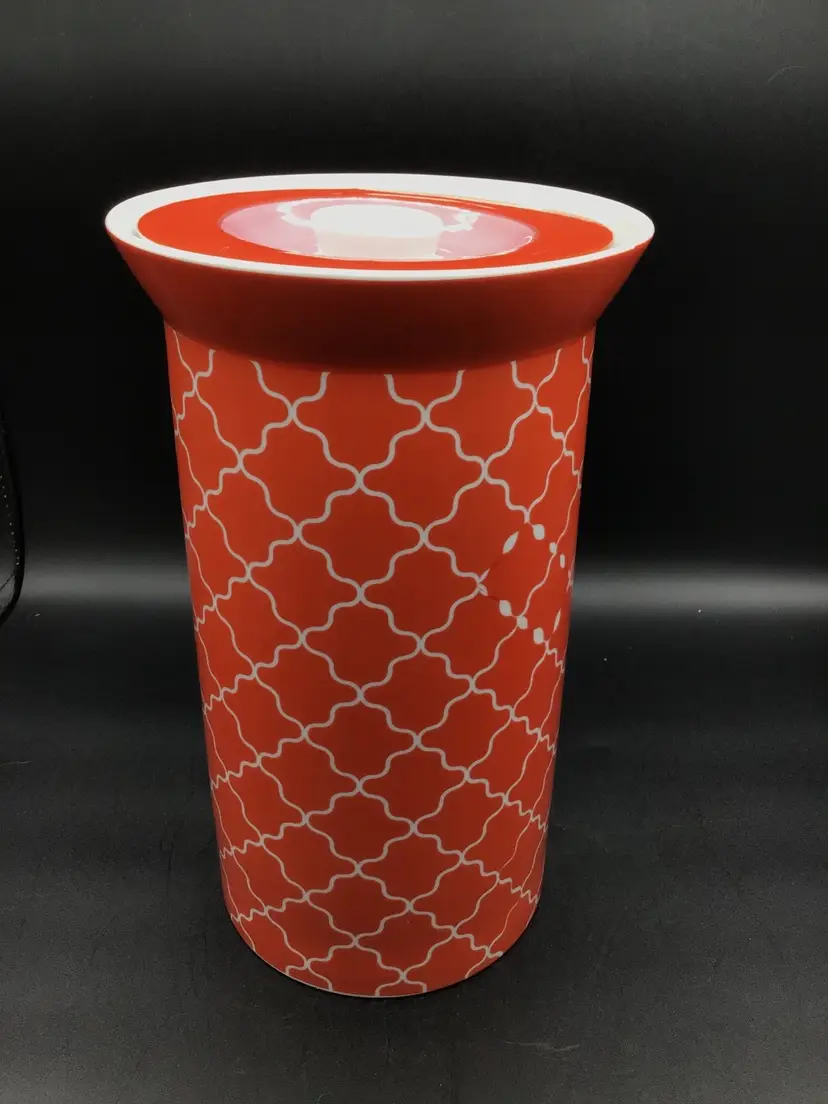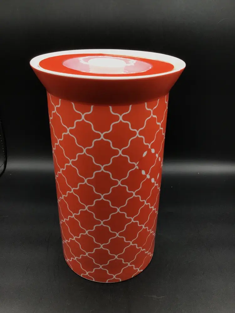 Beautiful orange MCM style, Jonathan Adler canister in the happy chic pattern. The stands just under 10 inches tall and 6 inches across the top. There are no chips, cracks, or flea bites. There is a manufacturing flaw in the pattern on the canister which is shown in the pictures. Please see pictures for complete description, measurements and conditions.