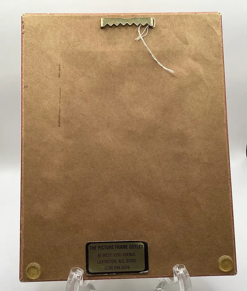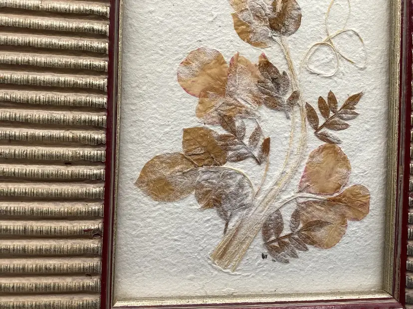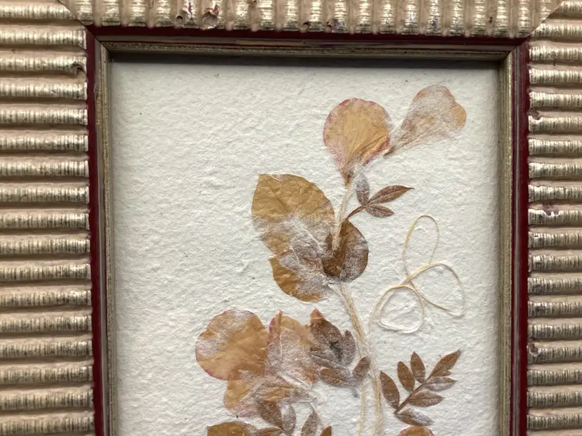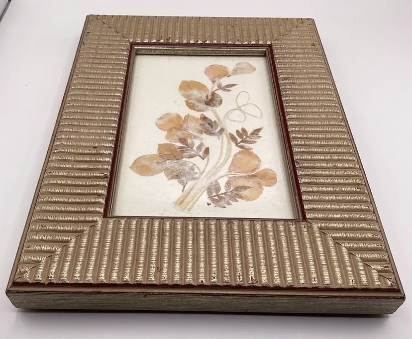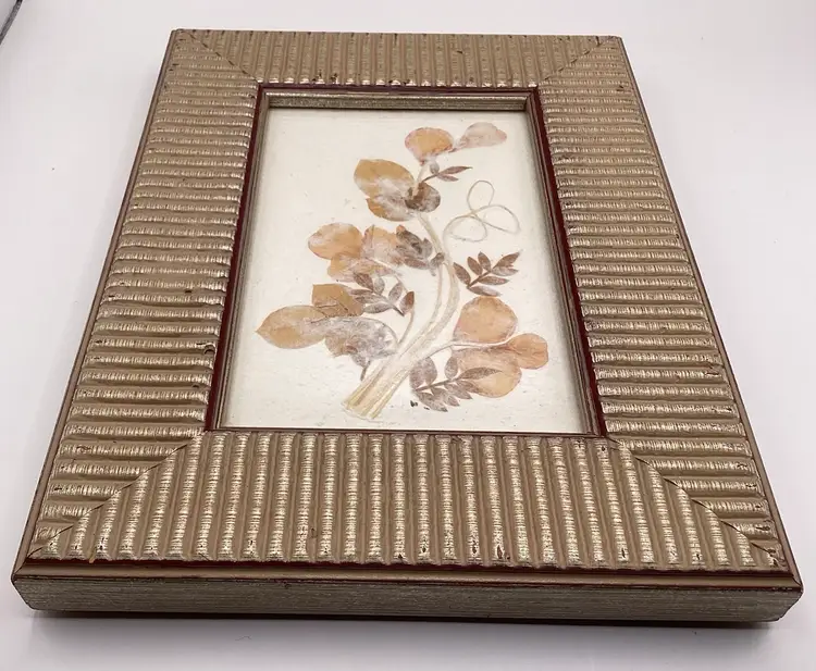 Identifier: Foil sticker on back from frame shop Features: Brushed ribbed brownish gold frame with hints of burgundy Pattern/Design: Dried flowers Color: Hues of browns and gold Measurements: Height - 8 & 3/4” Width - 7”
