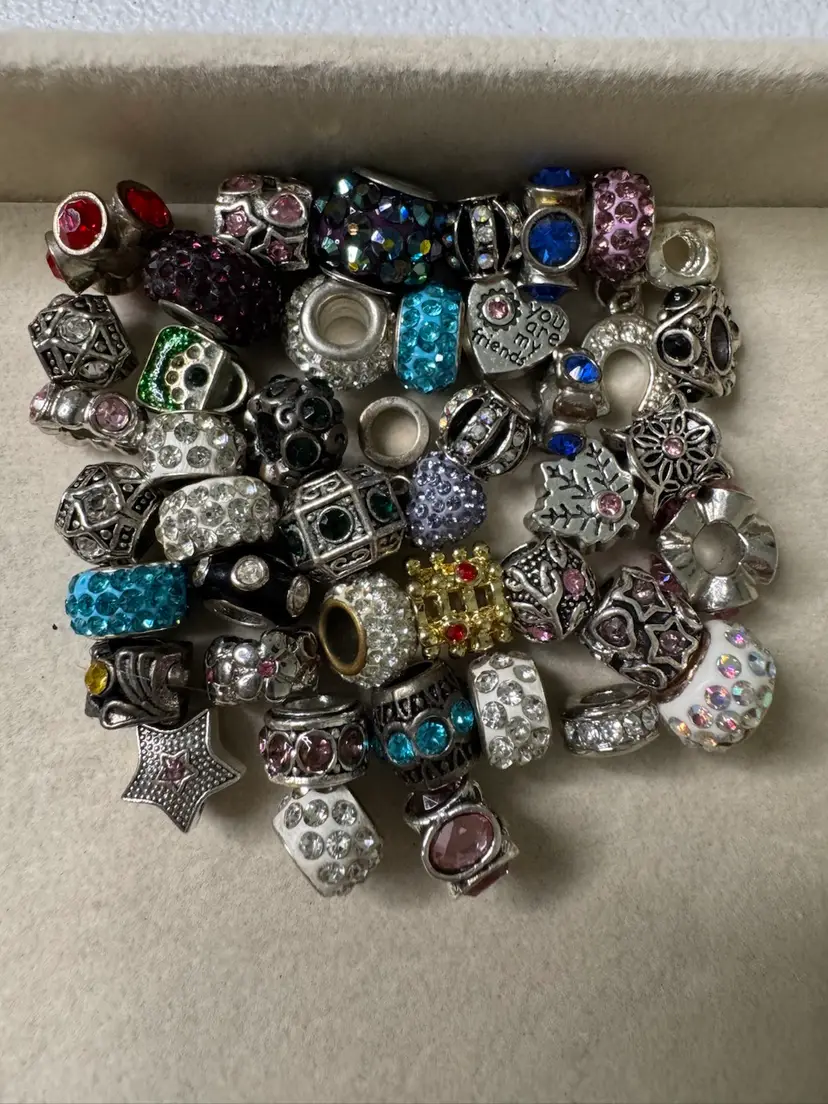 This is a great collection of 42 Silver Tone Rhinestone & Crystal Bracelet Slider Beads. All in great condition. All have the rhinestones. Measure approximately 1/2 inch each.