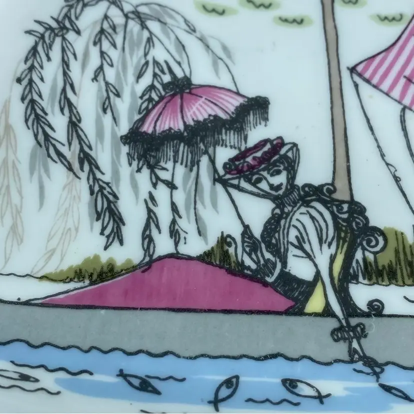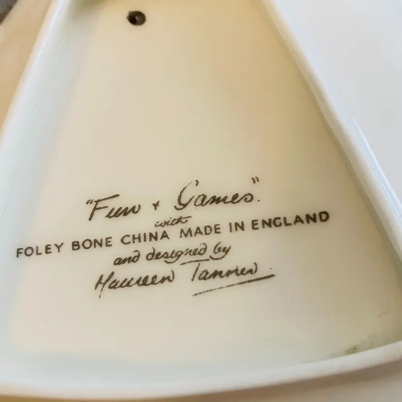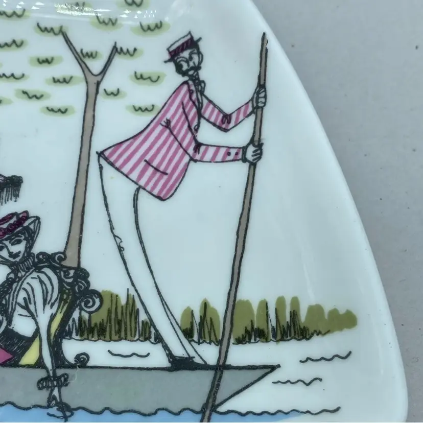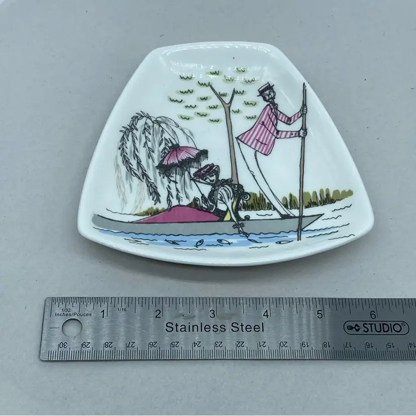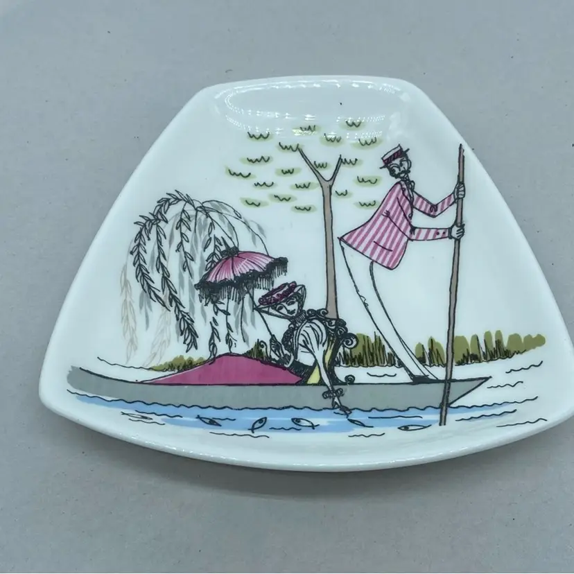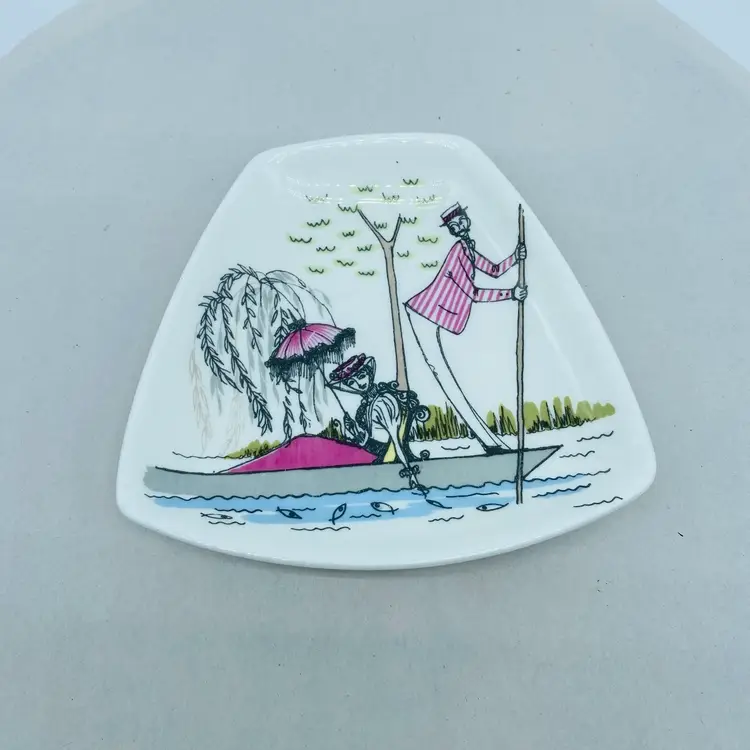Illustrated with couple on river, Bone China Pin Dish or Trinket Tray made in England. Entitled Fun and Games and designed by Artist Maureen Tanmer for Foley Approx 6 x 5 inches No chips or cracks