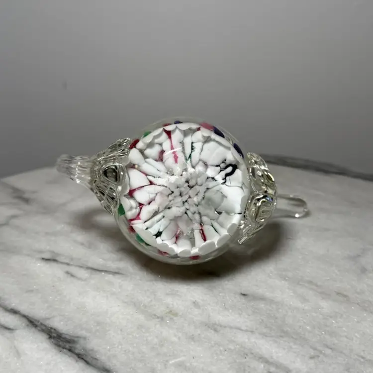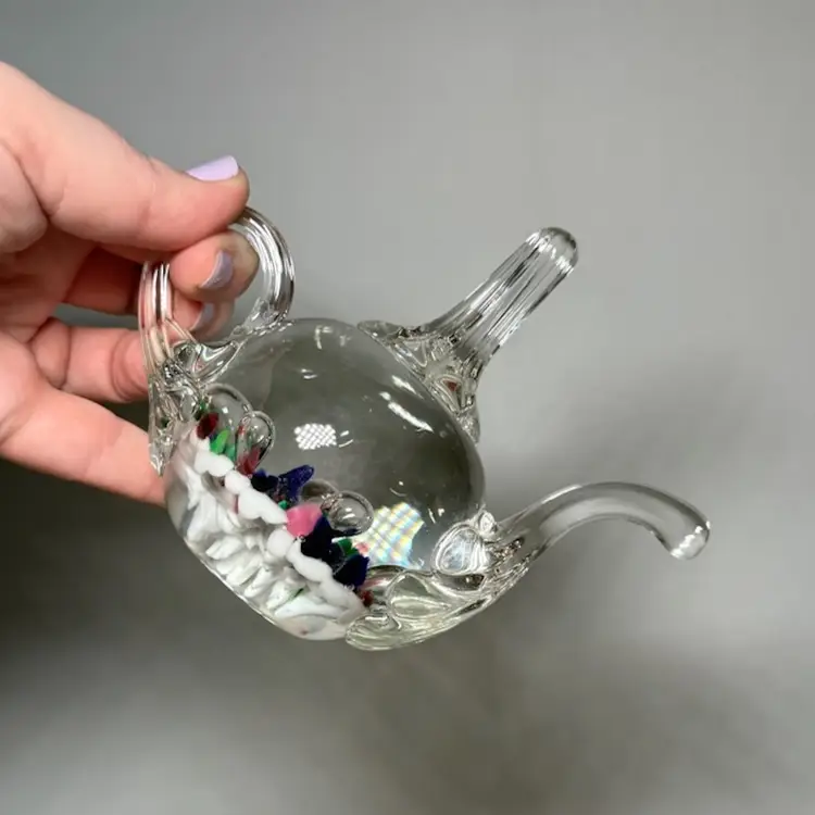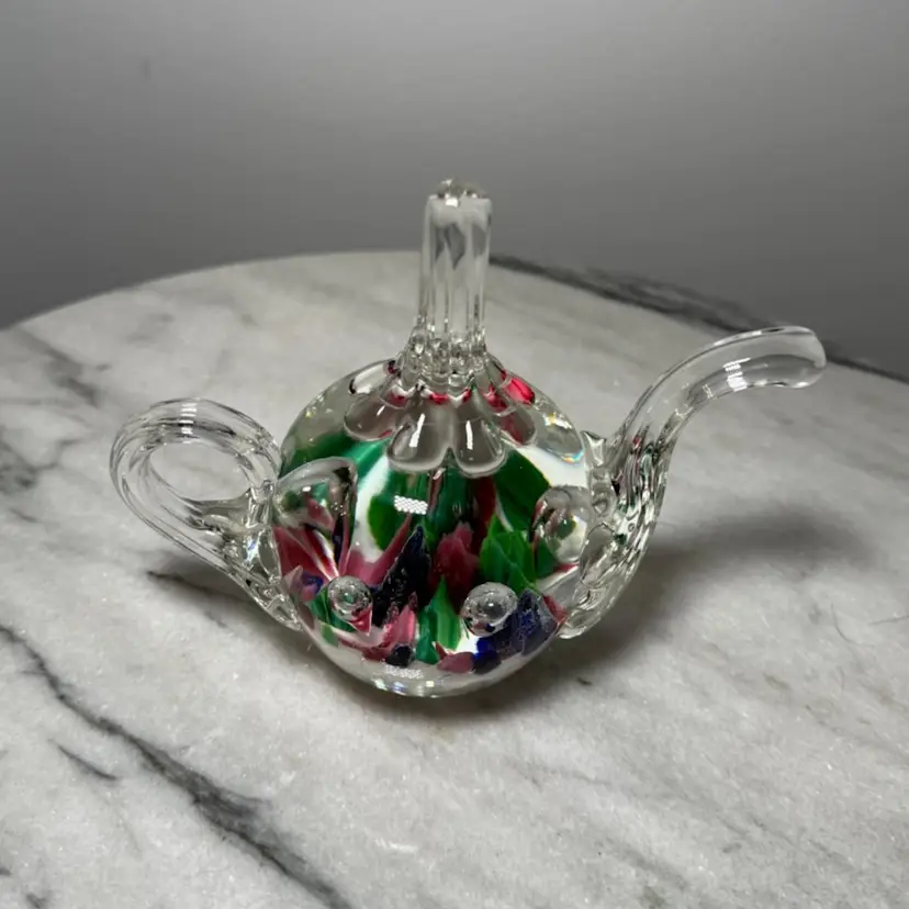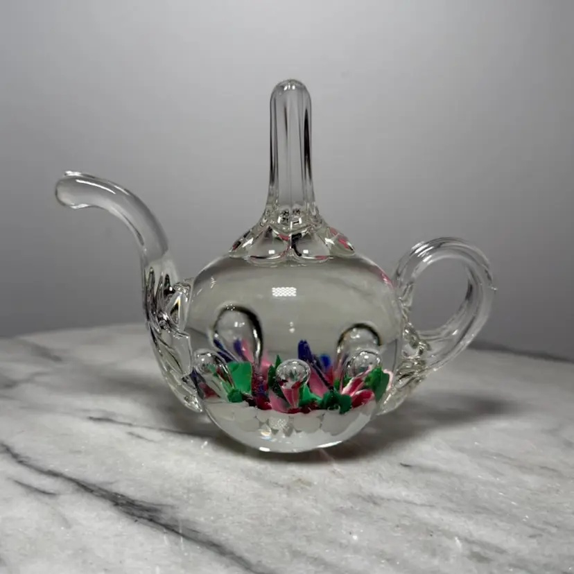 A glass teapot paperweight with a pretty floral design inside. It is about 4.25 in tall and 5.25in wide. There is a small chip on the inside of the handle- will show during the live. A great piece to use as a ring holder or just some fun decor.