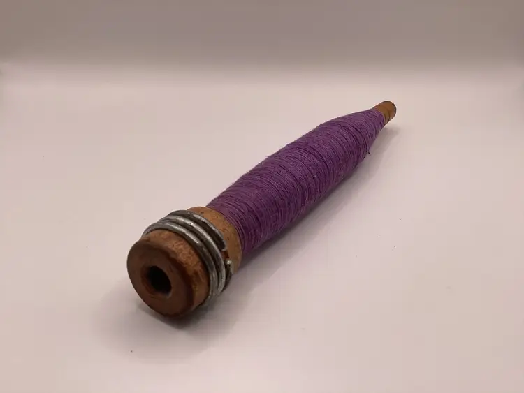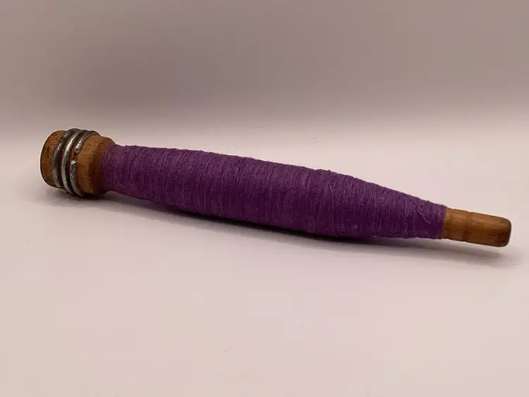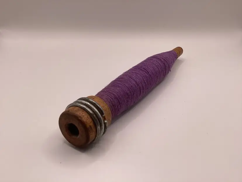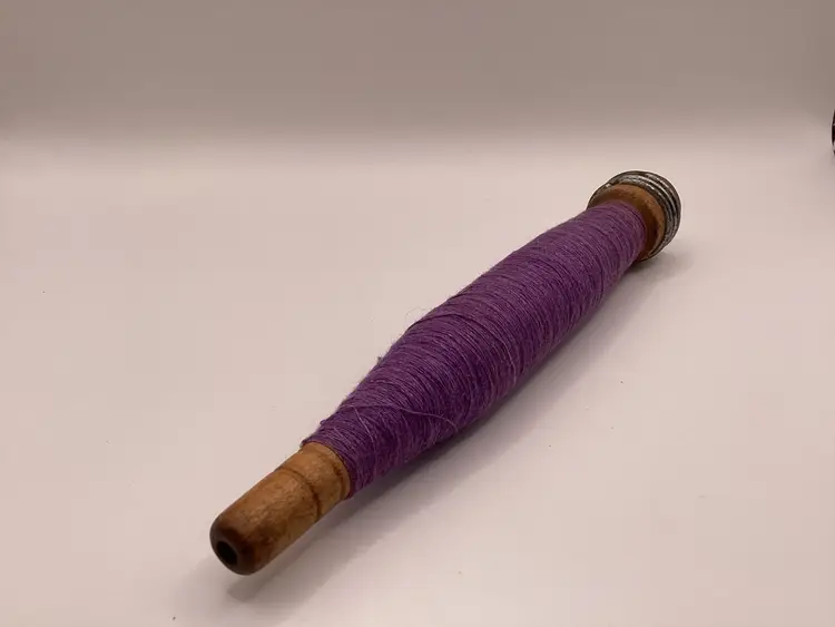 Features: Metal rings still present Material: Wood / Metal Color: Purple thread Measurements: Height - 8” Width - 1”