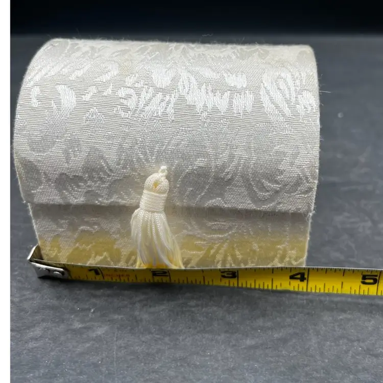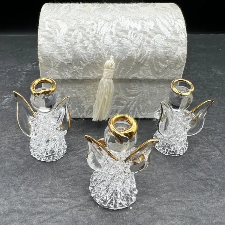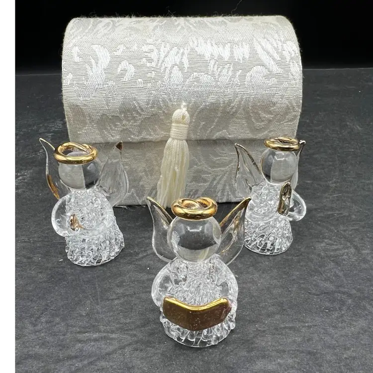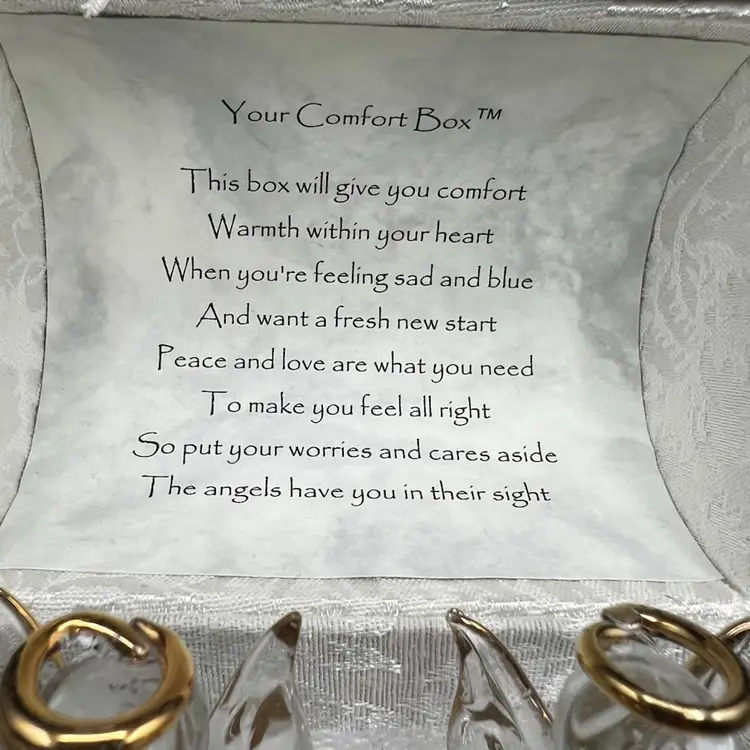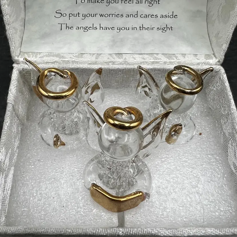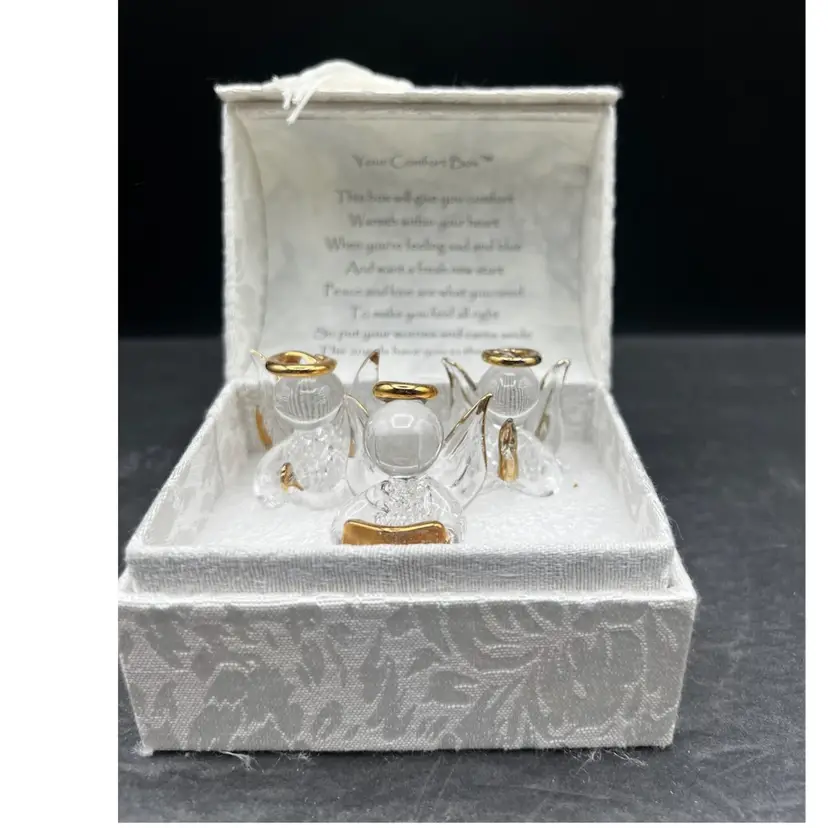 Vintage Angel Worry Box, Comfort Box With 3 Blown Glass Angels In White Brocade Chest With Tassel And Sentimental Poem Inside Of Lid In very good condition Each angel is just under 2” tall The chest measures 4 1/4” tall x 4” x 3”