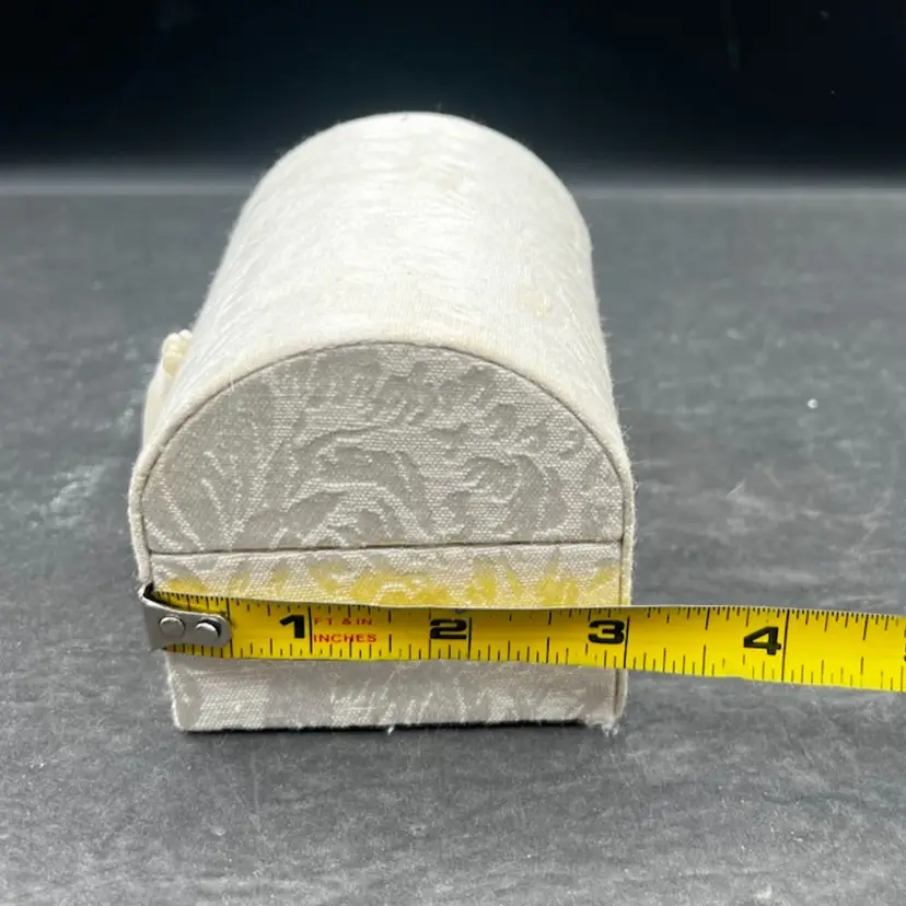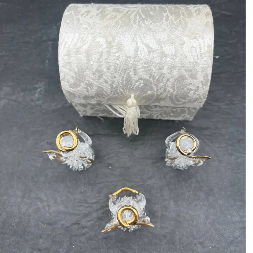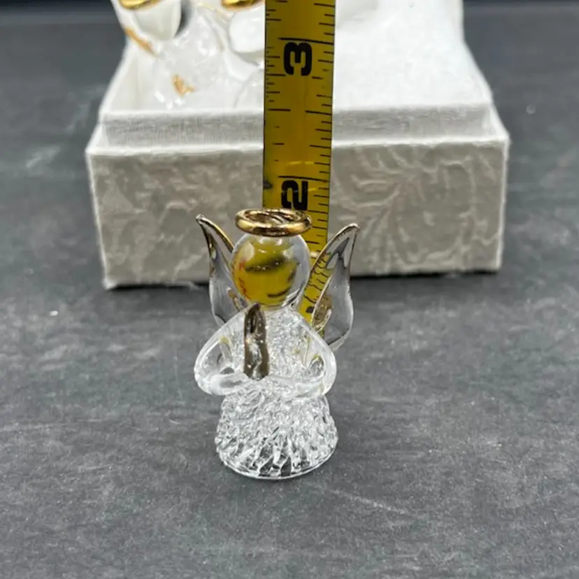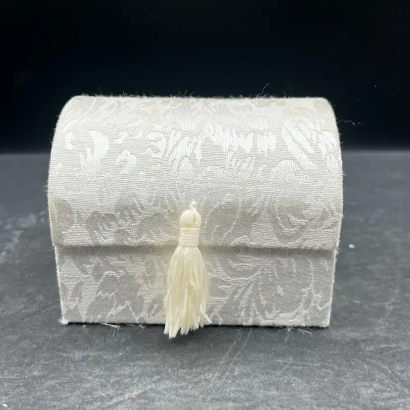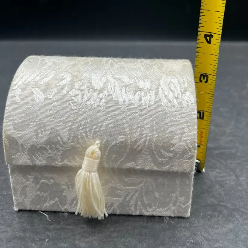 Vintage Angel Worry Box, Comfort Box With 3 Blown Glass Angels In White Brocade Chest With Tassel And Sentimental Poem Inside Of Lid In very good condition Each angel is just under 2” tall The chest measures 4 1/4” tall x 4” x 3”